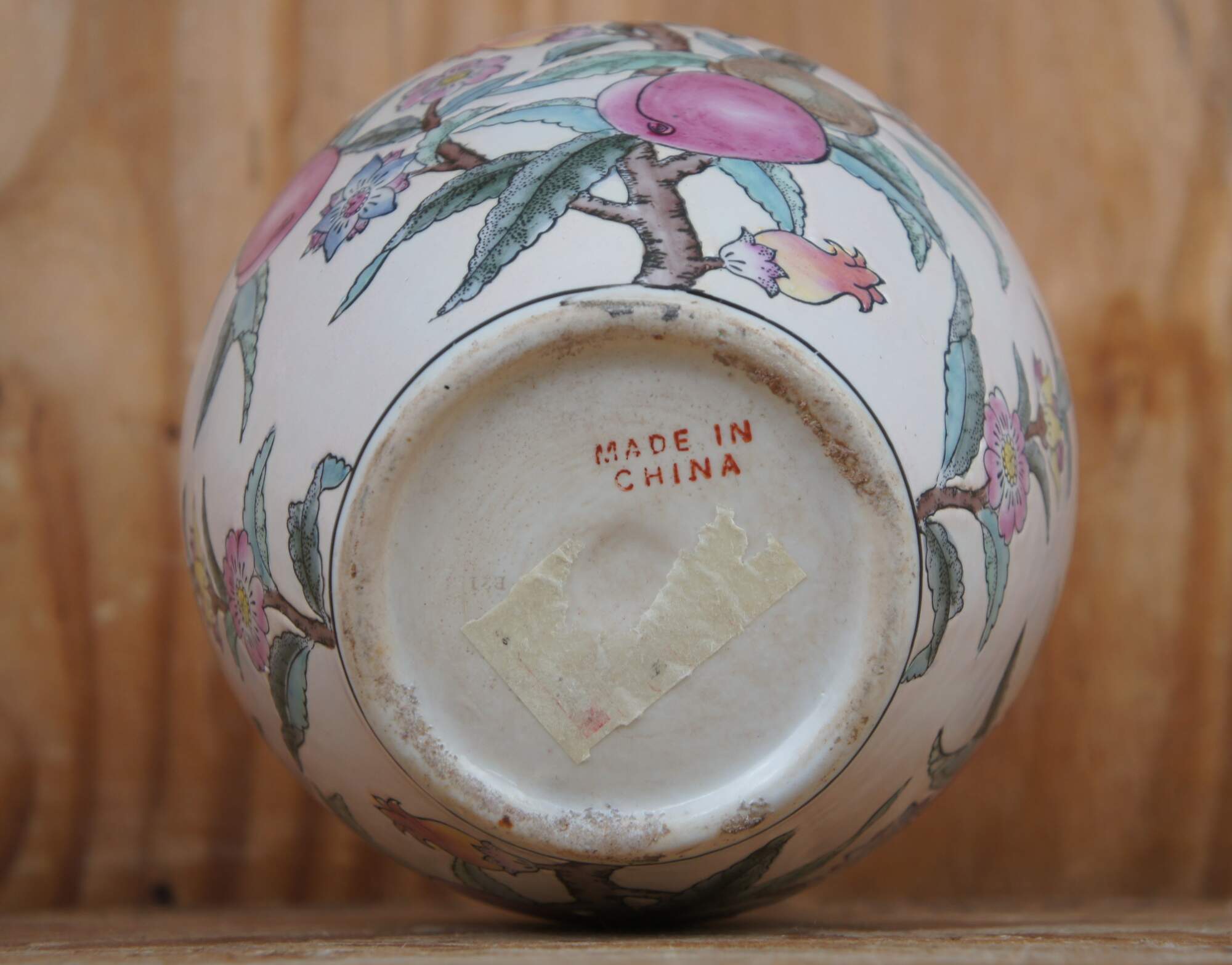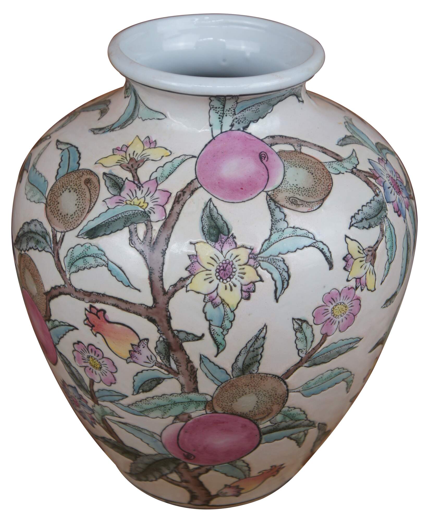 Vintage WBI Chinese enameled porcelain vase or urn featuring a colorful fruit and flowering tree motif.