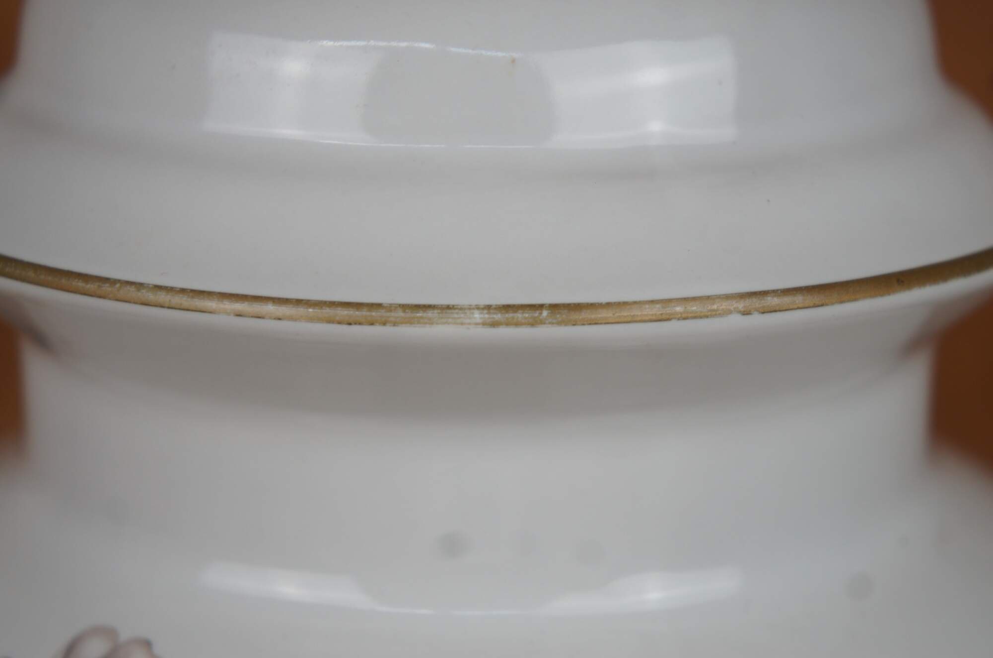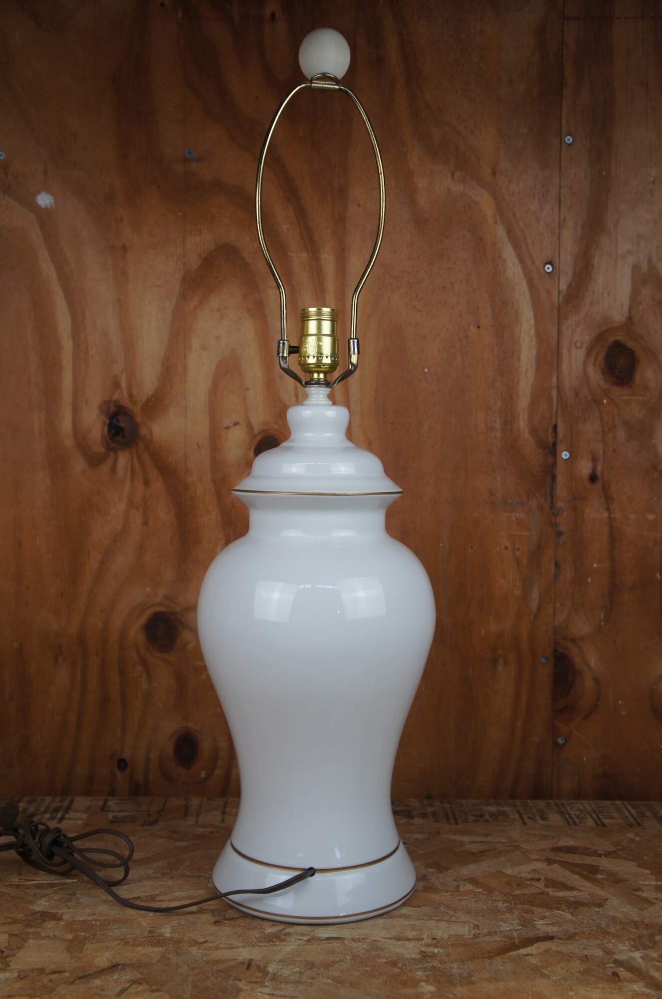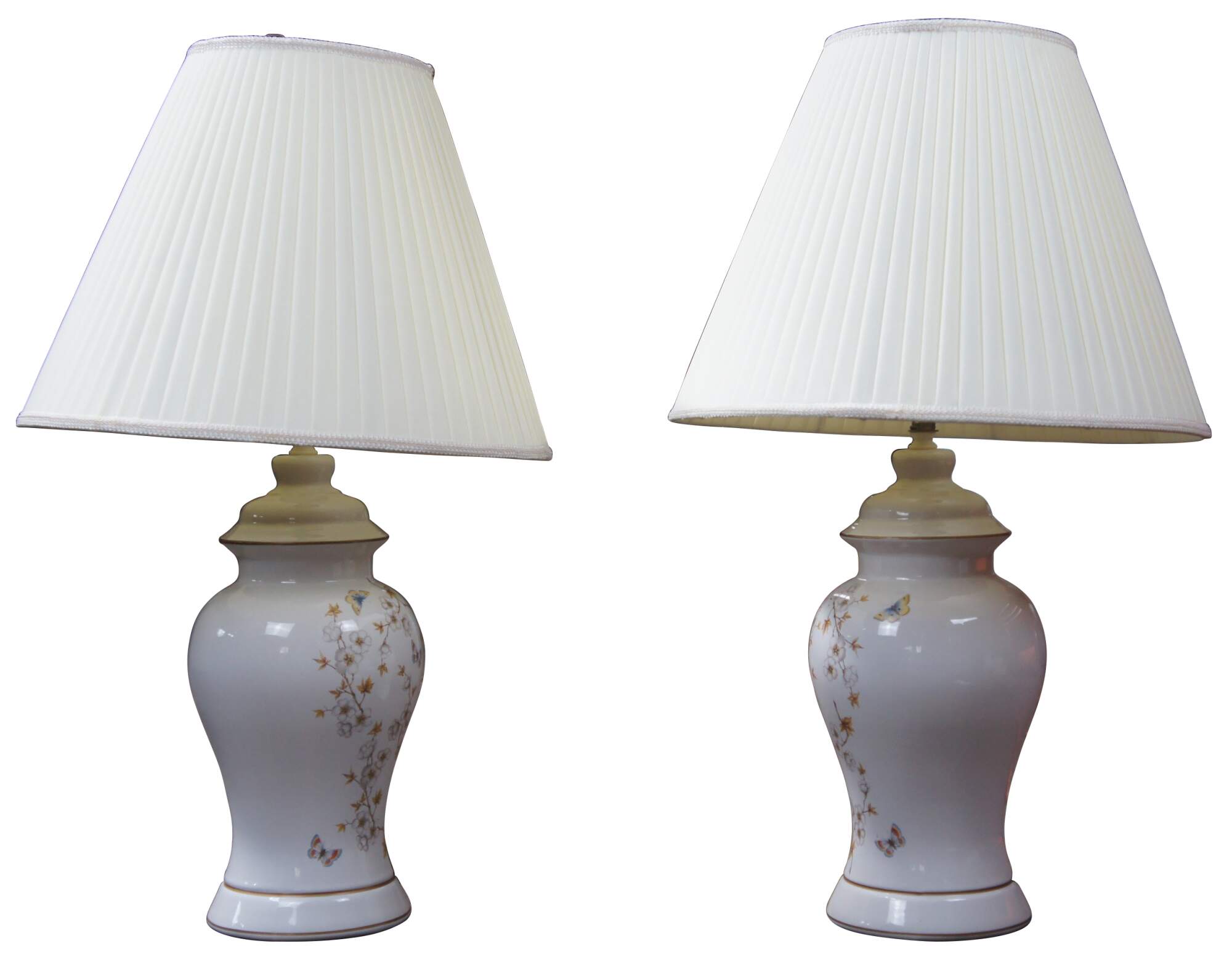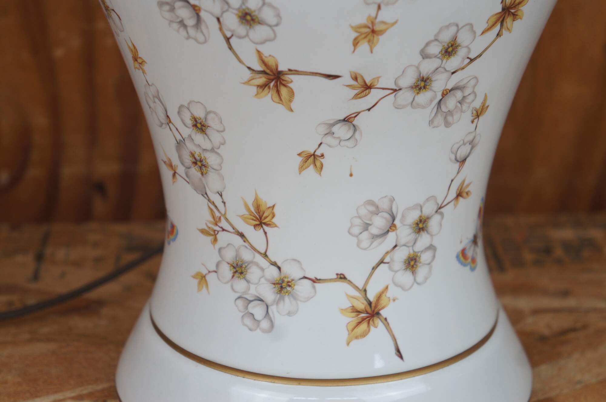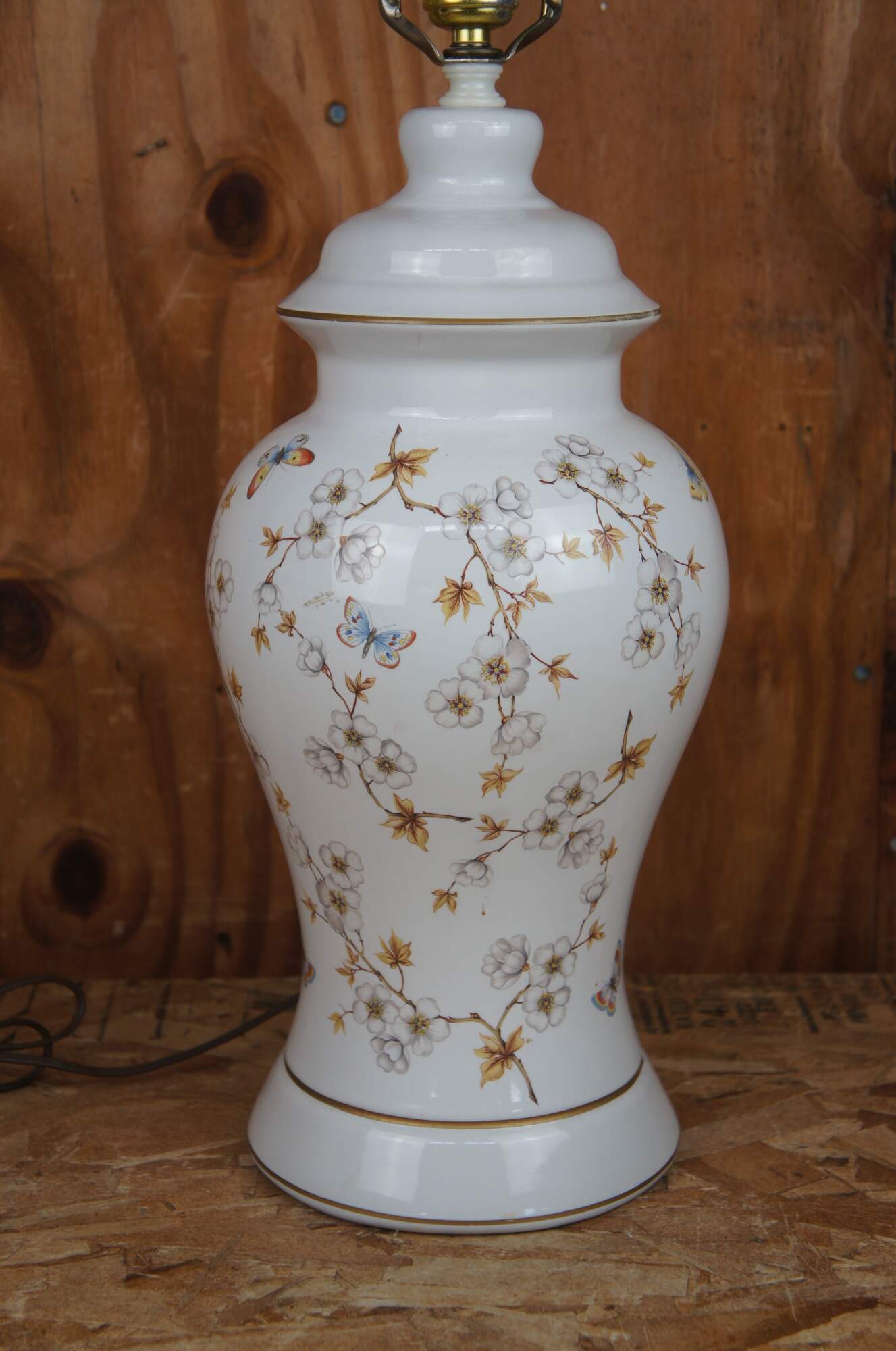 Two vintage Chinese porcelain mantel urns or vase lamps featuring a floral dogwood and butterfly motif on a white base with gold accents.