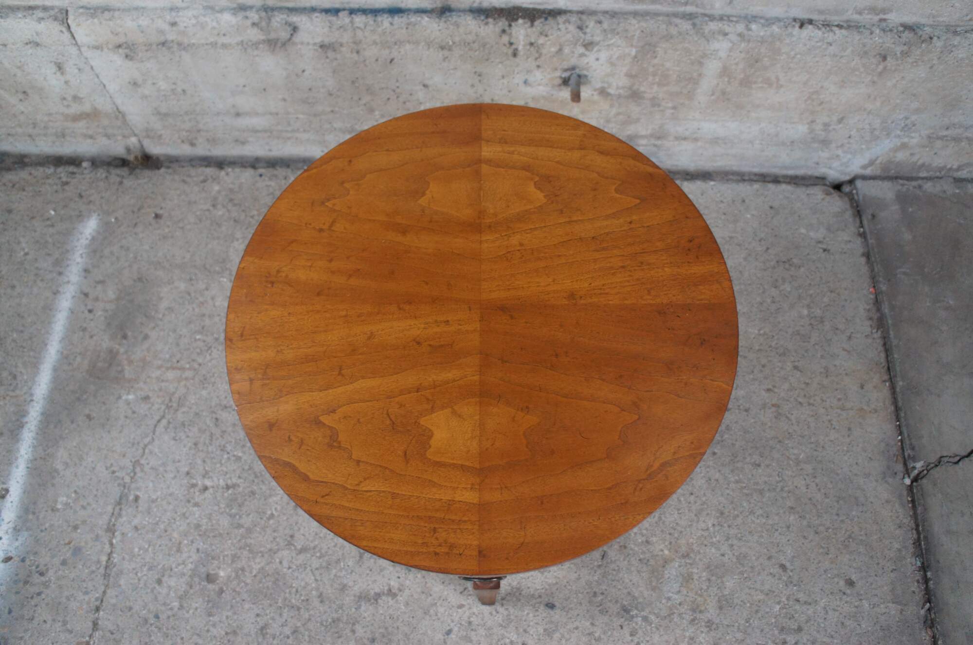 Mid Century Drexel Heritage Grand Tour Accent Table. Drawing inspiration from French Empire and British Campaign Styling. A round form made from walnut with a matchbook top, brass ring knocker accents and faux bamboo columns. Circa 1965, 23-546-41, 6-65