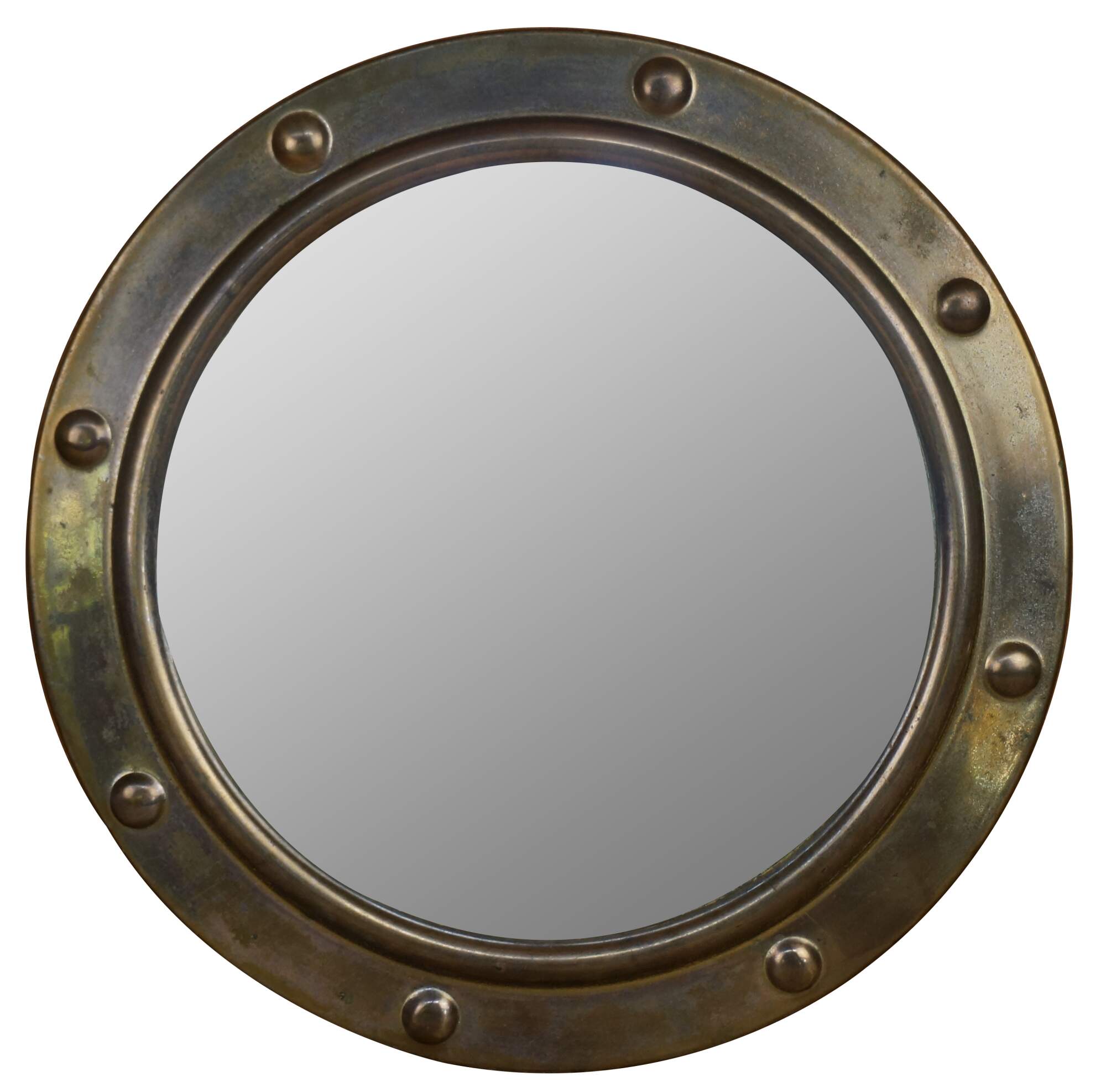 Mid century English Regency convex brass mirror featuring a nutical theme in the shape of a ship port hole.