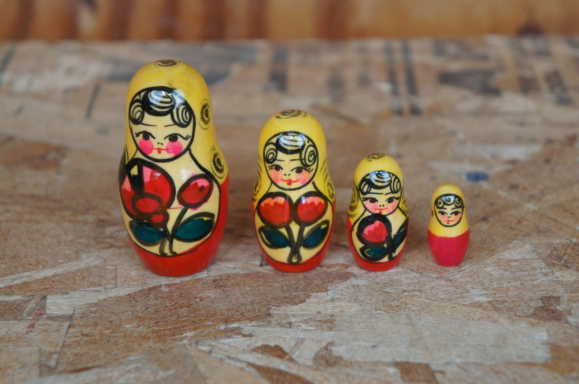 Two vintage USSR Matryoshka nesting puzzle dolls featuring hand painted details.