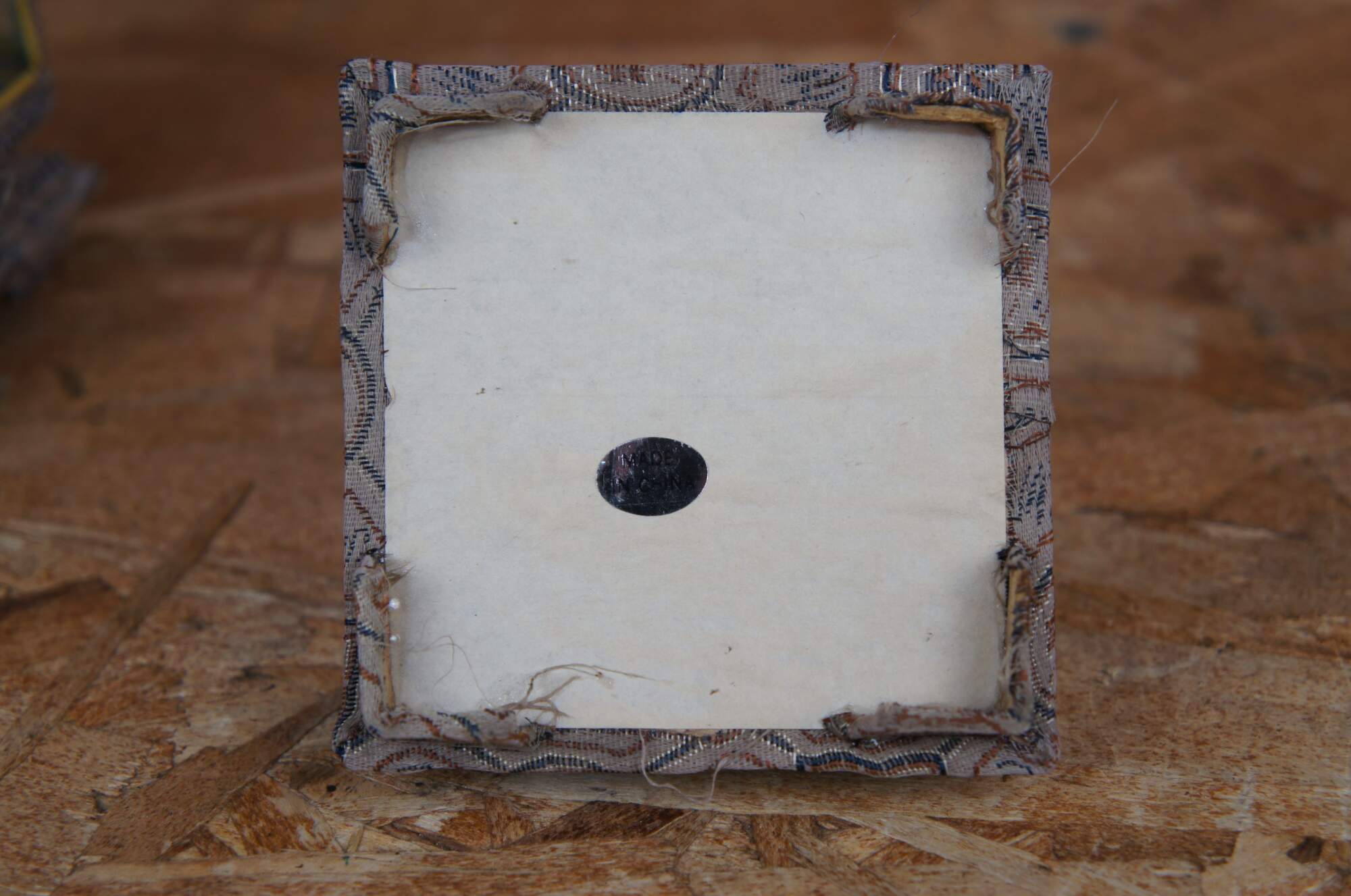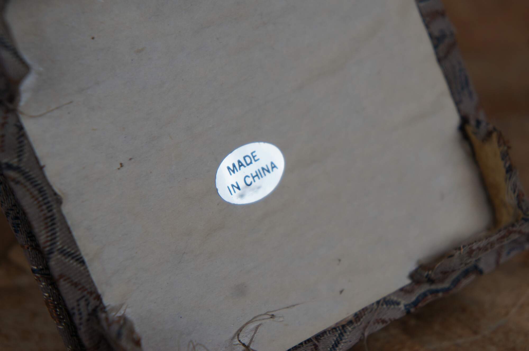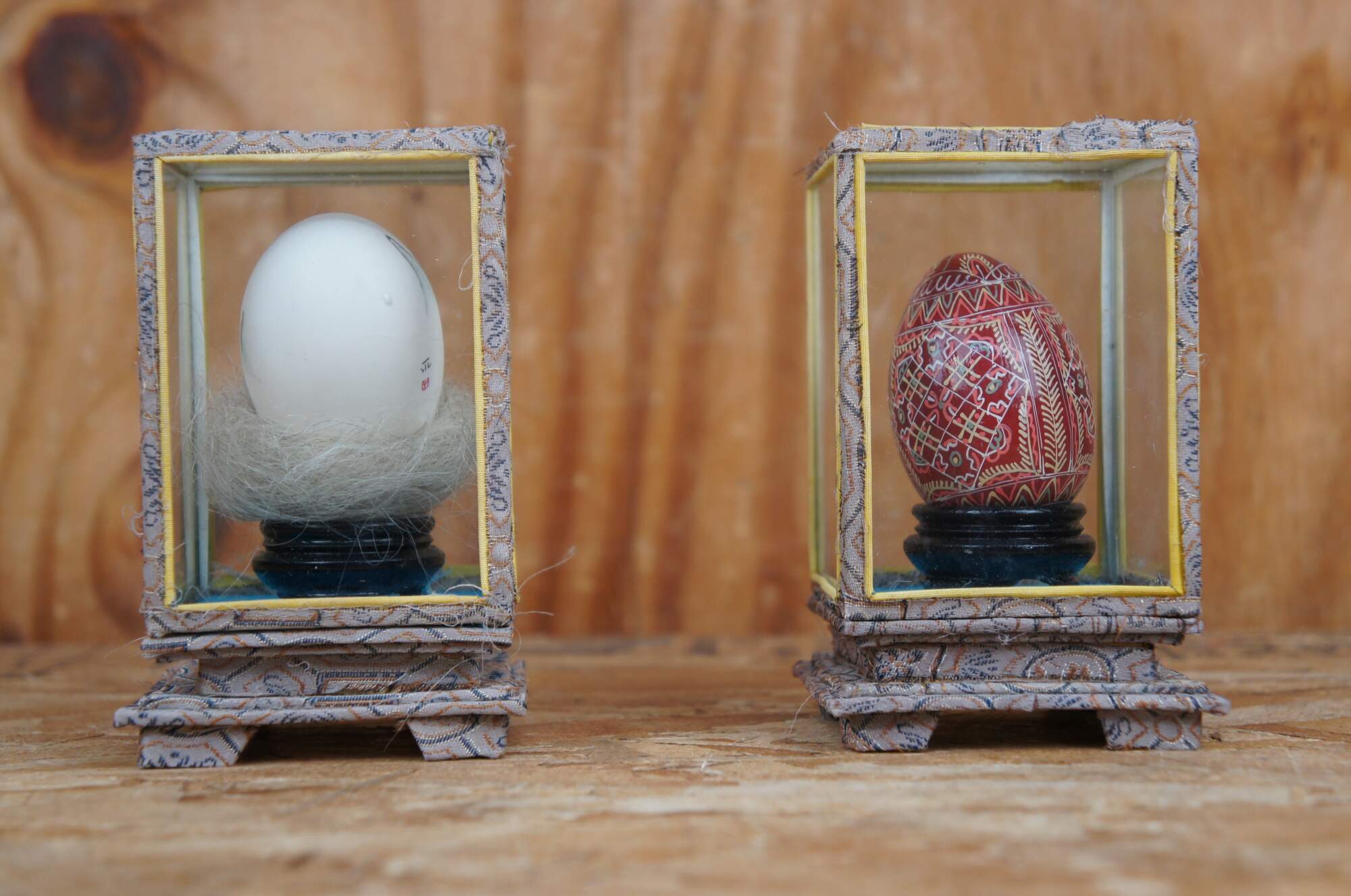 Two Chinese decorative Easter eggs in display cases with brocade fabric, one depicting hand painted lion on a nest and the other an enamel floral finish.