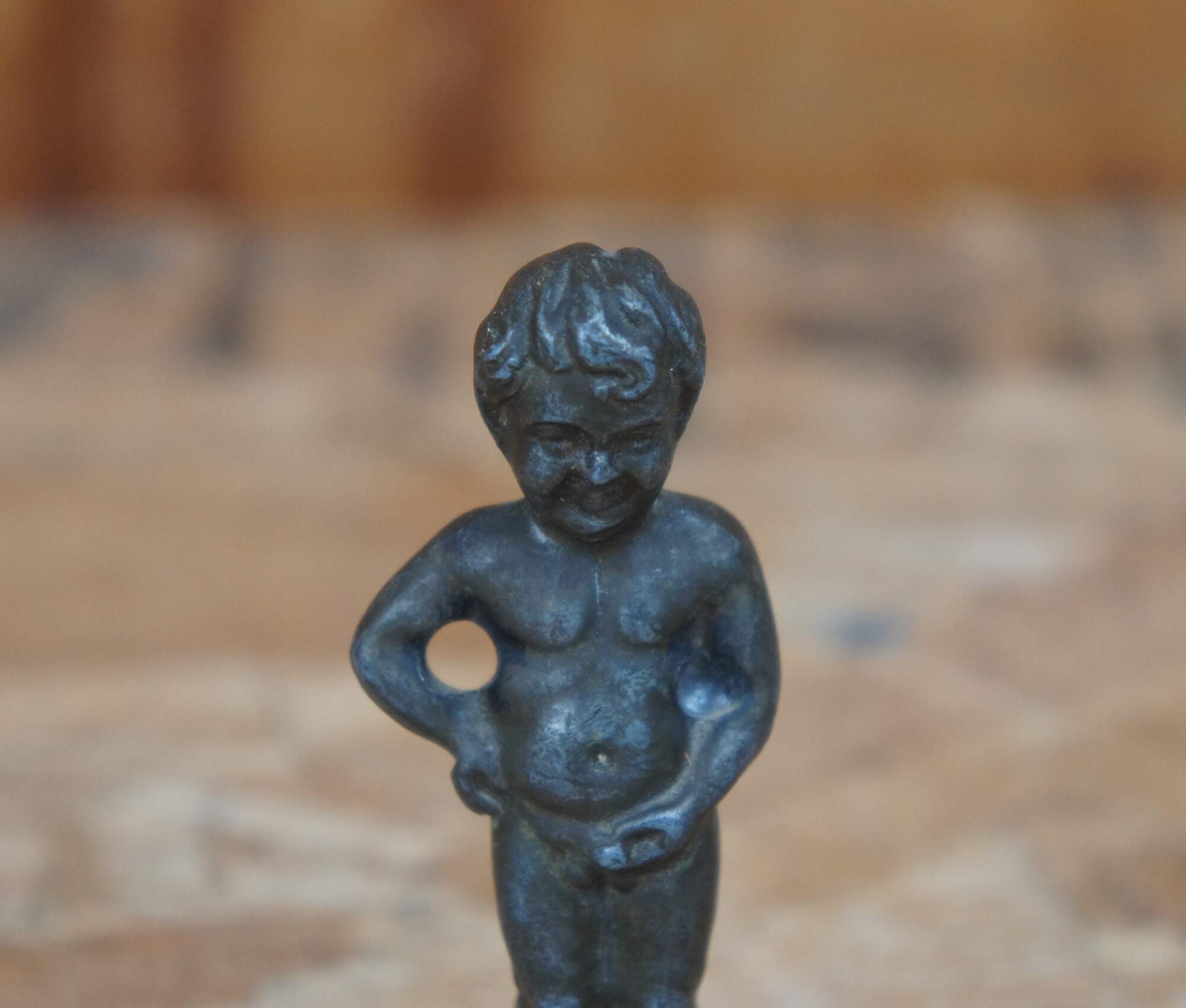 Vintage miniature metal Bruxelles peeing nude boy / cherub statue, figurine, paperweight or tobacco tamper. Made in Belgium.