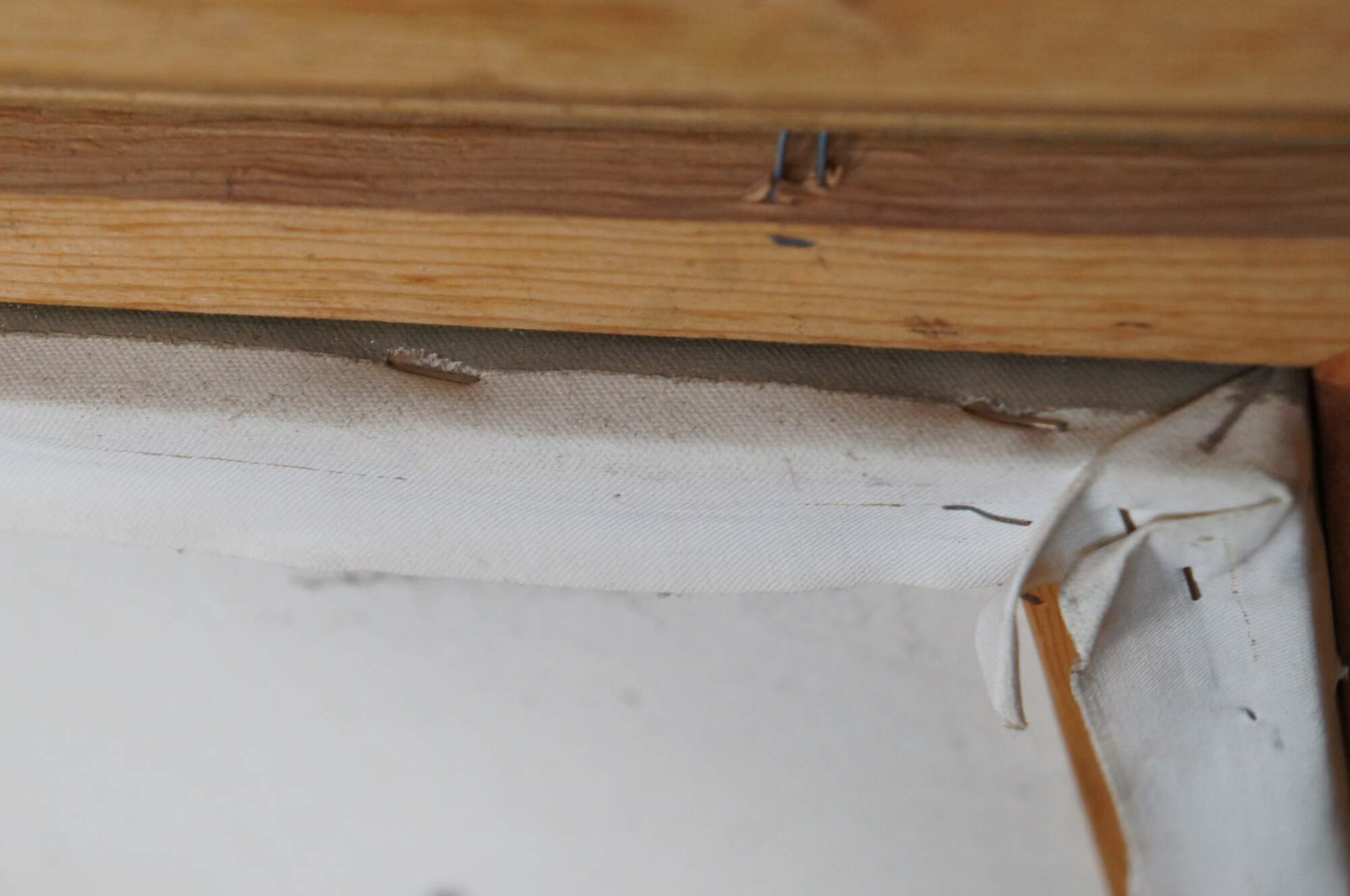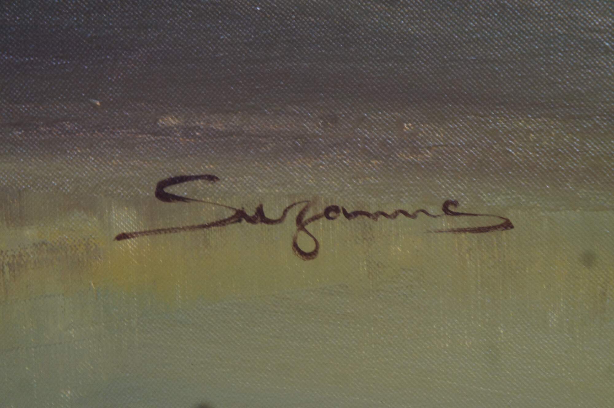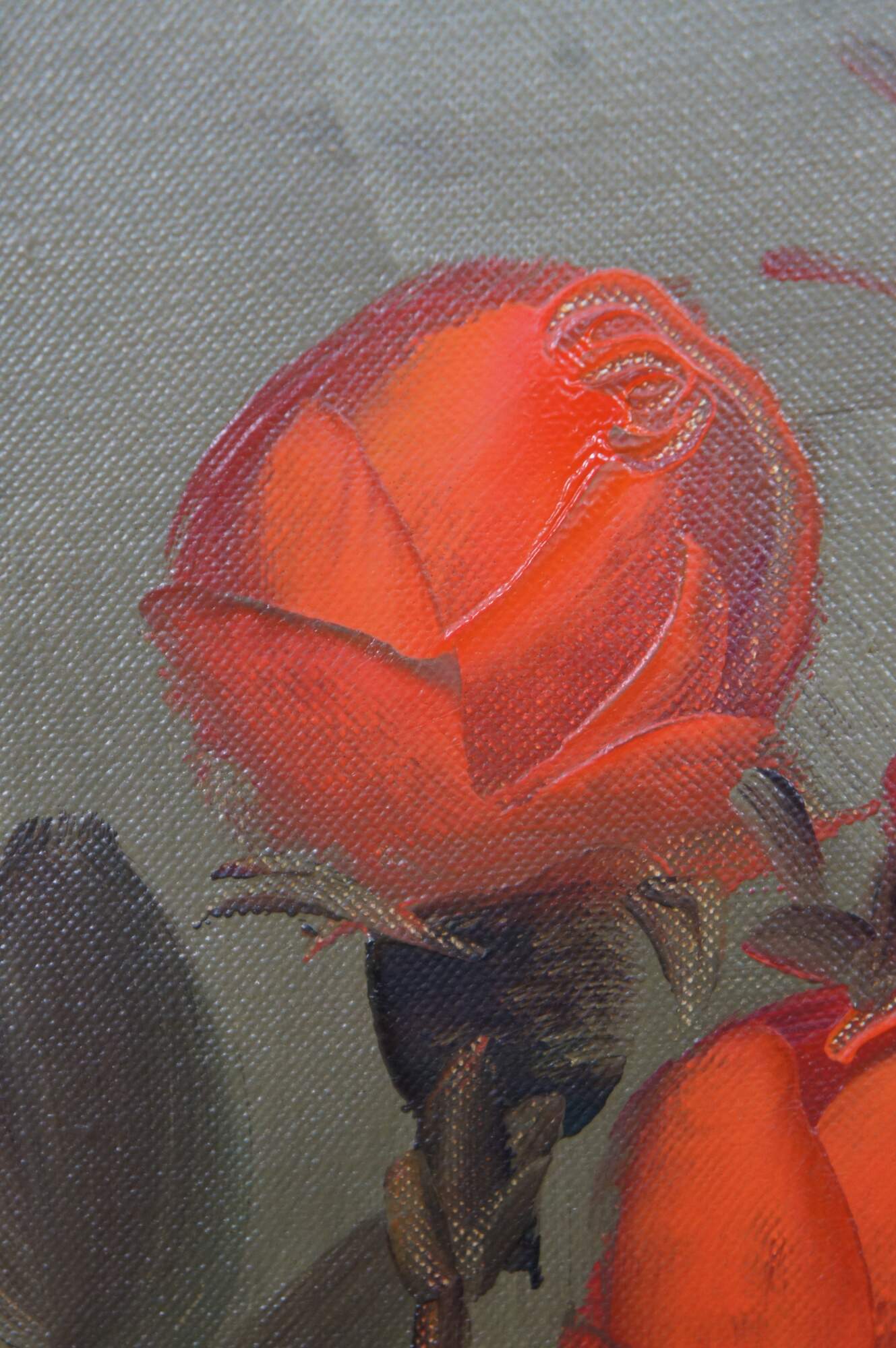 Vintage still life oil painting on canvas of a bouquet of orange roses in a light blue vase. Signed by artist Suzanne in lower left.