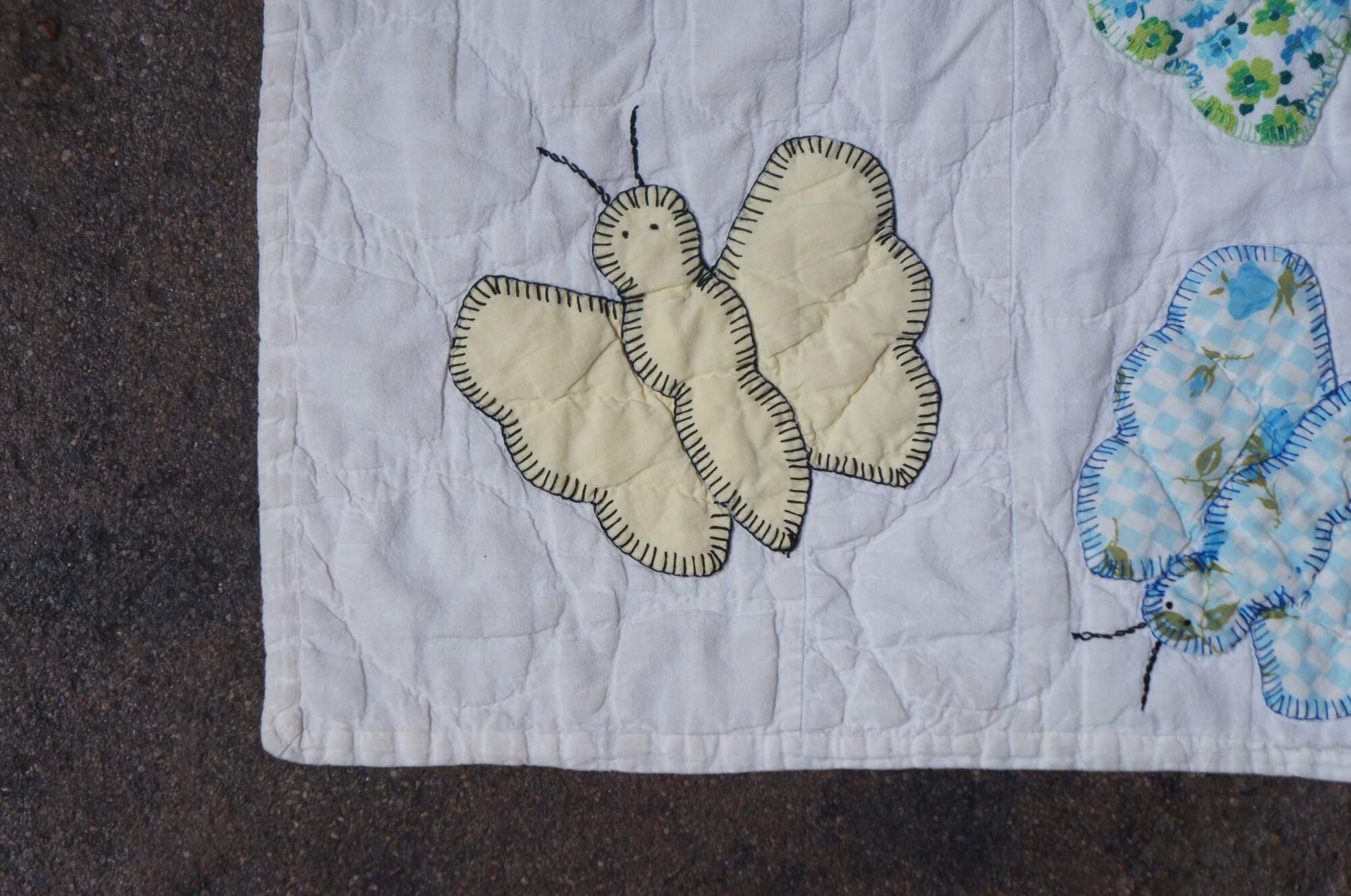 Vintage handmade folk art patchwork quilt in cotton with many colorful floral appliqued butterflies.