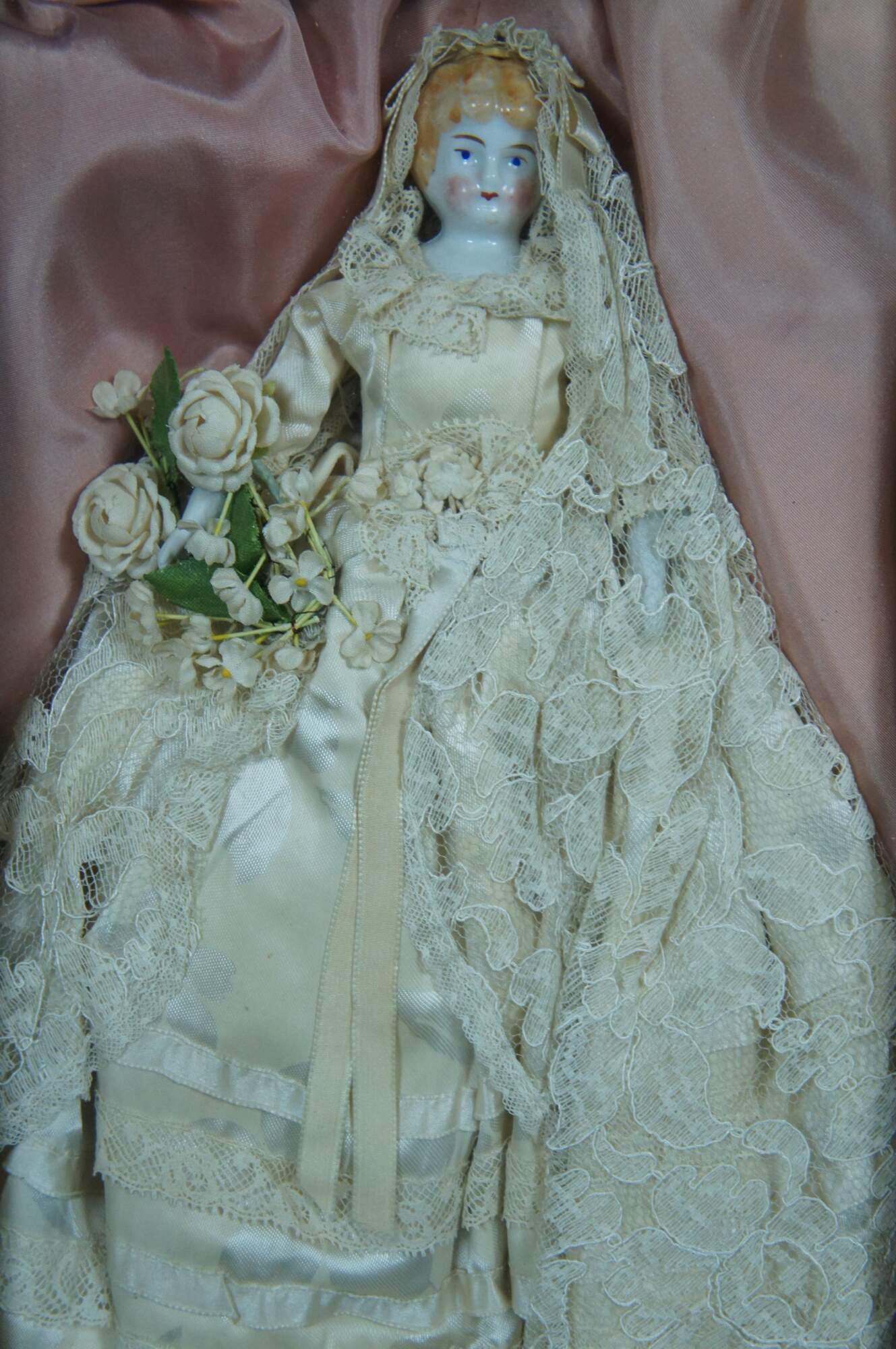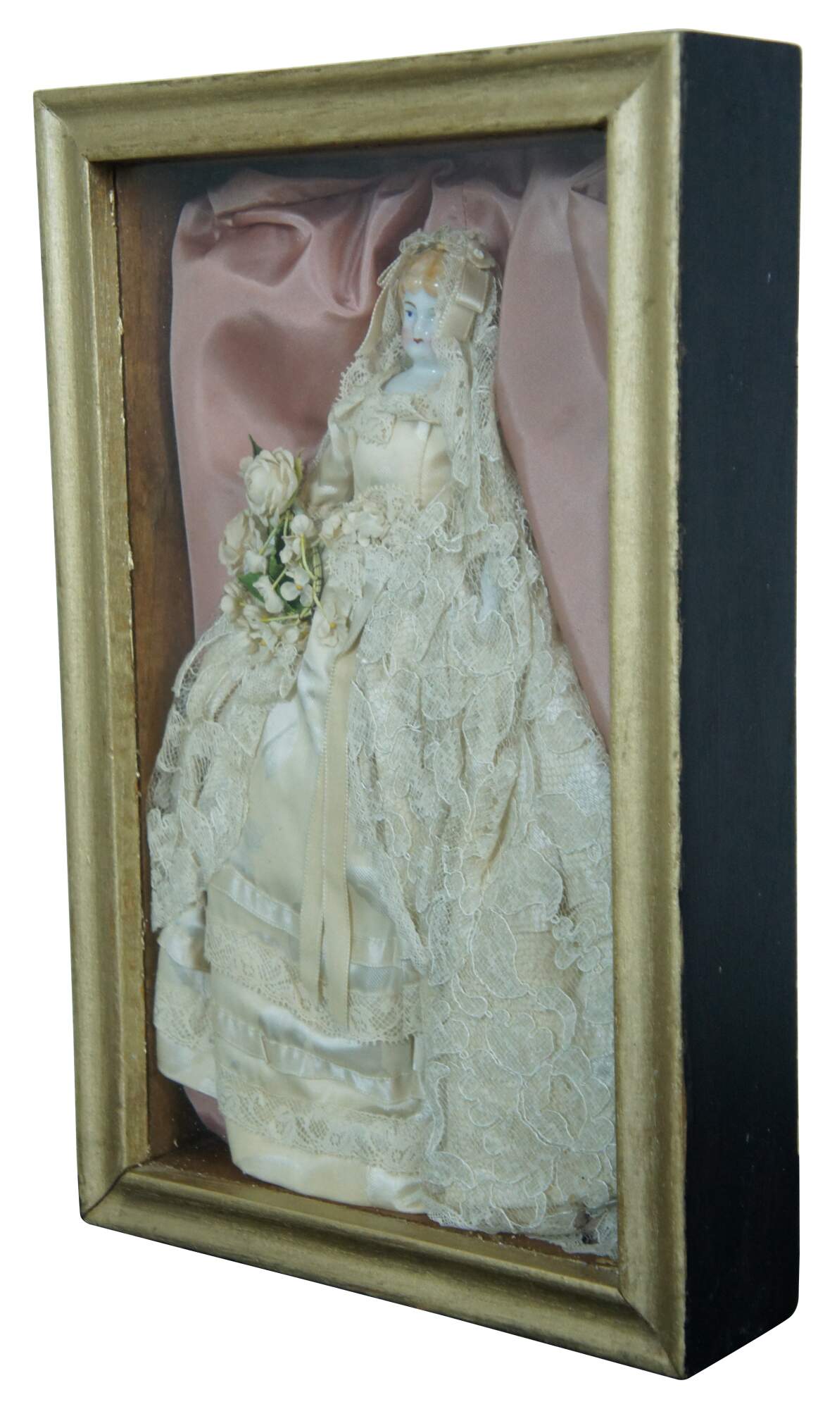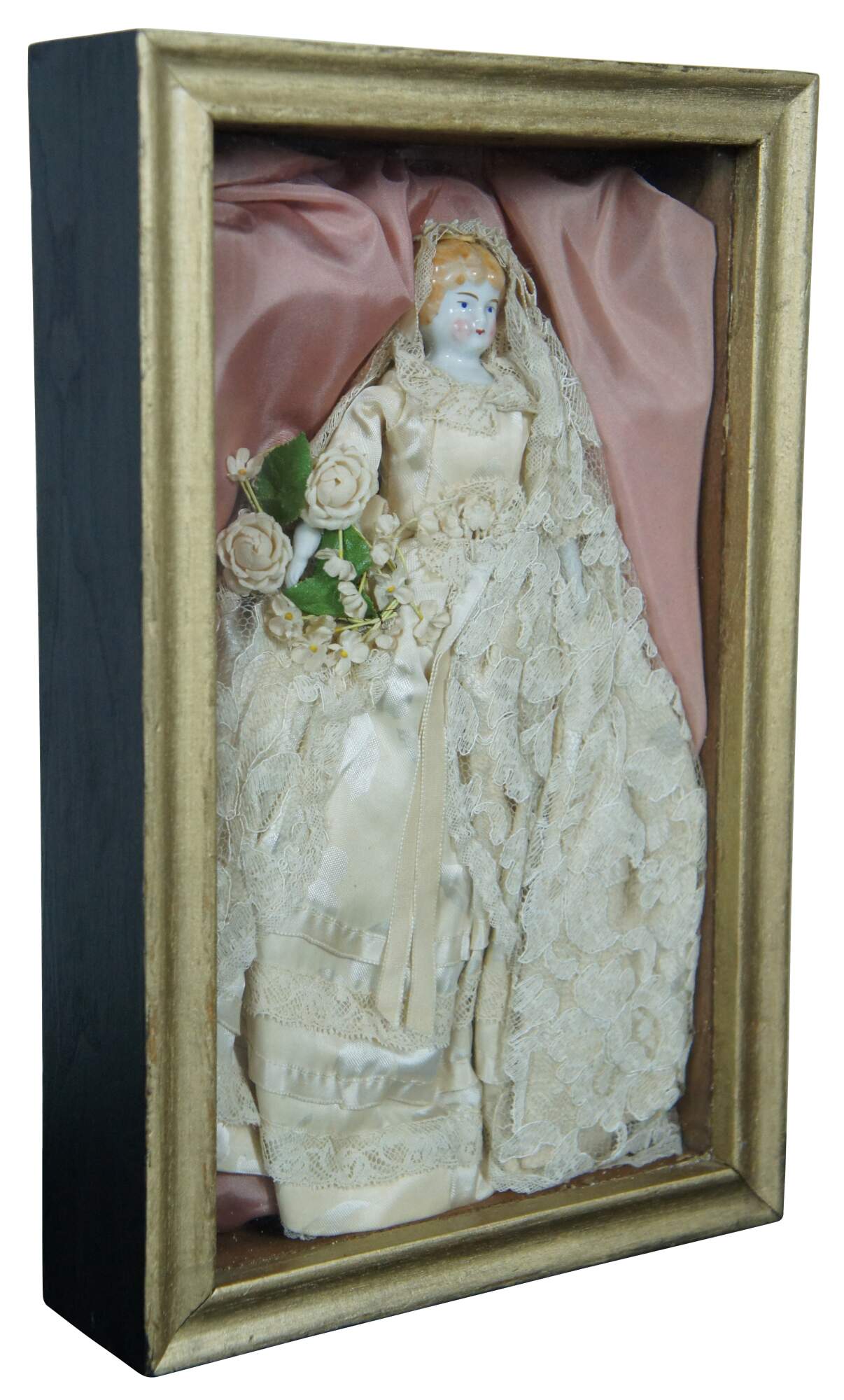 Antique mid 19th century molded head porcelain doll with blonde hair and blue eyes, dressed in a lovely floral wedding gown with lace over-skirt and bouquet of flowers, displayed in a pink padded shadowbox with gilded frame.