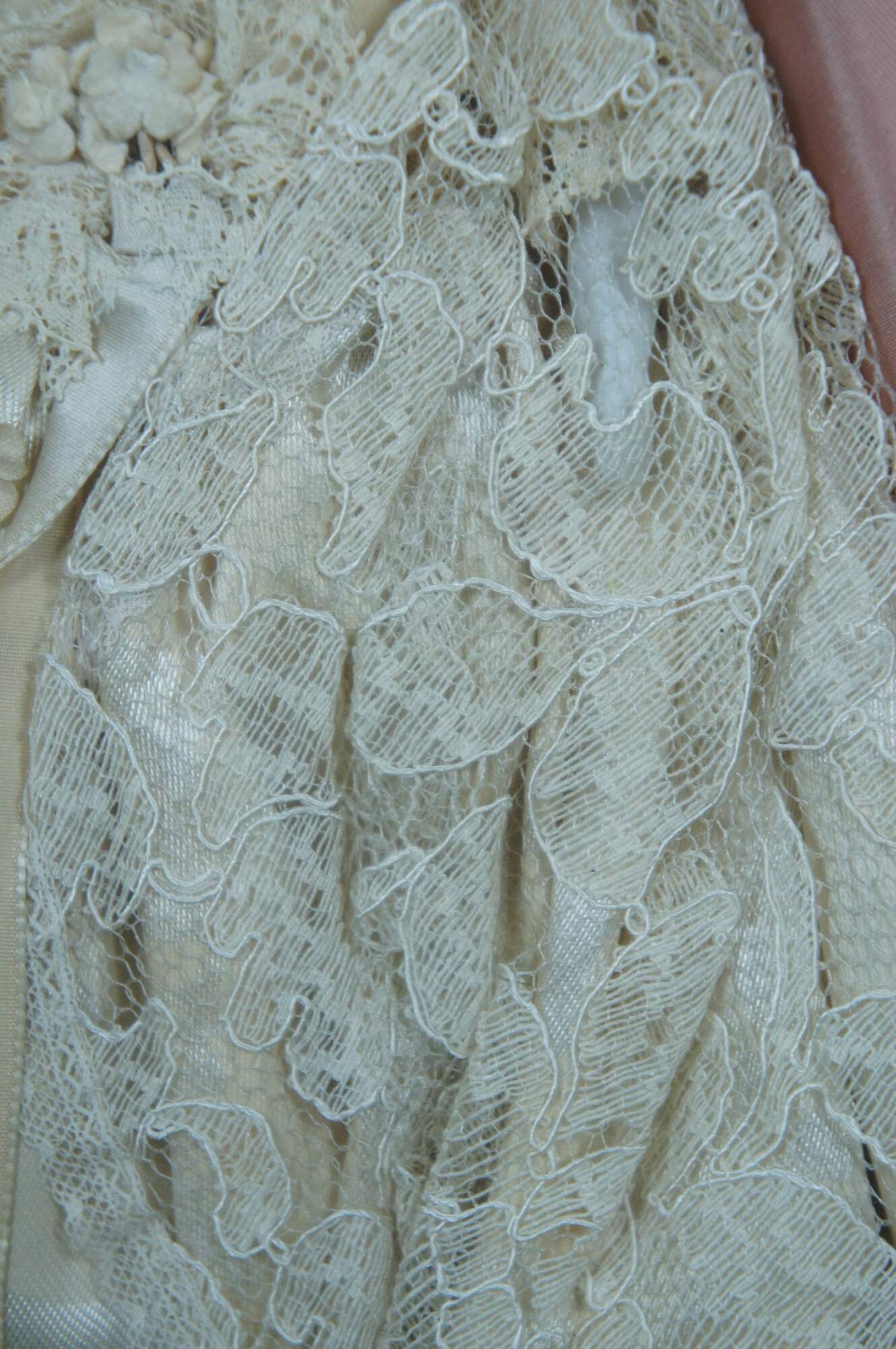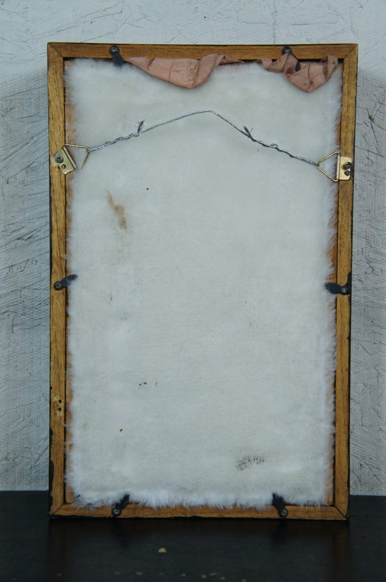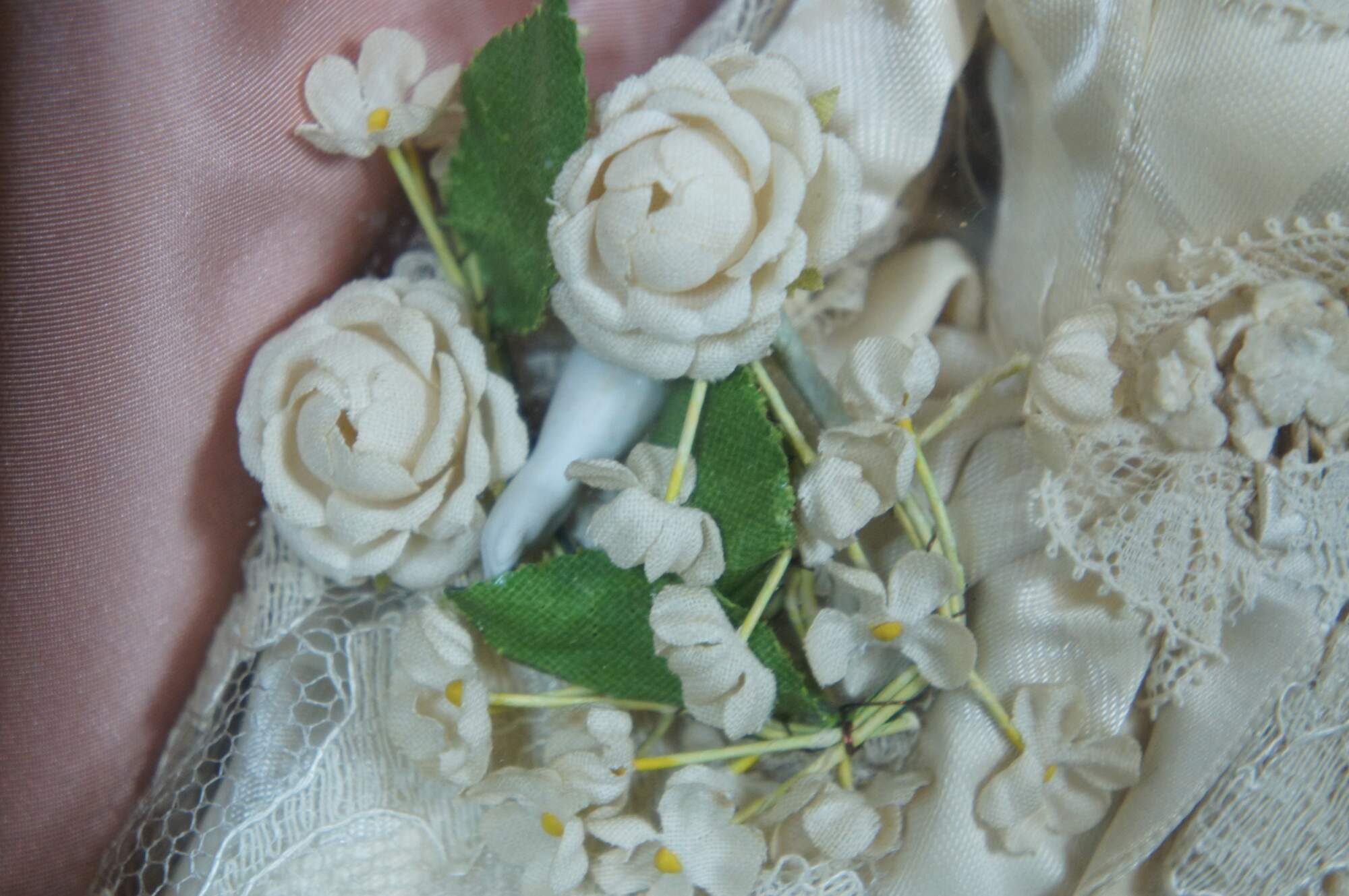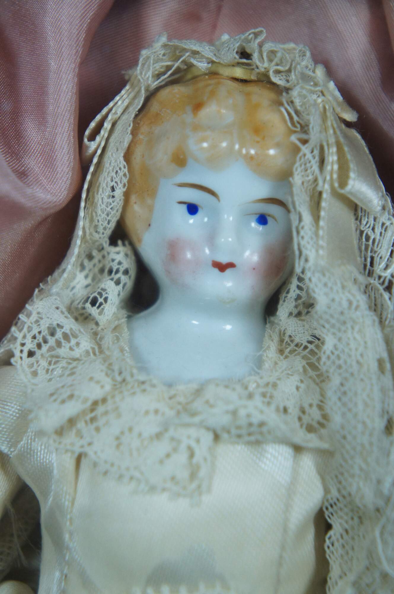 Antique mid 19th century molded head porcelain doll with blonde hair and blue eyes, dressed in a lovely floral wedding gown with lace over-skirt and bouquet of flowers, displayed in a pink padded shadowbox with gilded frame.