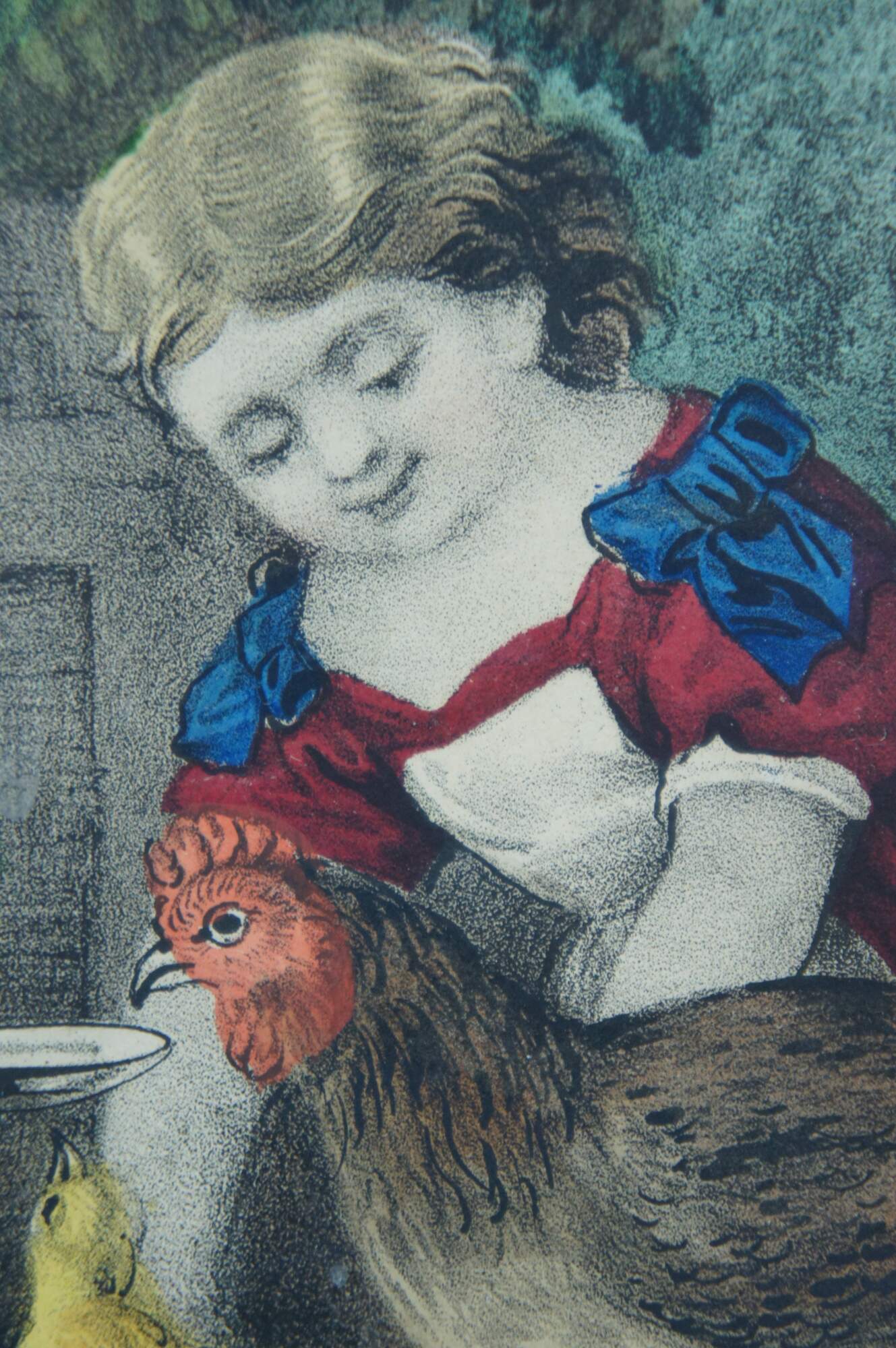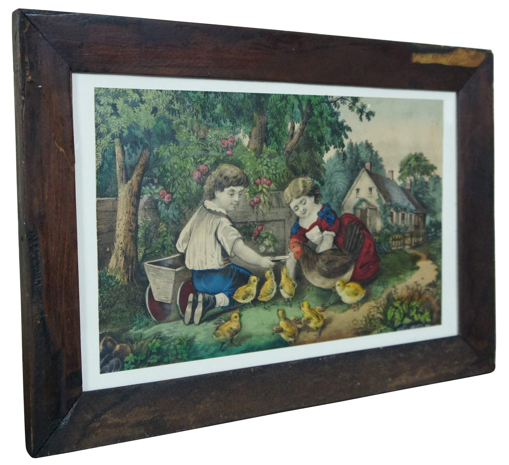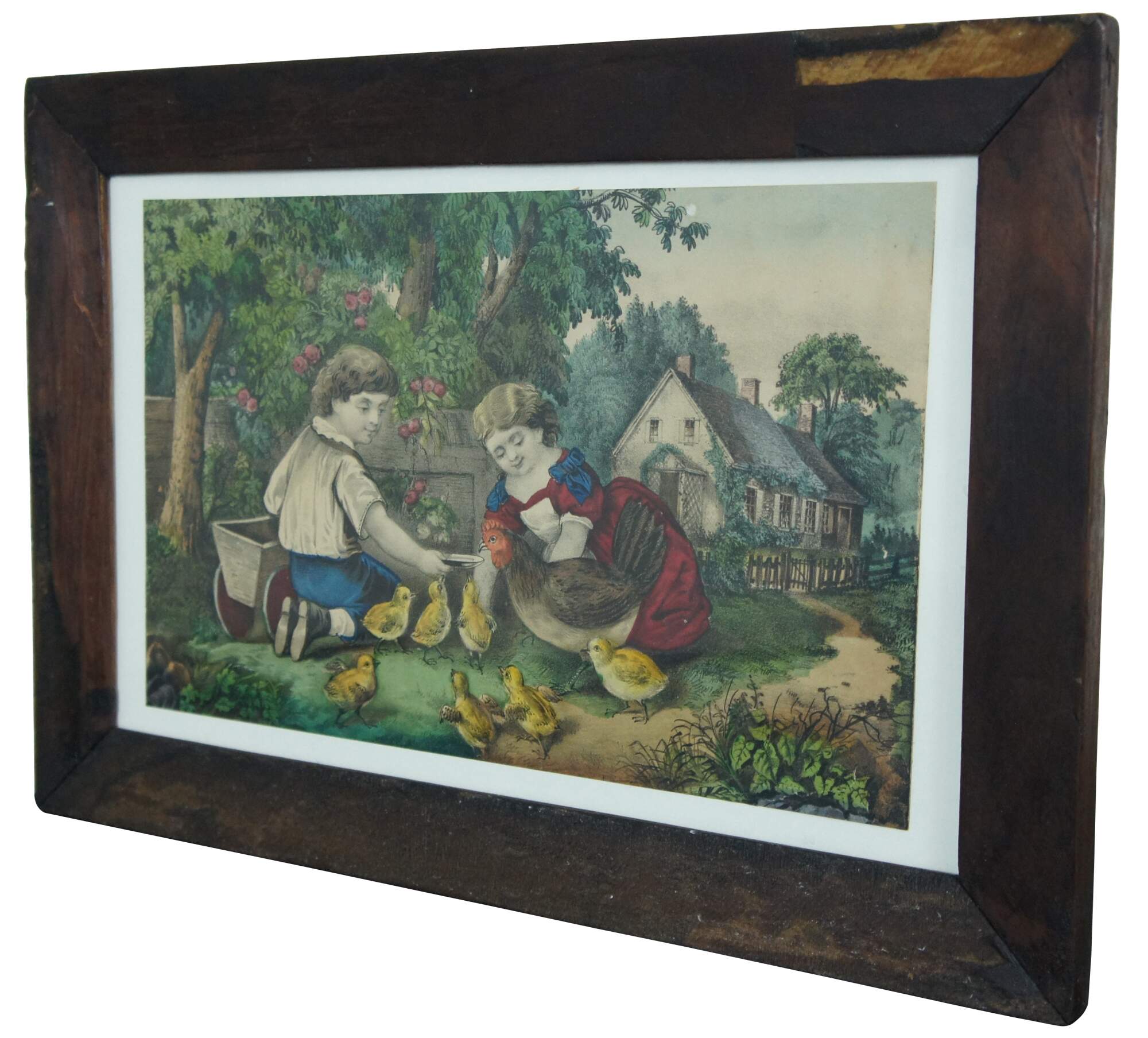 Antique Victorian framed hand colored lithograph print published circa 1860 by Currier & Ives, titled The New Brood, showing a young boy and girl on a country cottage garden feeding a hen and her chicks.