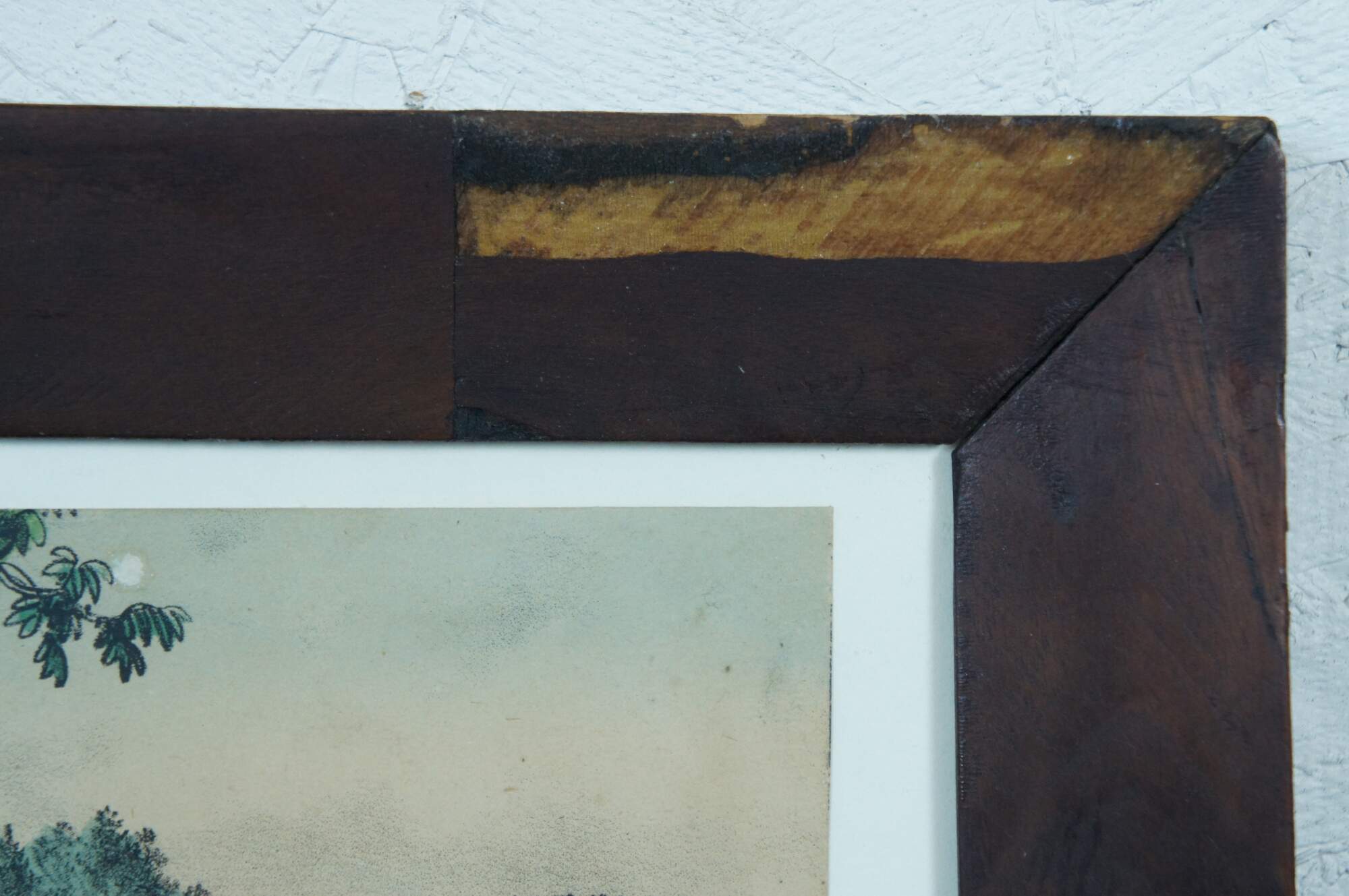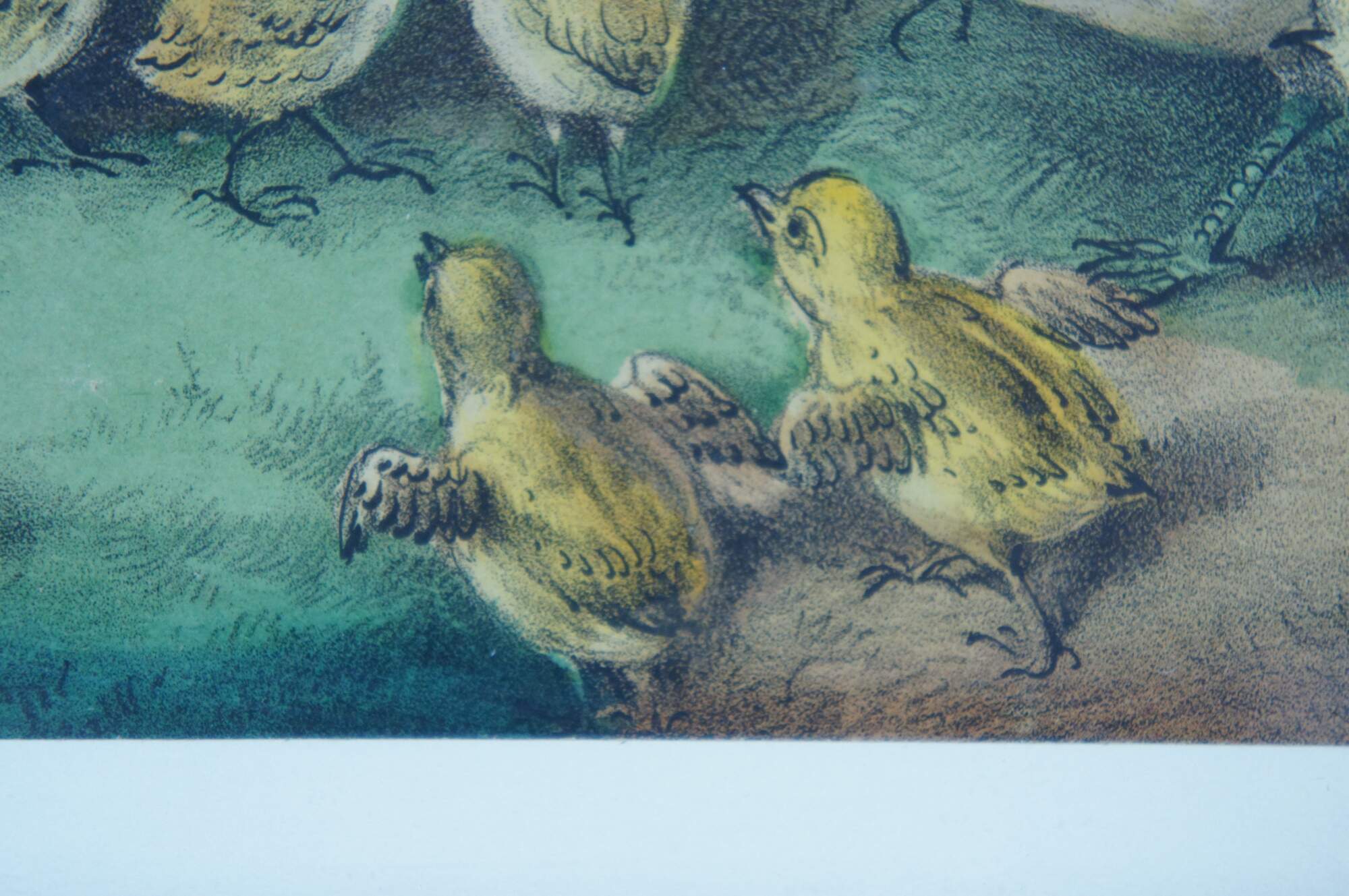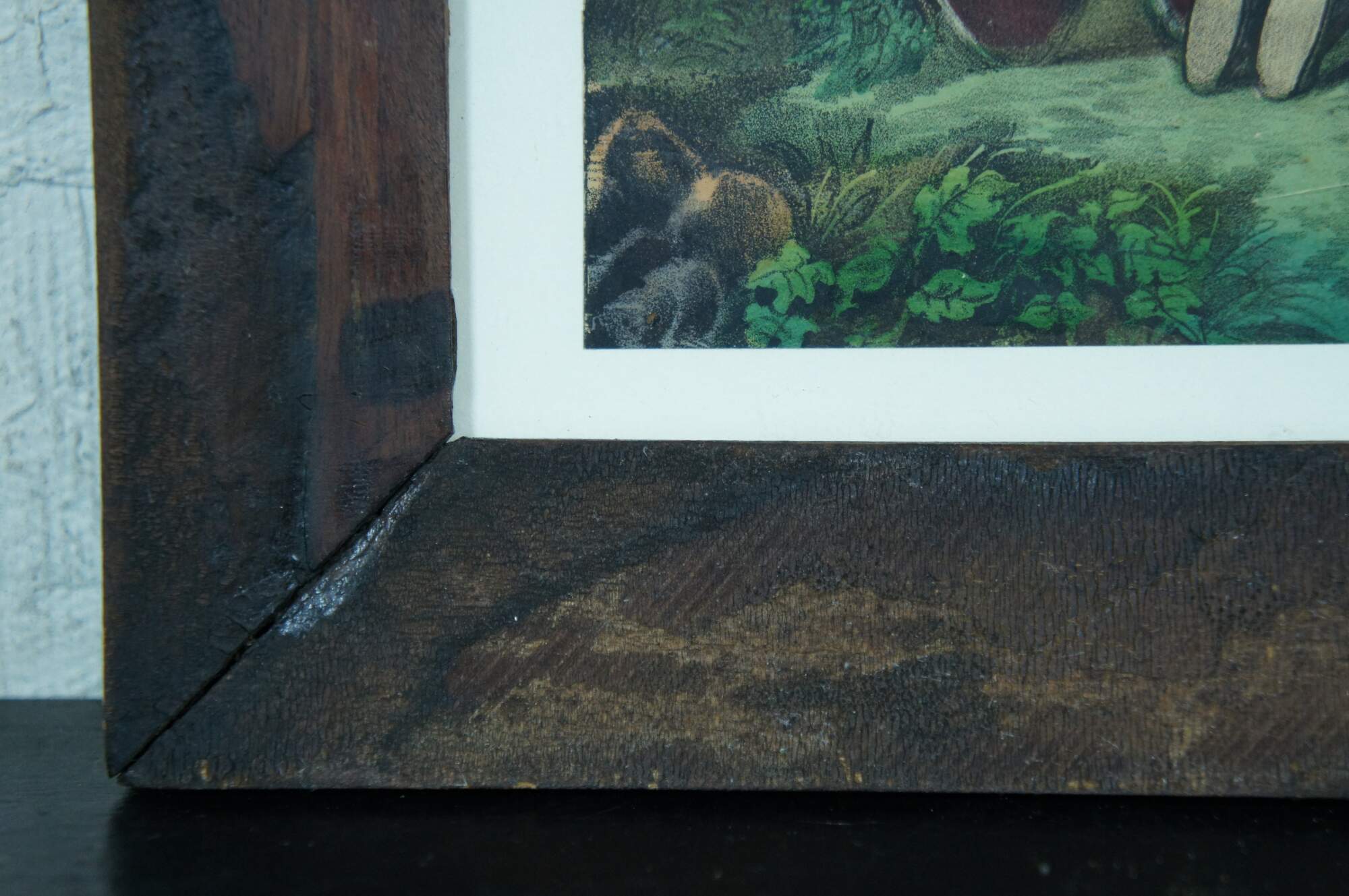 Antique Victorian framed hand colored lithograph print published circa 1860 by Currier & Ives, titled The New Brood, showing a young boy and girl on a country cottage garden feeding a hen and her chicks.