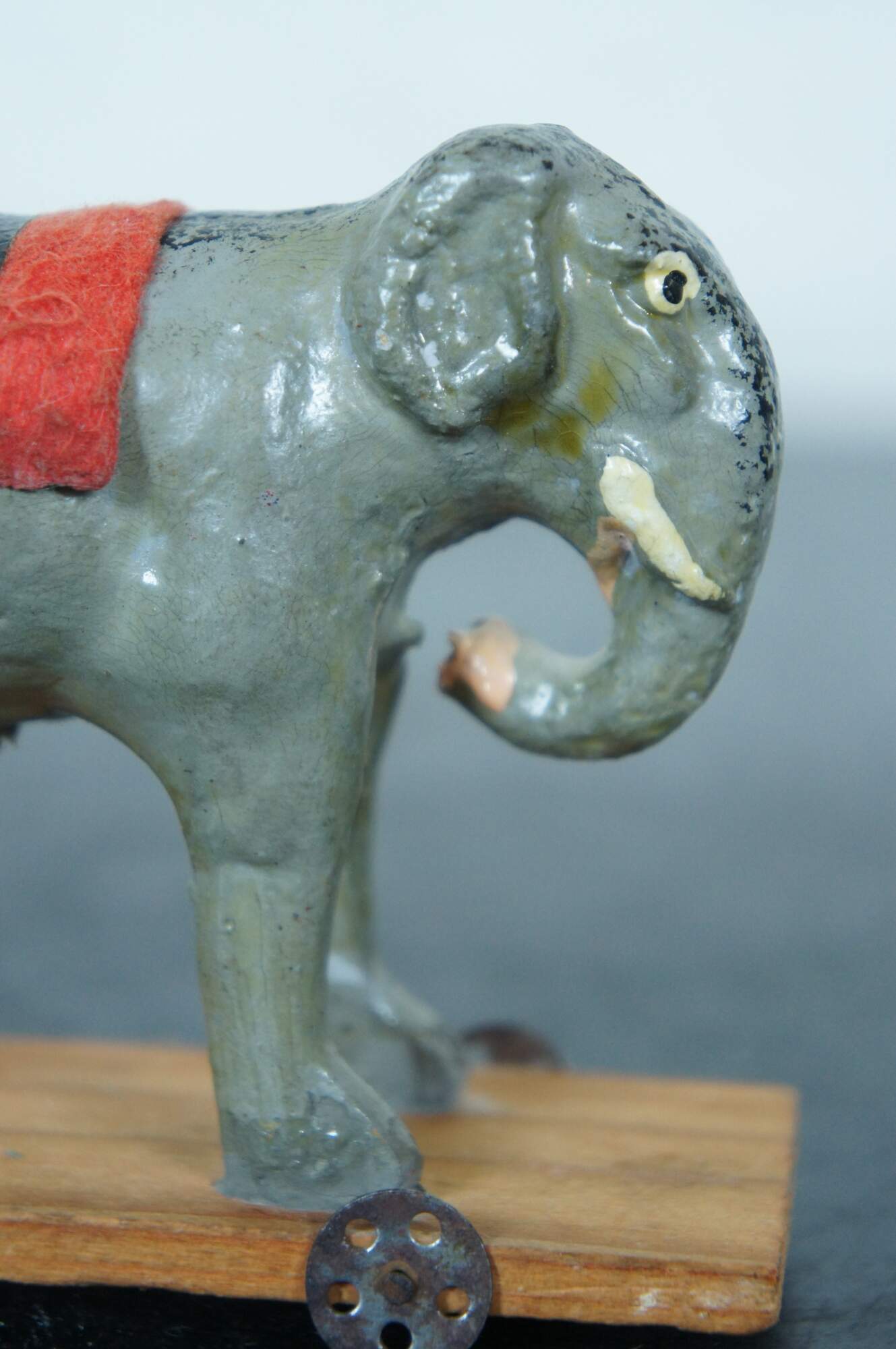 Antique painted celluloid circus elephant toy with felt saddle, standing on a simple wooden cart with tin wheels.