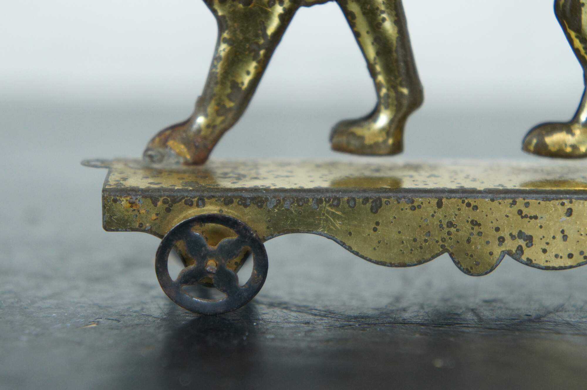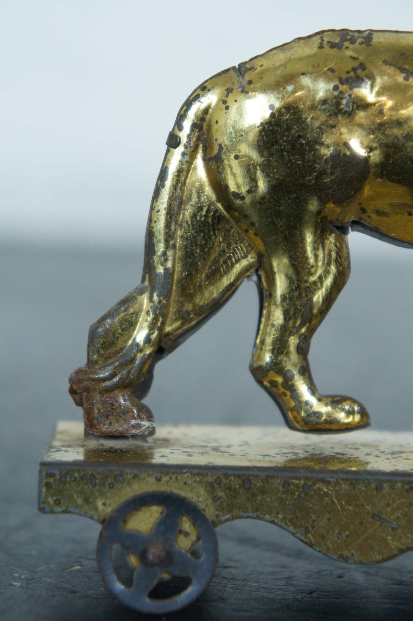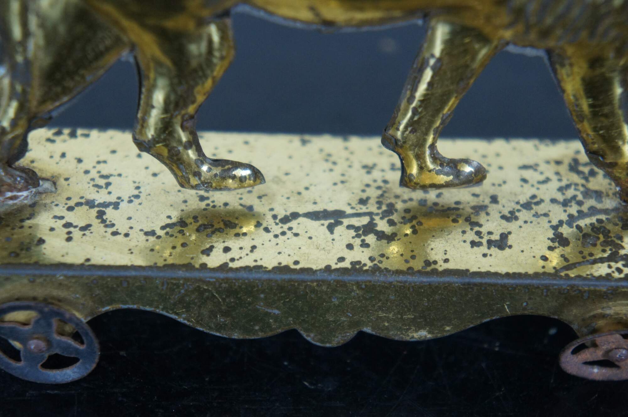 Antique tin pull toy in the shape of a male lion standing on a decorative platform with wheels and holes for a pull string, in brass finnish.