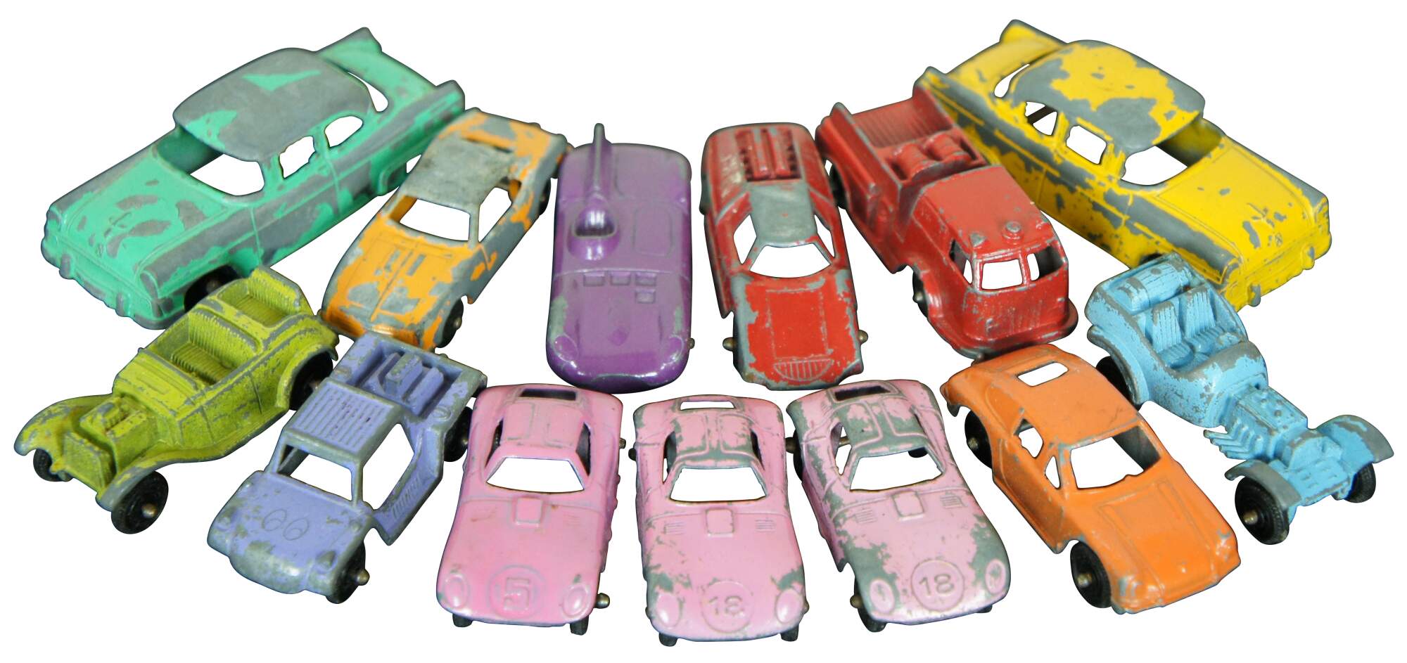 Lot of 13 mid century die cast metal Tootsie Toy cars and trucks. Featuring a taxi, fire engine / truck, jaguar, Roadster, Fiat, Ford, and cruisers / racecars. Chicago.