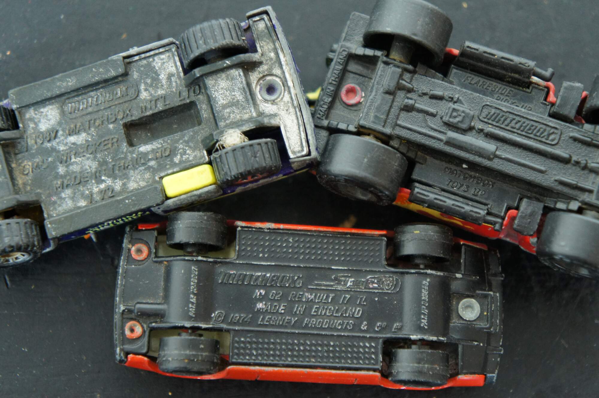 Lot of 15 rare assorted 1960s-1980s Matchbox and Hot Wheels cars and trucks. Well played with. Matchbox: 1971 Superfast Mod Rod No 1, 1974 No 62 Renault 17 TL, 1982 Flareside Pick-Up, 1987 GMC Wrecker. Hot Wheels: Redline 1967 Silhouette, Redline 1967 Volkawagen, Redline 1969 The Heavyweights (one blue, one green), Redline 1969 Volkswagon Beach Bomb, Redline 1969 Warpath, Redline 1974 911 Porsche, 1977 white pick up truck, 1987 Sandswarm, 1988 Hurricane.