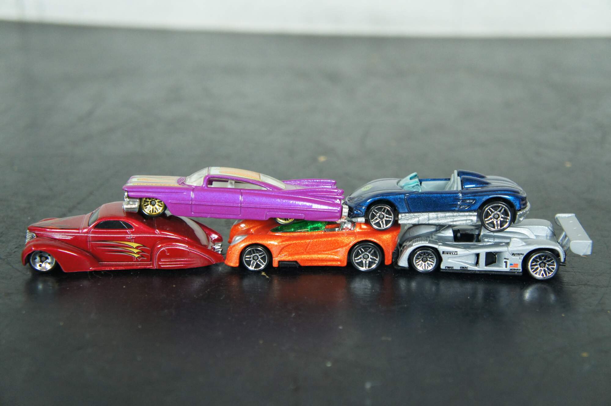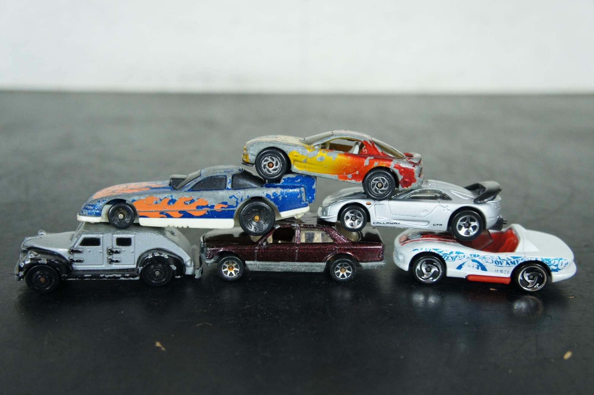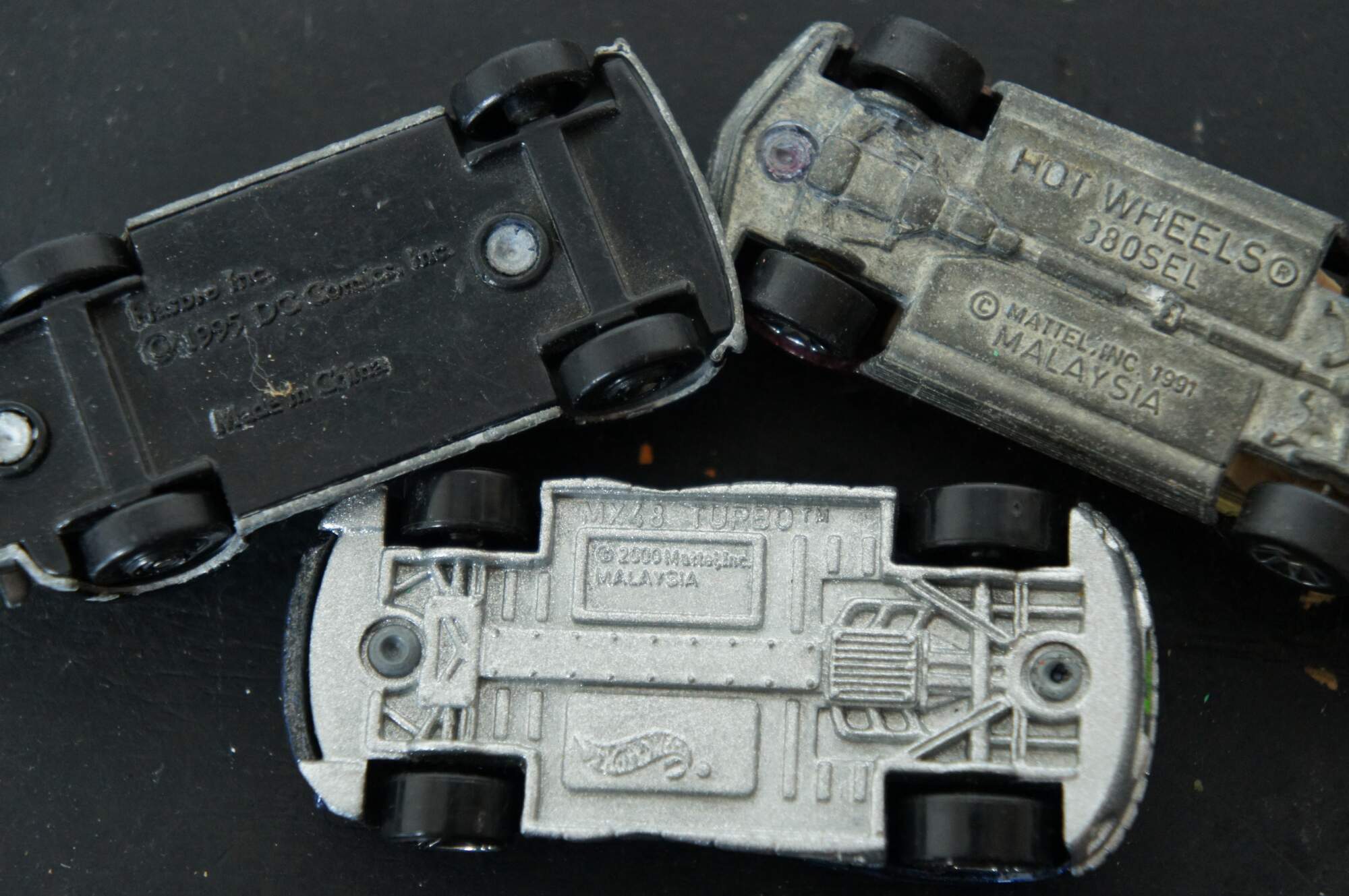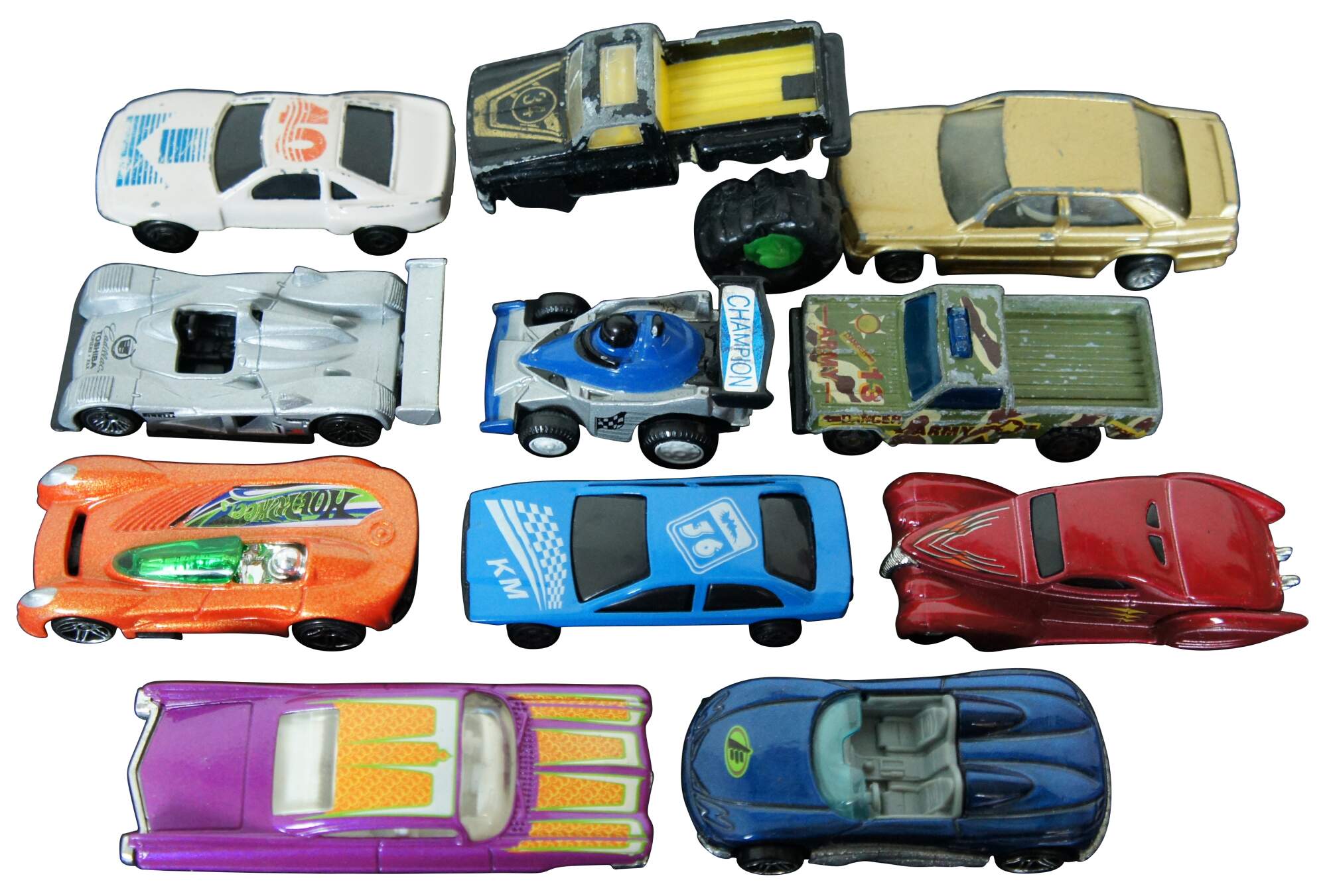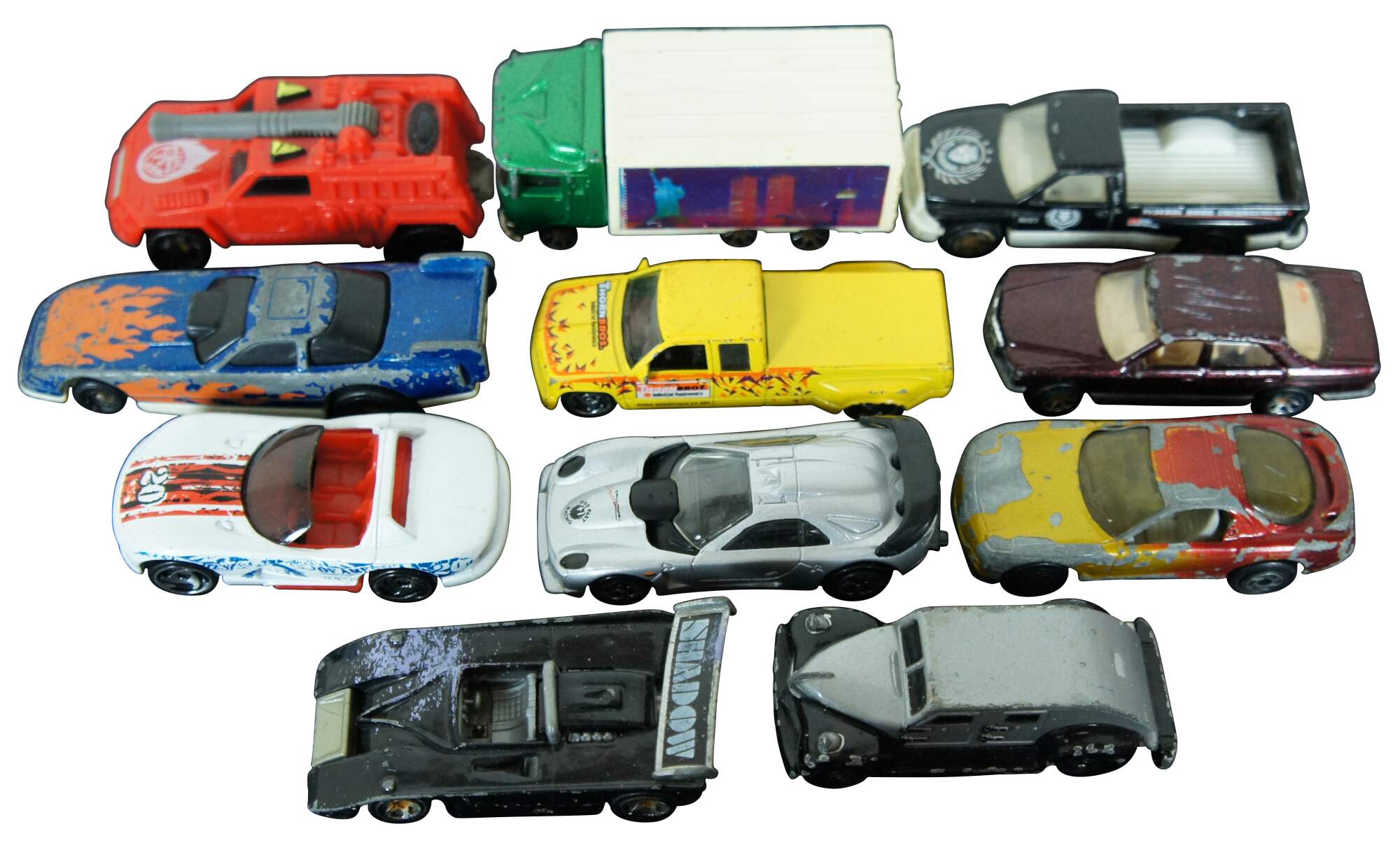 Lot of 22 assorted die cast cars and trucks, mostly by Hot Wheels, Matchbox and Hasbro; some unbranded. Undated: white race car #40, Army camo pick-up, Champion drag racer, KM 36 race car, gold Hot Wheels sedan, #34 monster truck. Hot Wheels: 2002 Swoop Coupe, 2001 Custom 59 Cadillac, 2000 Monoposto, 2000 Cadillac LMP, 2000 MX48 Turbo, 1997 Call Away C-7, 1994 Dodge Ram Truck, 1991 380SEL, 1997 Customized C3500, 1991 Twin Towers Truck, 1999 Shadow MK 11A, 1994 fire truck, 192 USA race car, 1993 blue flame race car, 1995 Mazda RX-7. Hasbro 1995 DC Comics Batman car.