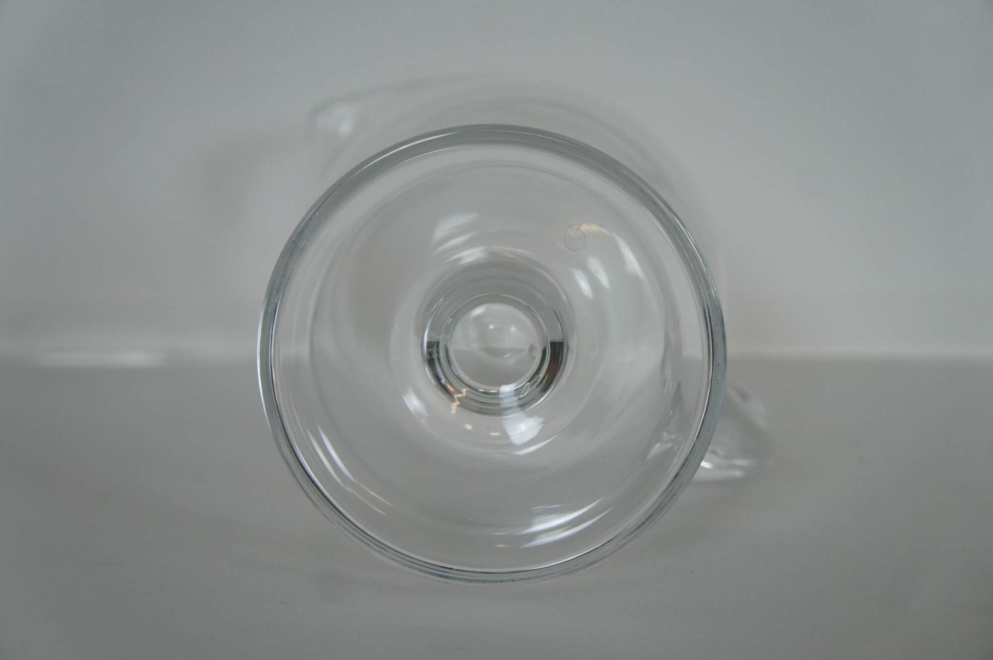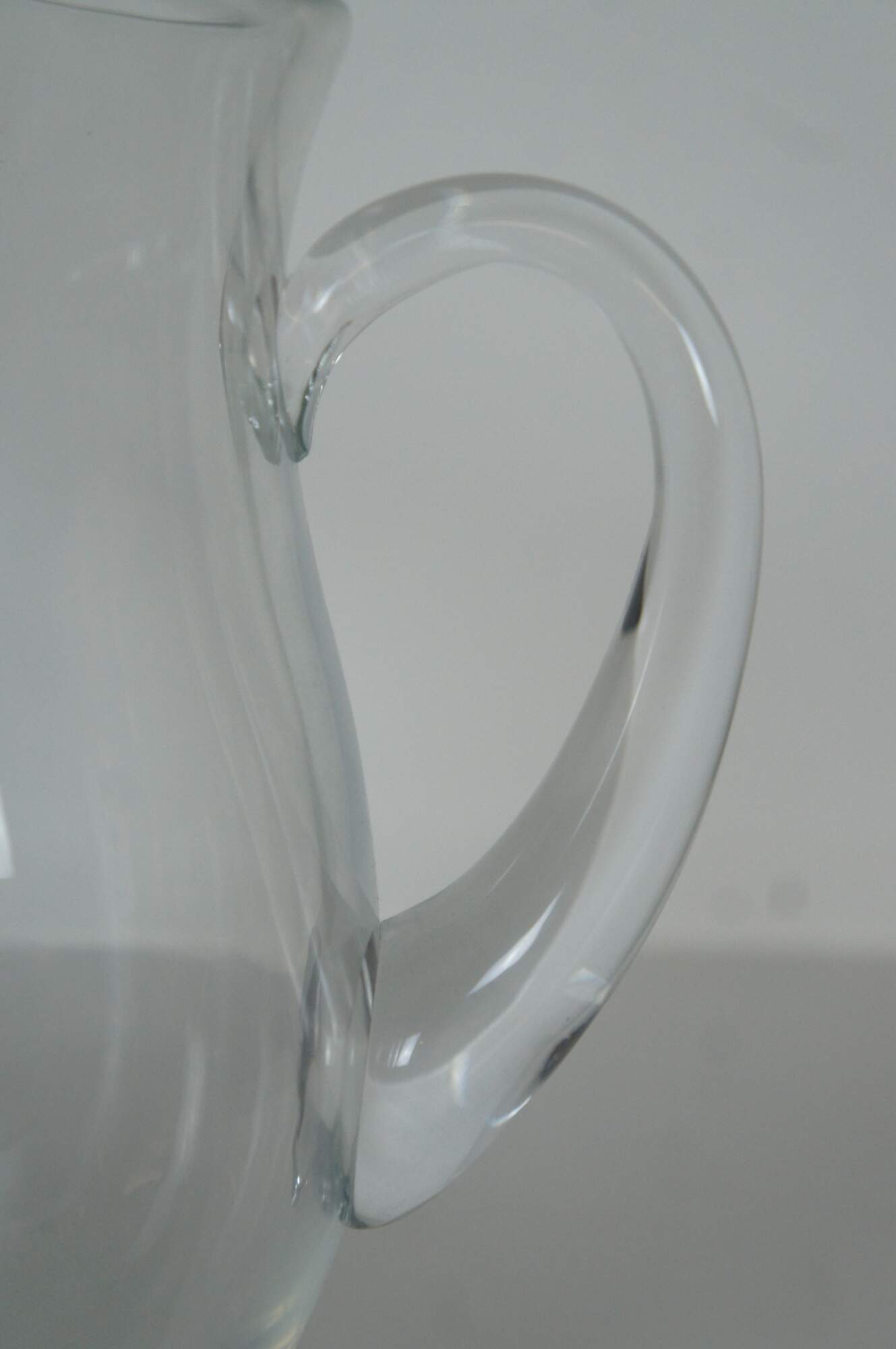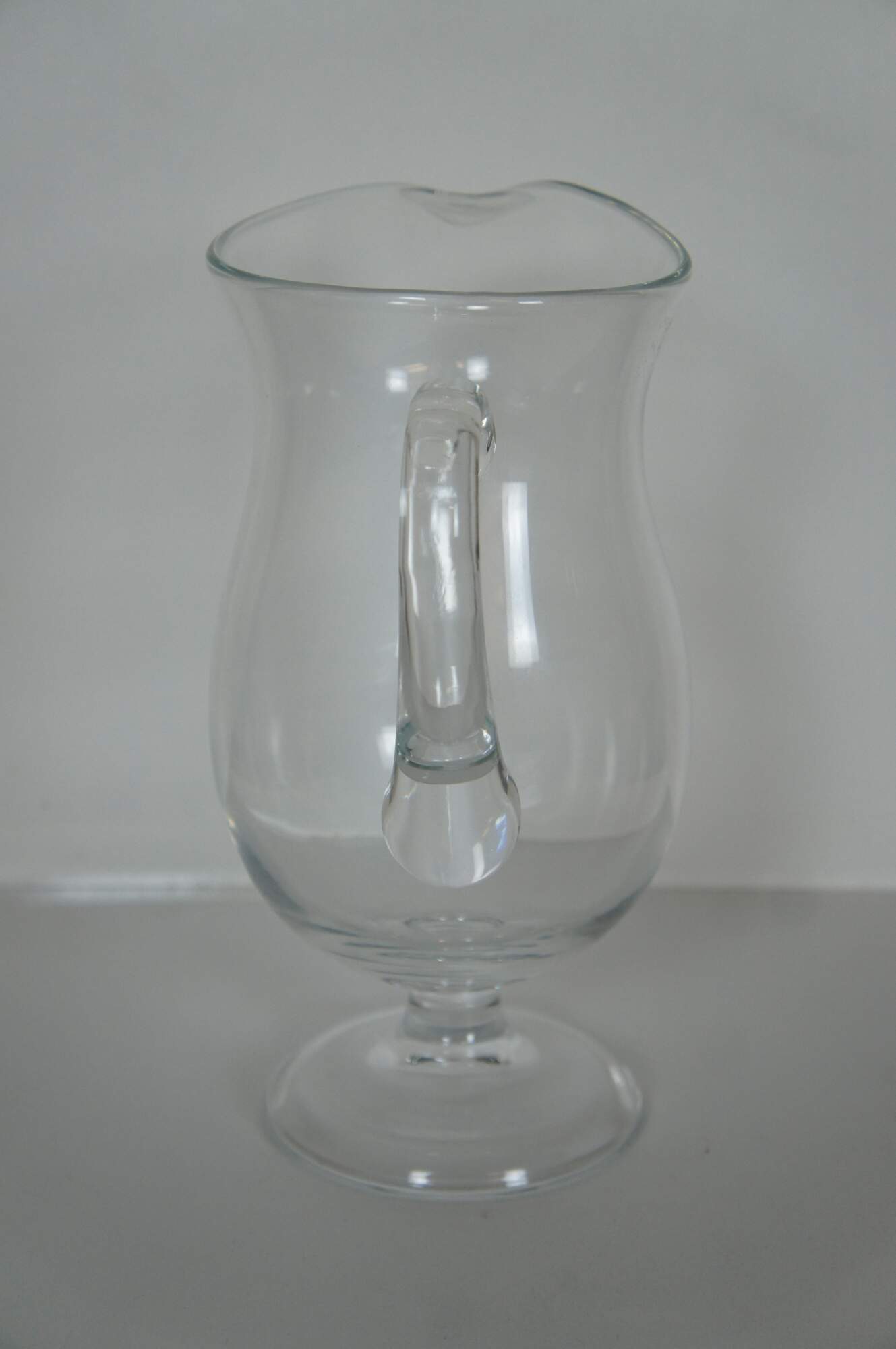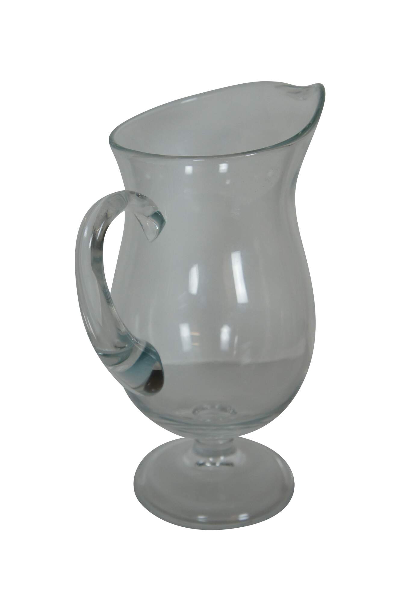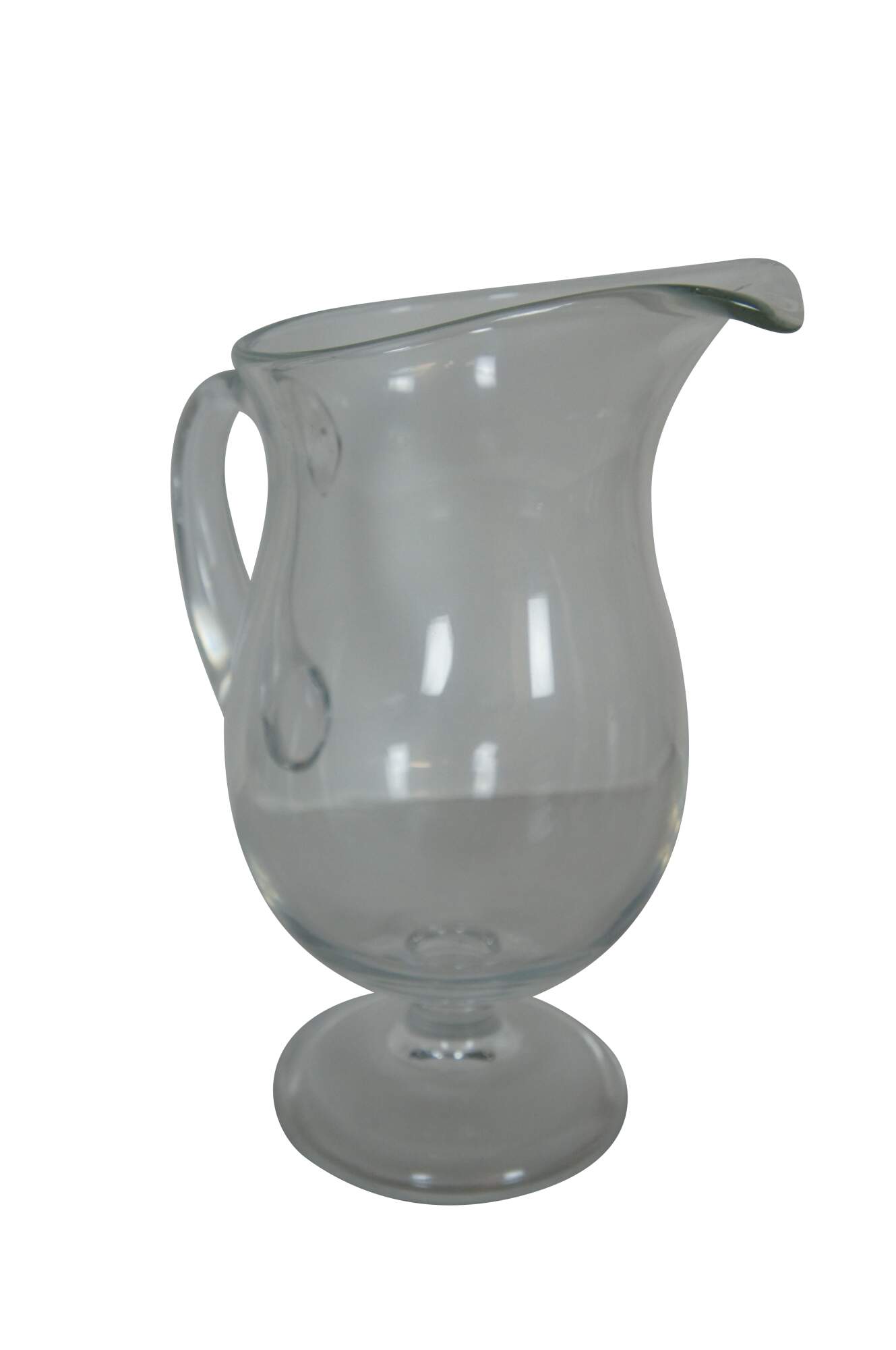 Vintage glass pitcher featuring footed base with thick handle and elongated spout.