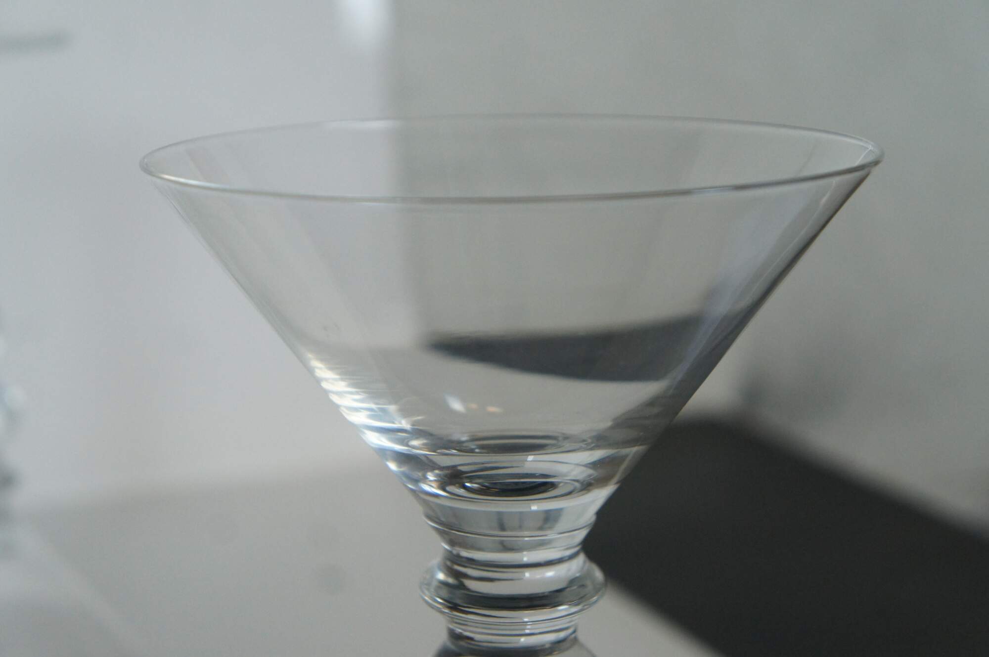Set of four vintage glass martini glasses featuring tall tapered form with stacked ball / orb and twisted design.