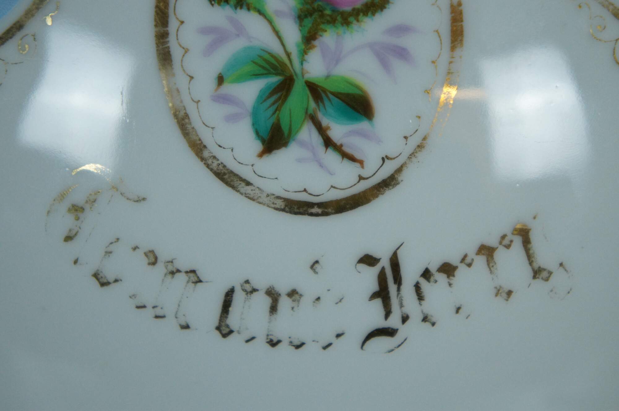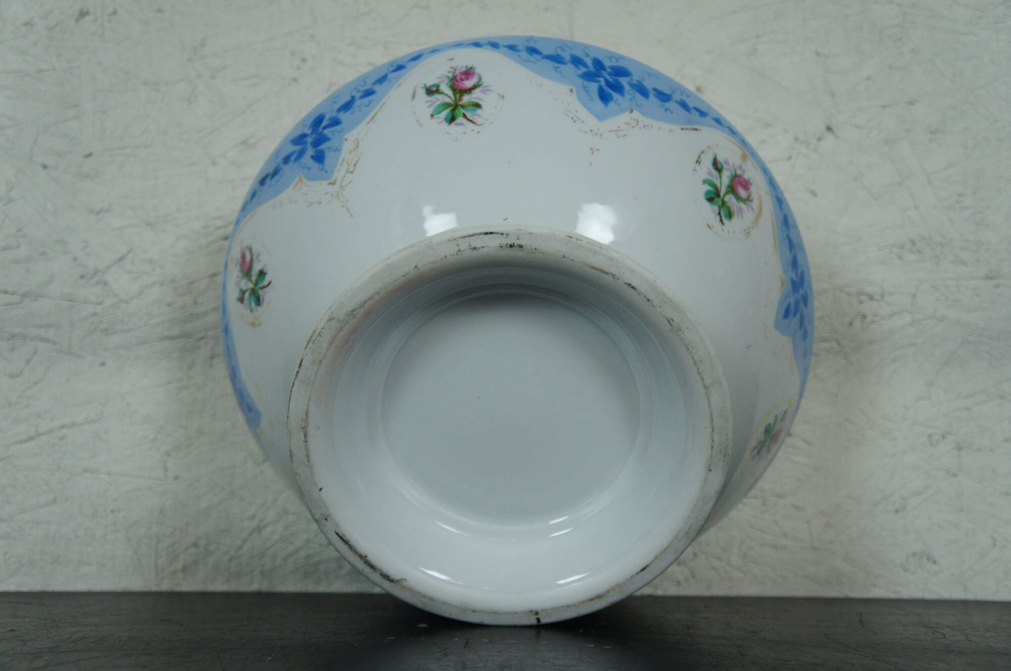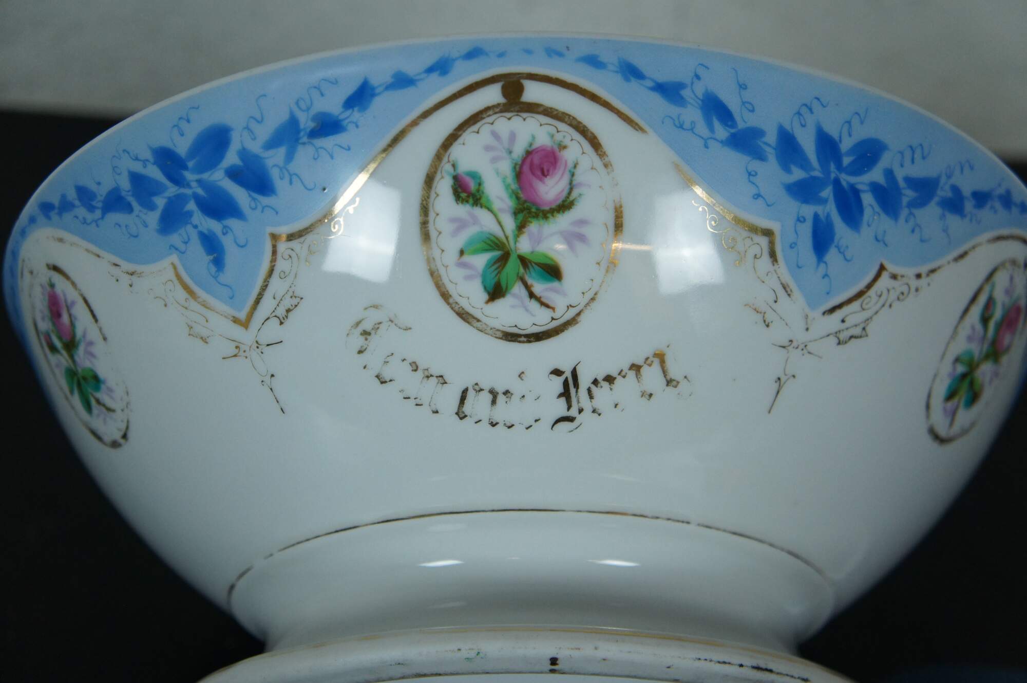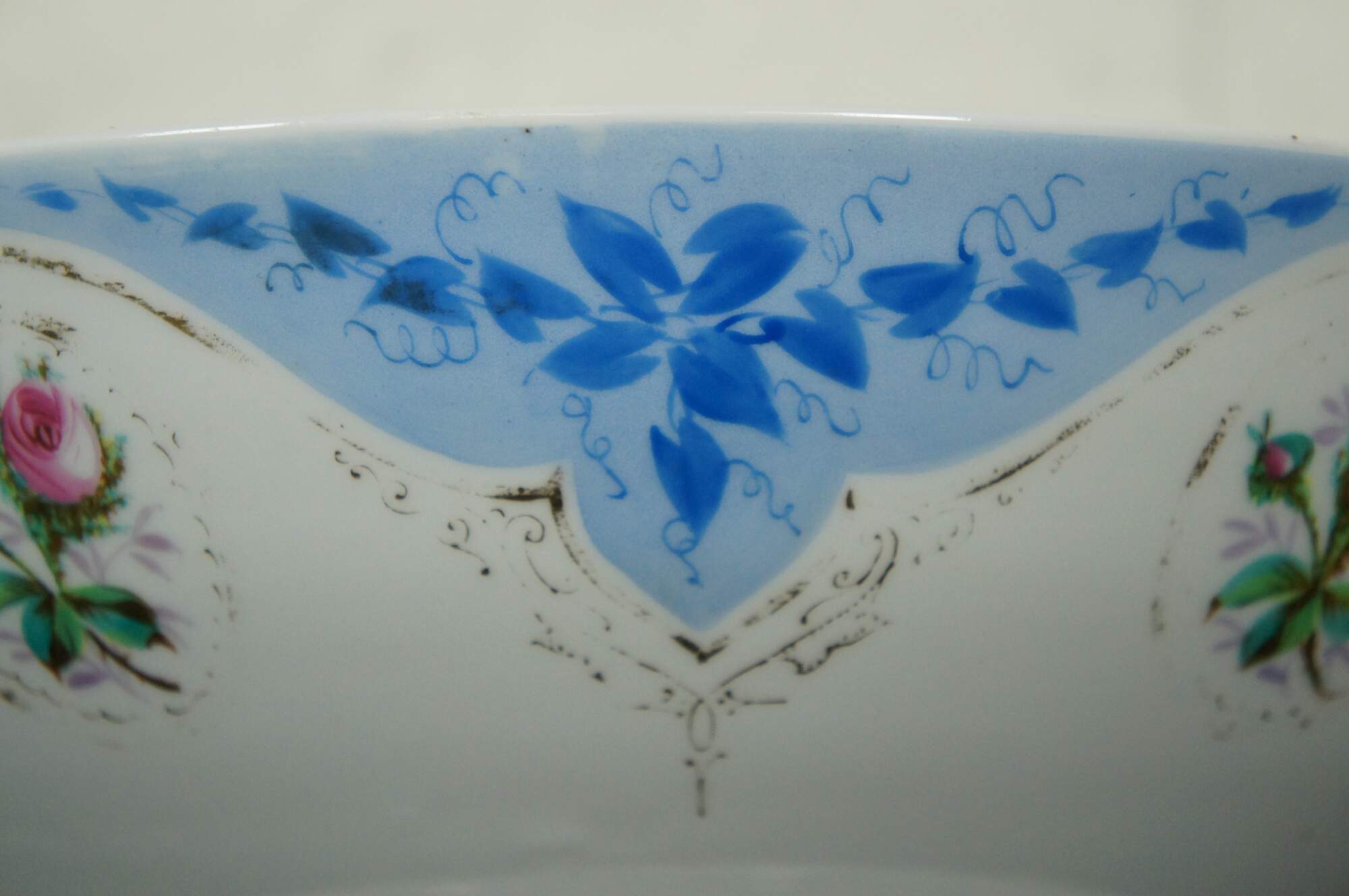 Antique porcelain Tom and Jerry punch bowl, decorated with blue foliate swags, pink roses and gilding. “A Tom and Jerry is a traditional Christmastime cocktail in the United States, sometimes attributed to British writer and professional boxing journalist Pierce Egan[1] in the 1820s. It is a variant of eggnog with brandy and rum added and served hot, usually in a mug or a bowl. Another method uses egg whites, beaten stiff, with the yolks and sugar folded back in, and optionally vanilla extract added. A few spoonfuls are added to a mug, then hot milk and rum are added, and it is topped with nutmeg. Pre-made Tom and Jerry batter, typically produced by manufacturers in Wisconsin, Minnesota and the Dakotas, is sold in regional supermarkets during the Christmas season. The drink's name is a reference to Egan's book, Life in London, or The Day and Night Scenes of Jerry Hawthorn Esq. and his Elegant Friend Corinthian Tom (1821), and the subsequent stage play Tom and Jerry, or Life in London (also 1821). To publicize the book and the play, Egan introduced a variation of eggnog by adding 1⁄2 US fluid ounce (15 ml) of brandy, calling it a "Tom and Jerry". The additional fortification helped popularize the drink.”