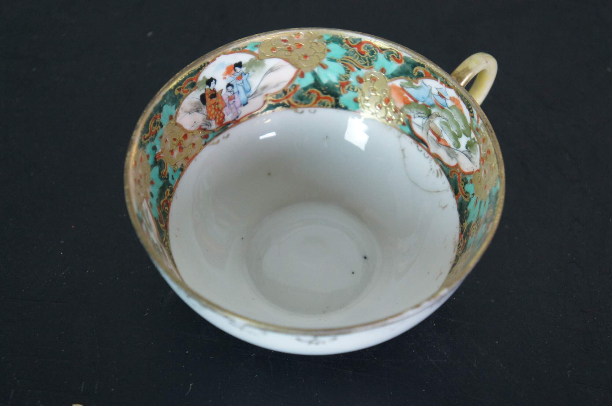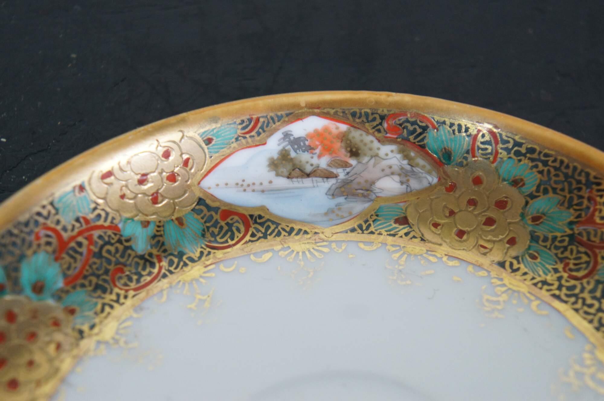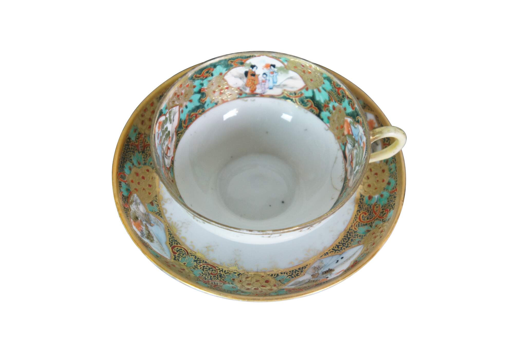 20th century Japanese satsuma style porcelain teacup and saucer. Gold encrysted borders with green and red floral details framing small landscapes and tableaus with figures.