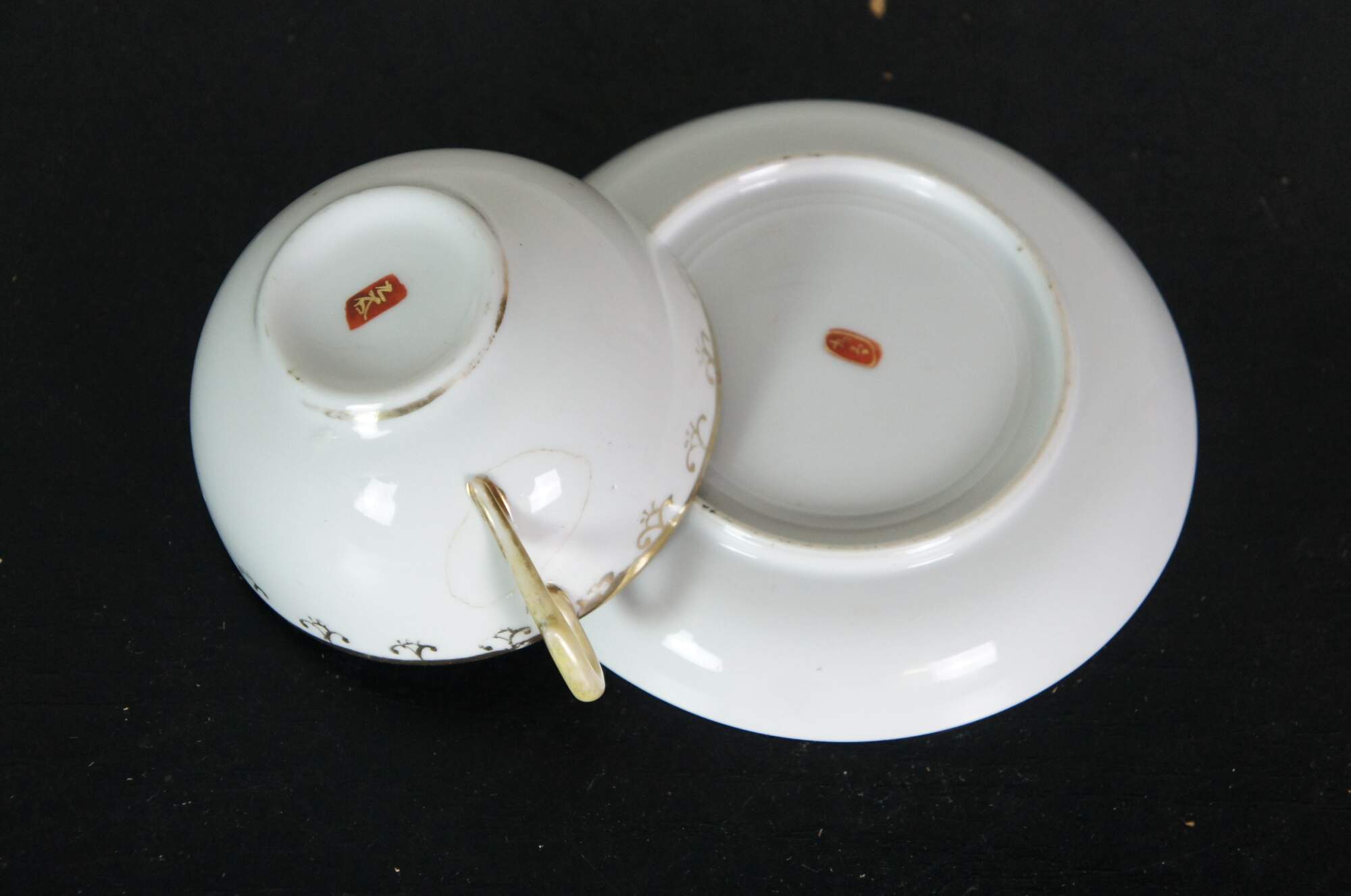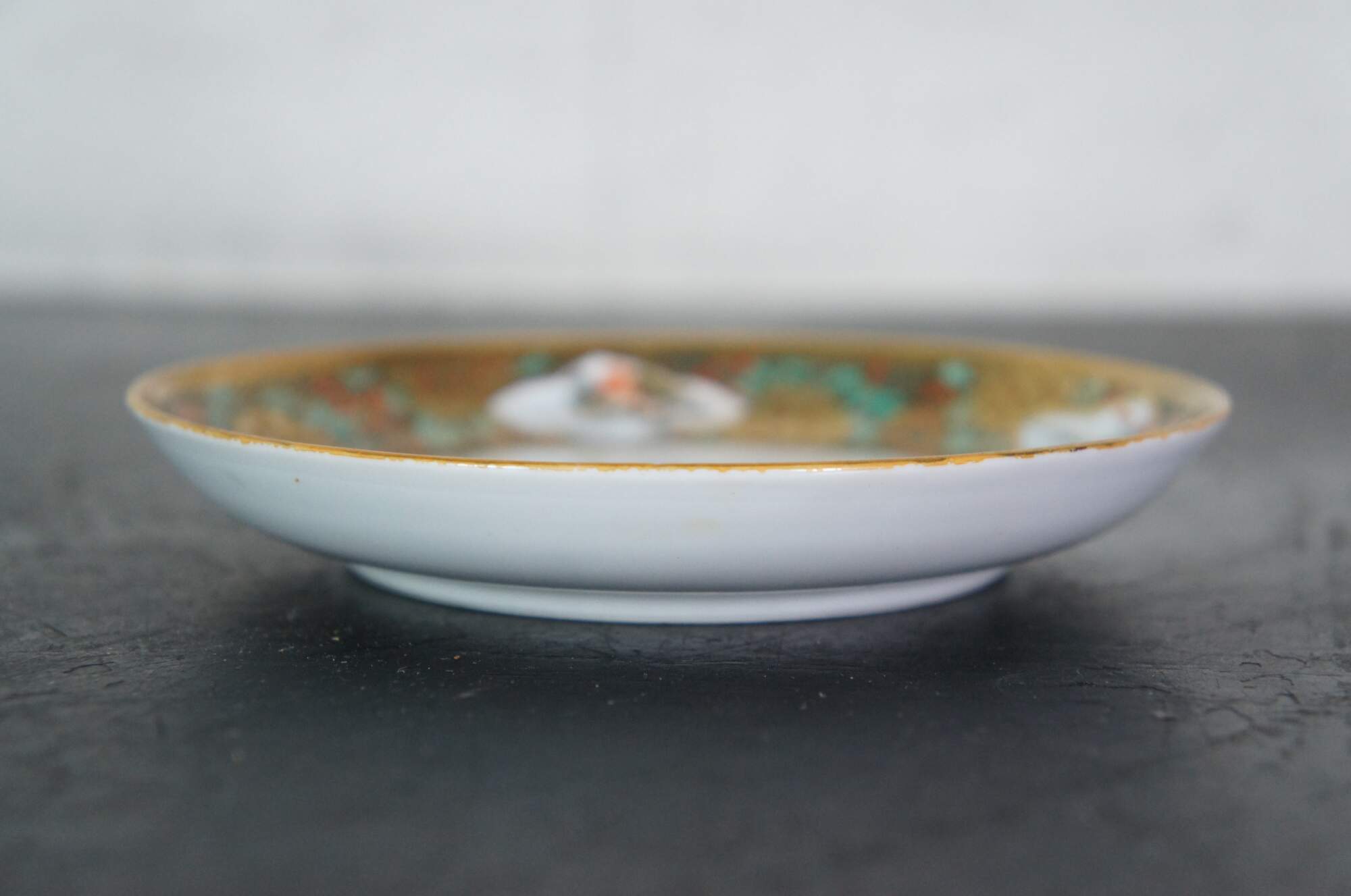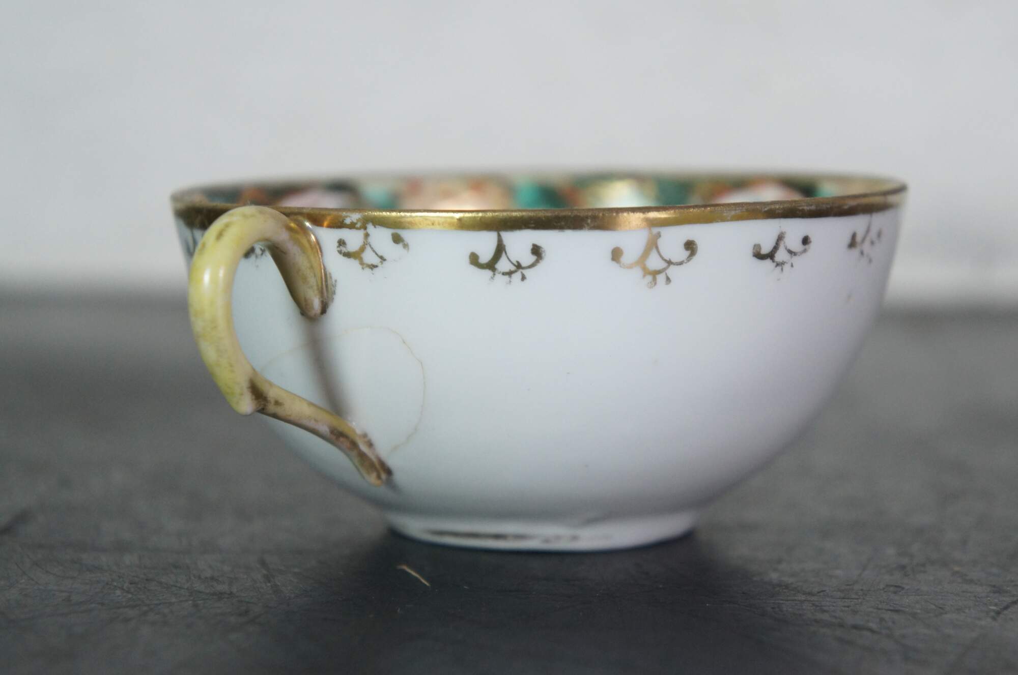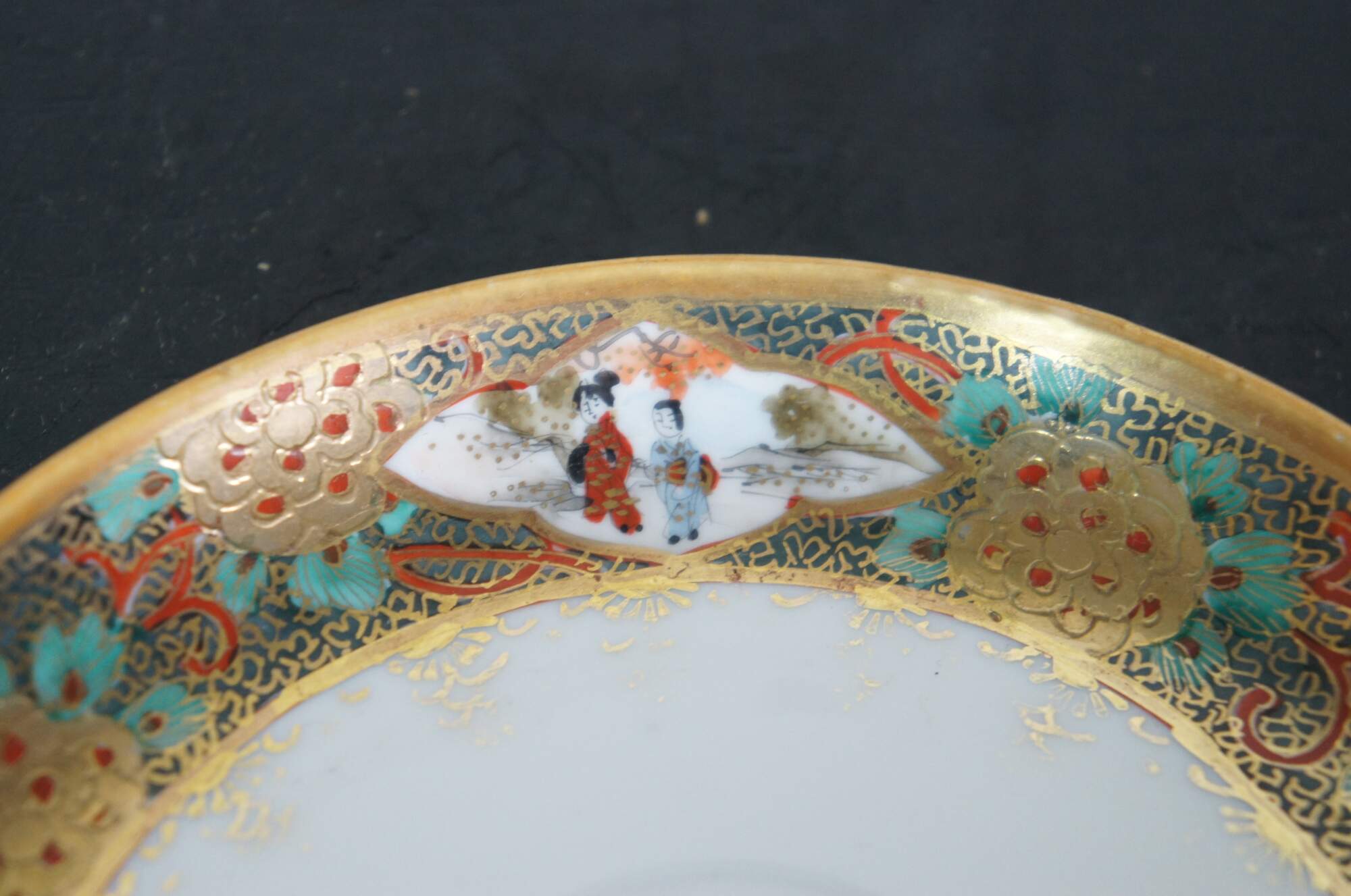 20th century Japanese satsuma style porcelain teacup and saucer. Gold encrysted borders with green and red floral details framing small landscapes and tableaus with figures.