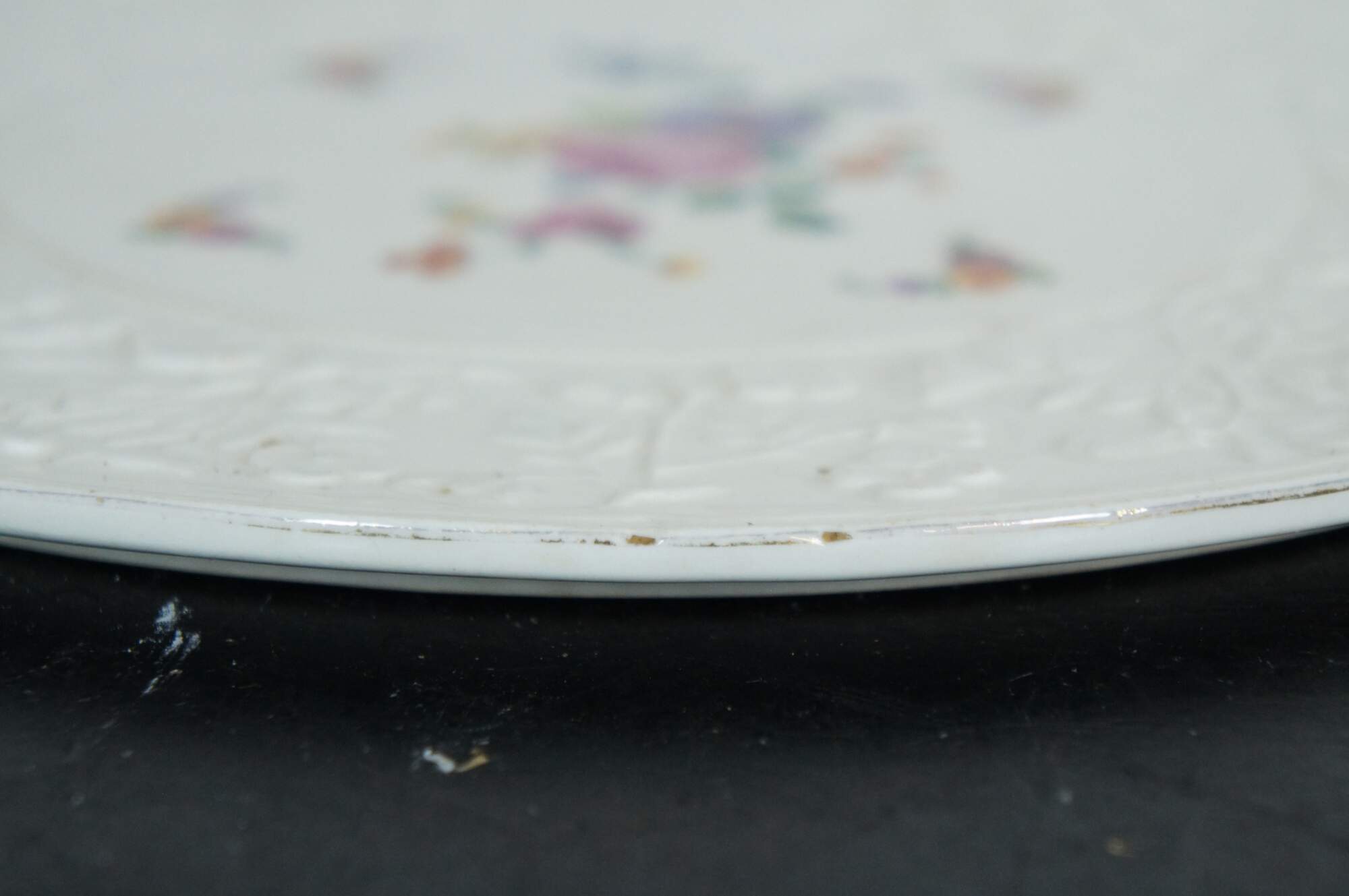 Vintage cream colored ceramic cake plate / teapot stand or trivet with molded flowers around the edge and printed flowers in the center. Made in Czechoslovakia. Attributed to E&R ERphila.