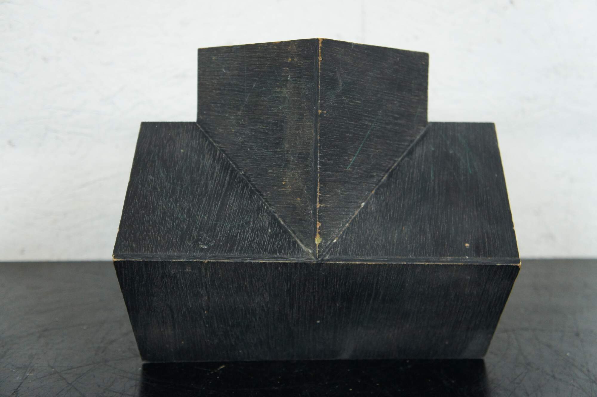 Vintage folk art bird house in the shape of a house with a porch, painted in brown and black.