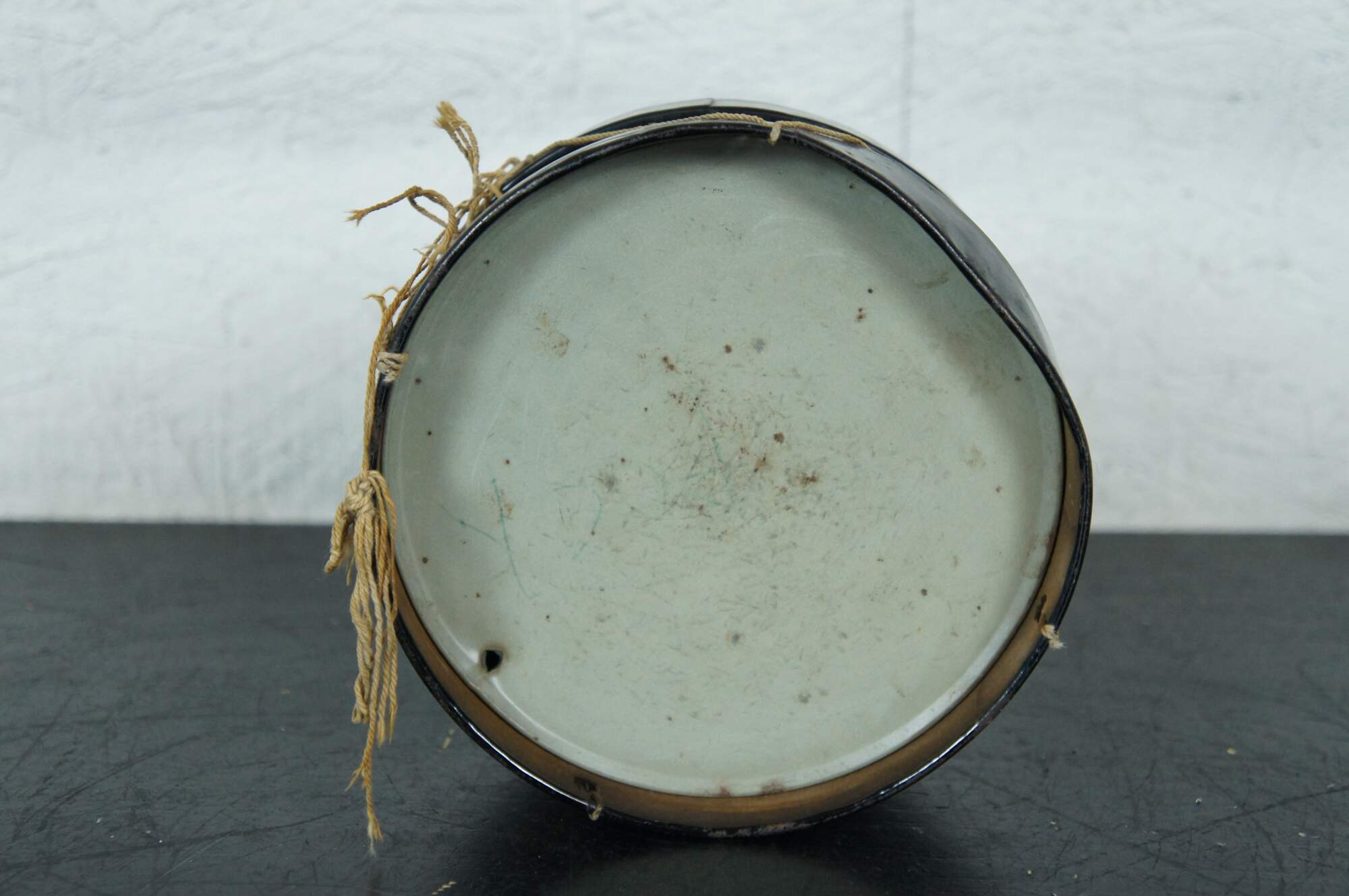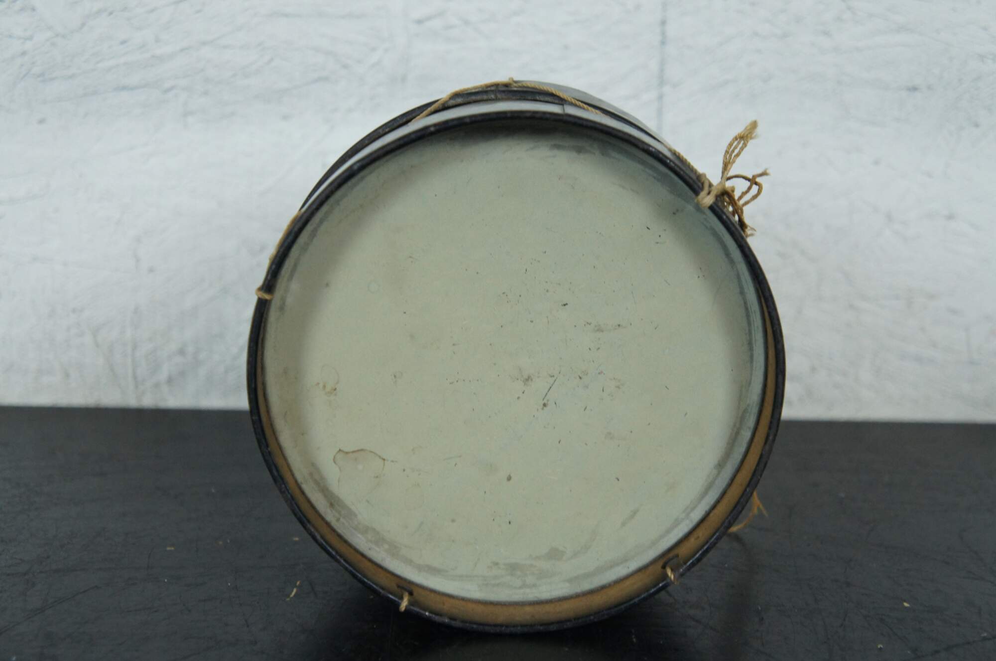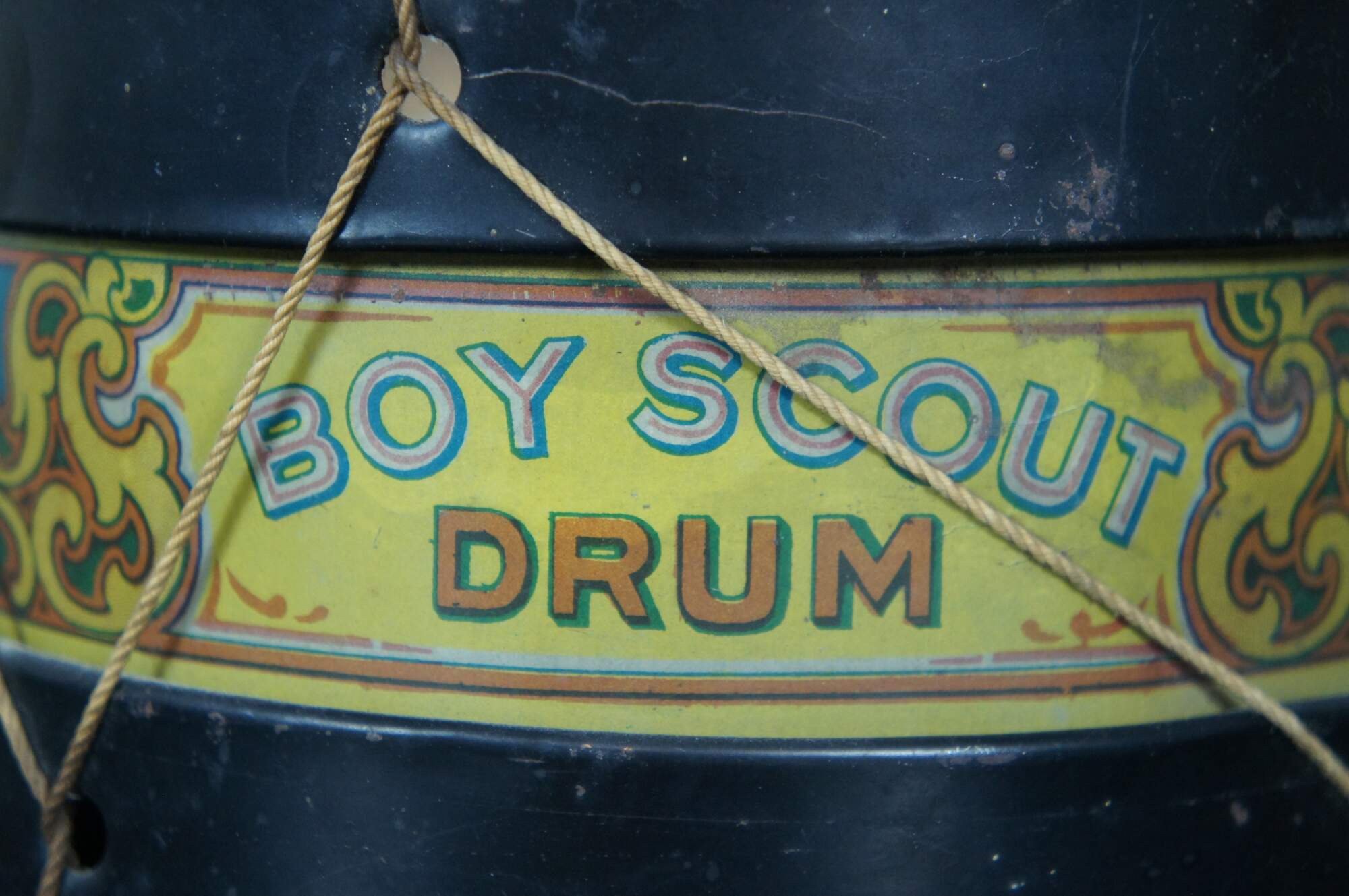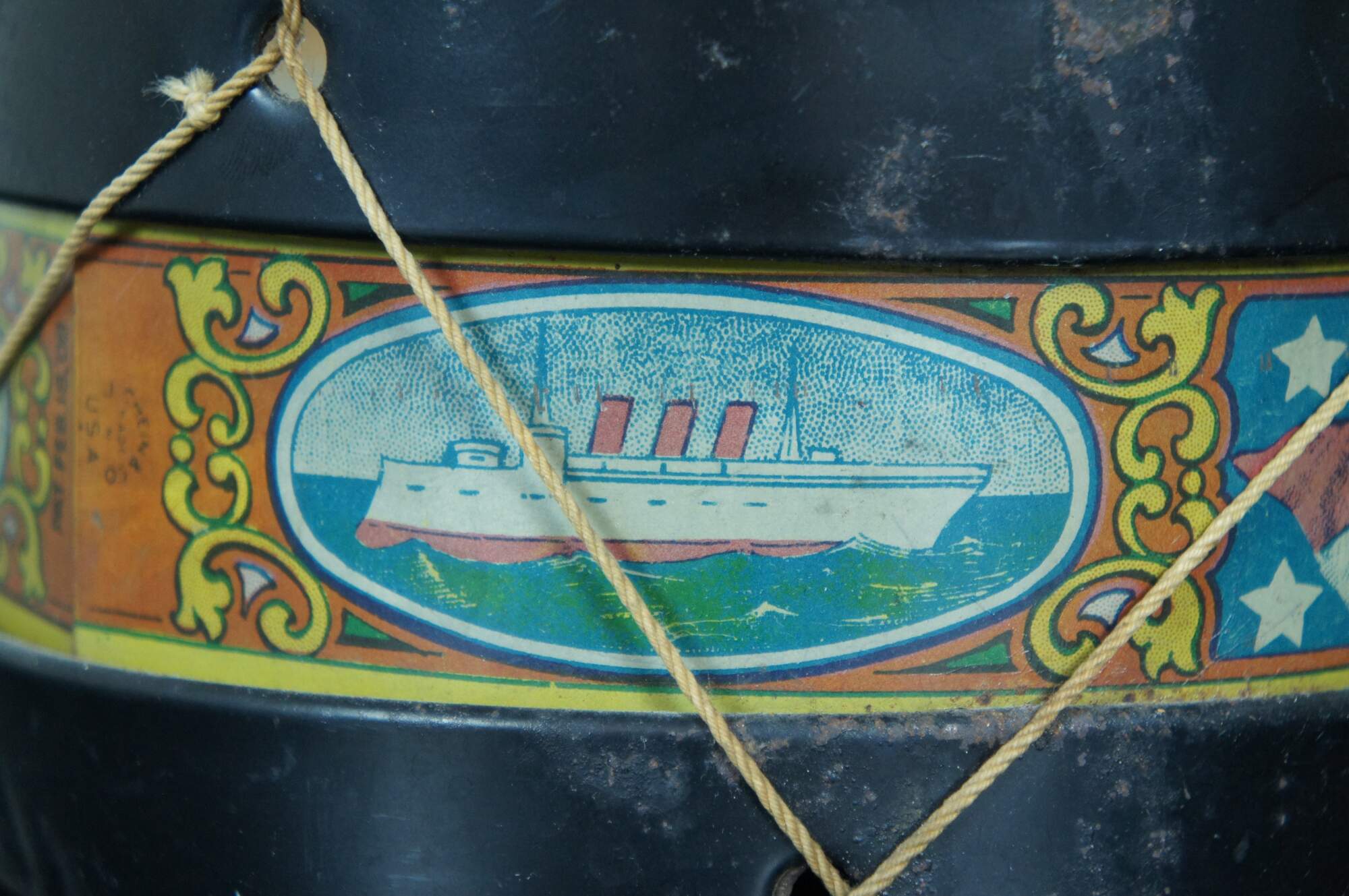 Antique J. Chein & Company lithograph tin Boy Scout drum, patented 1908, featuring a motif of American flags, bald eagles, steamships and the Boy Scout motto “Be Prepared.