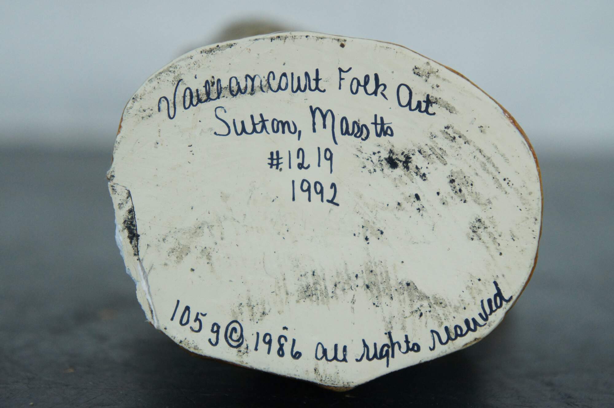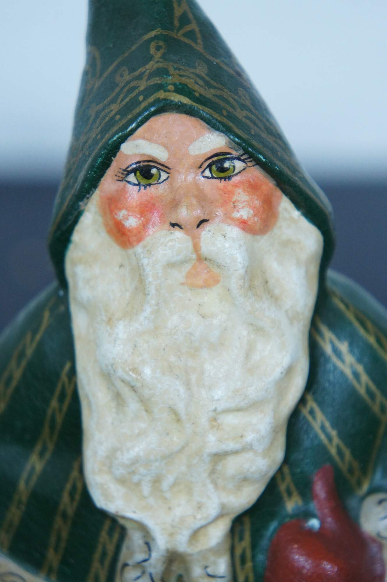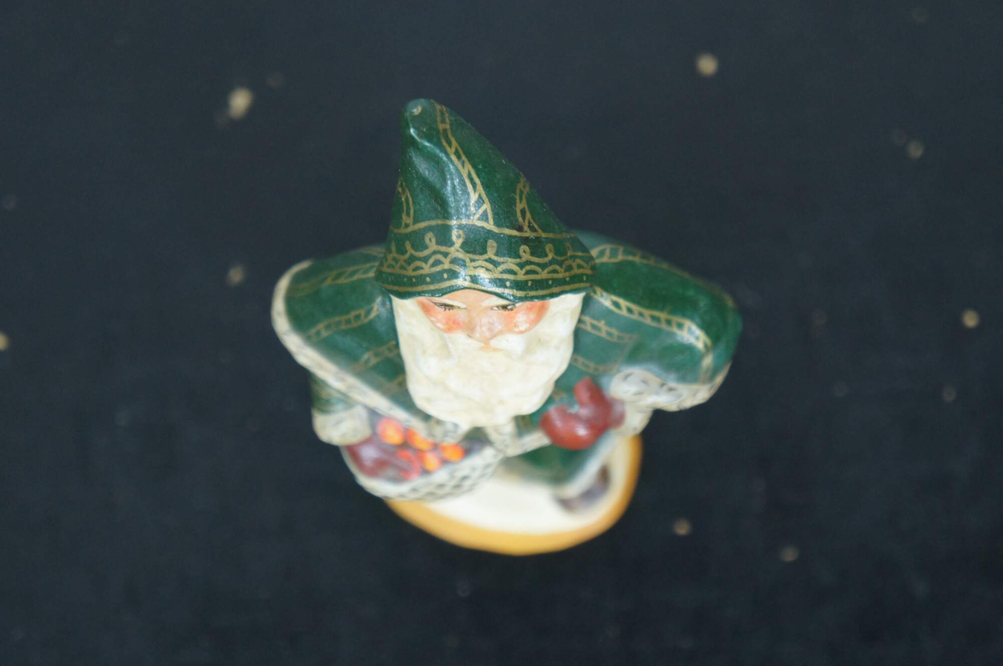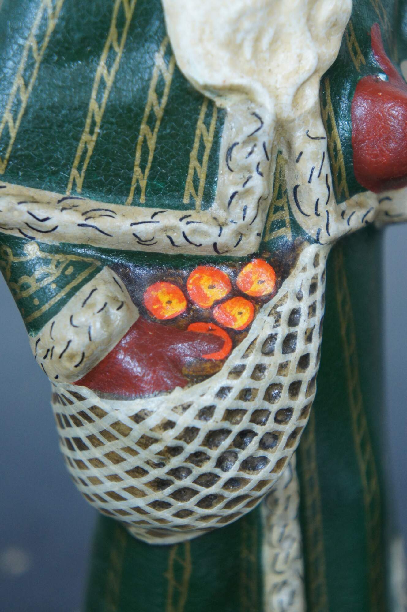 Vintage 1992 Vaillancourt Folk Art chalkware figurine #1219 of Father Christmas or Santa Claus dressed in green and gold with a peaked hood and red gloves, carrying a woven sack of fruit, probably apples.