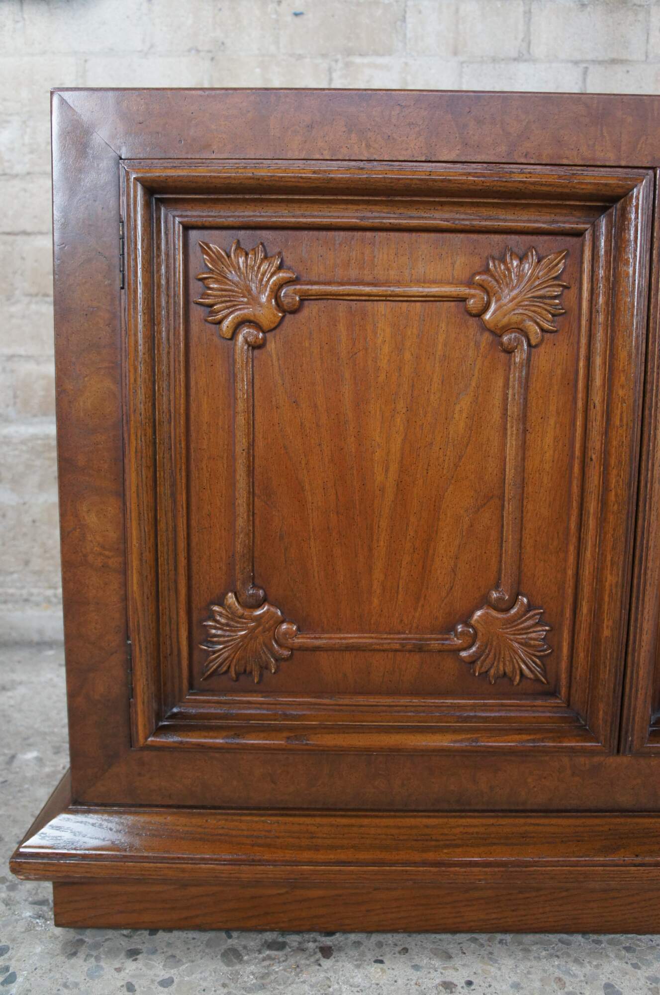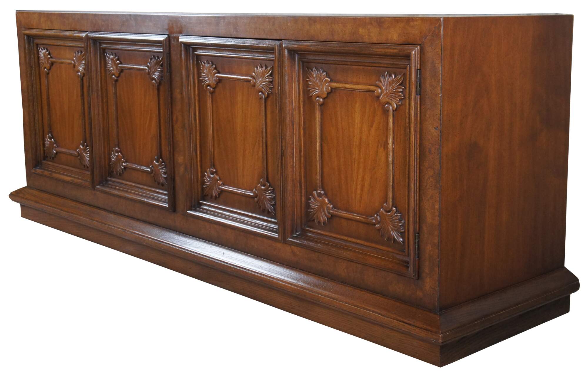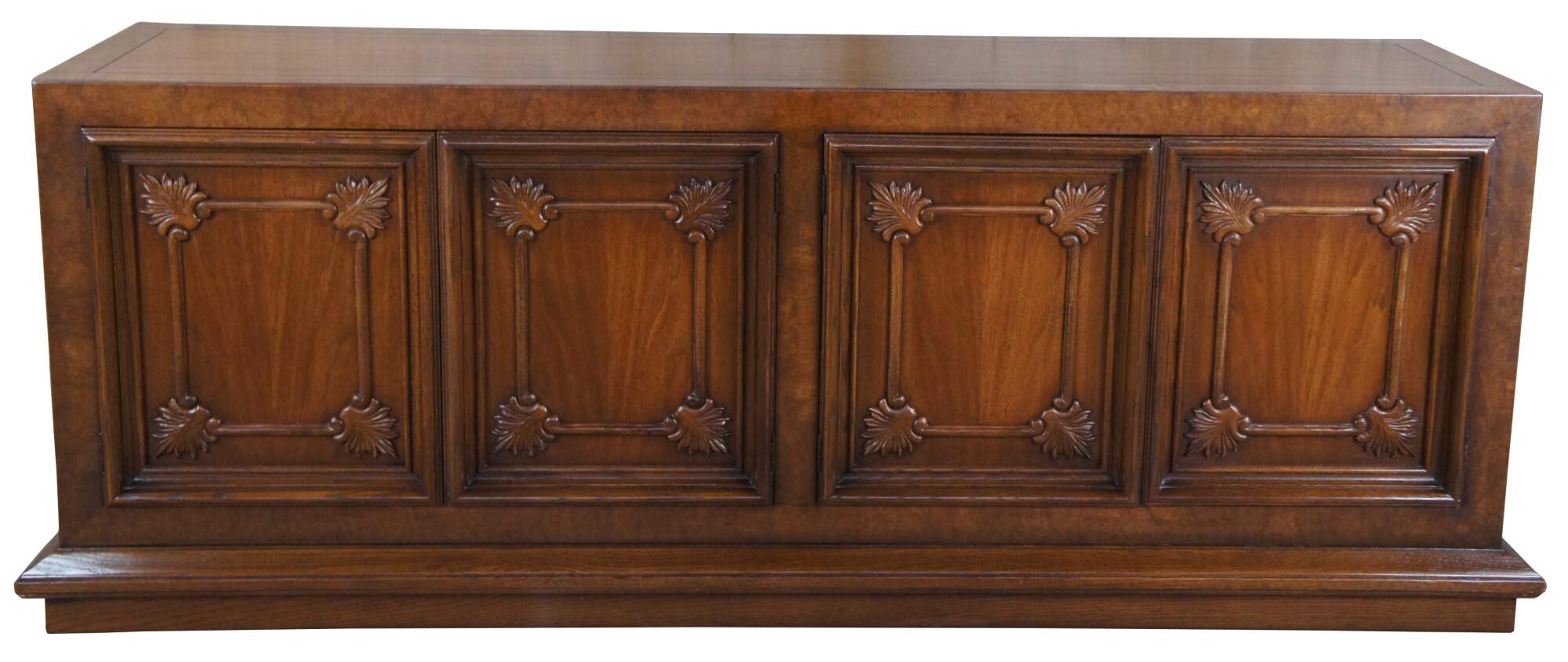 Vintage Italian Provincial console or credenza by Fancher Furniture, cica 1970s. A rectangular form made from walnut with burled accents. Features four acanthus carved doors that open to three dovetailed drawers along the left and storage to the right