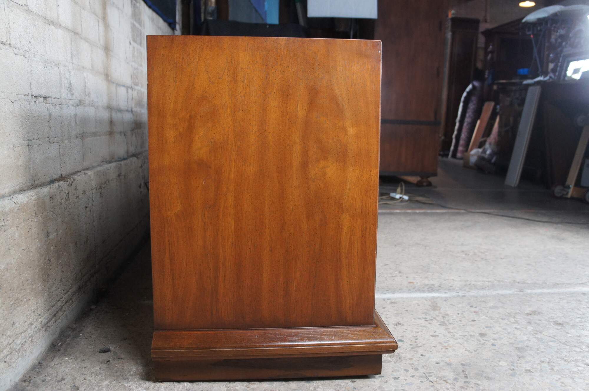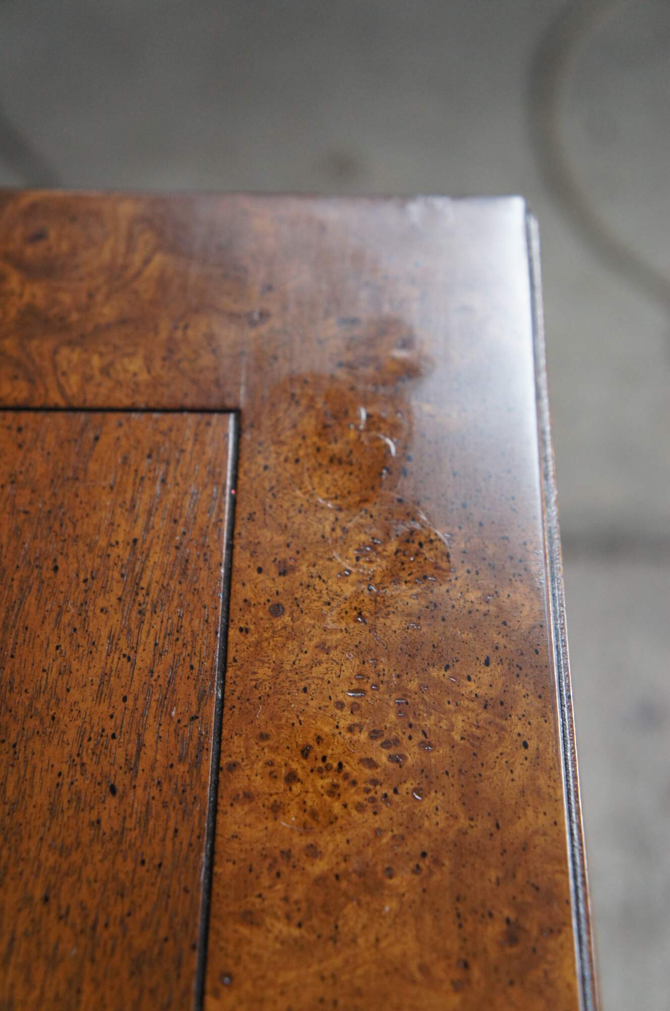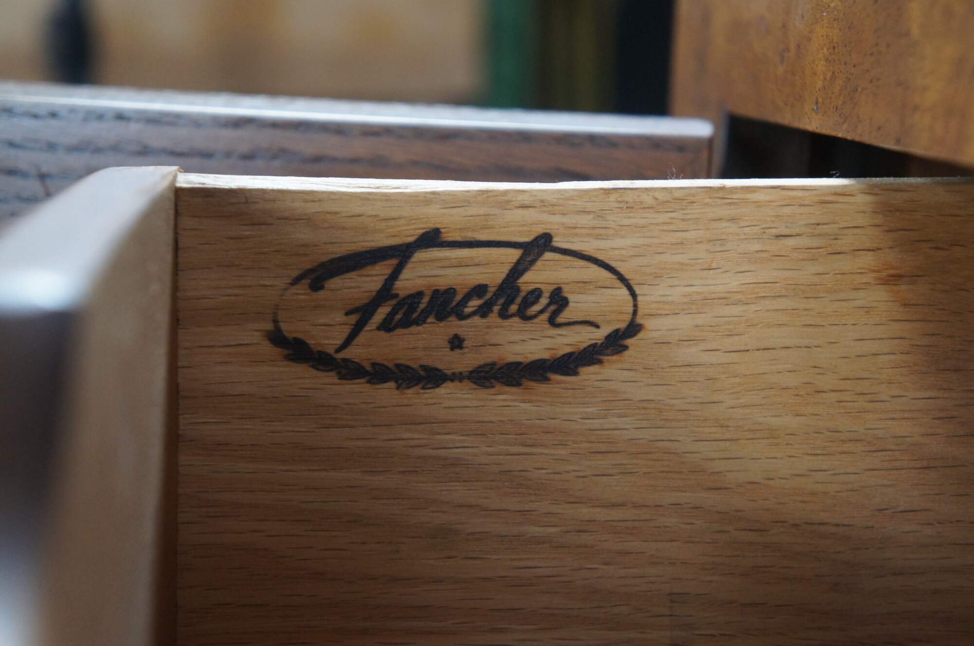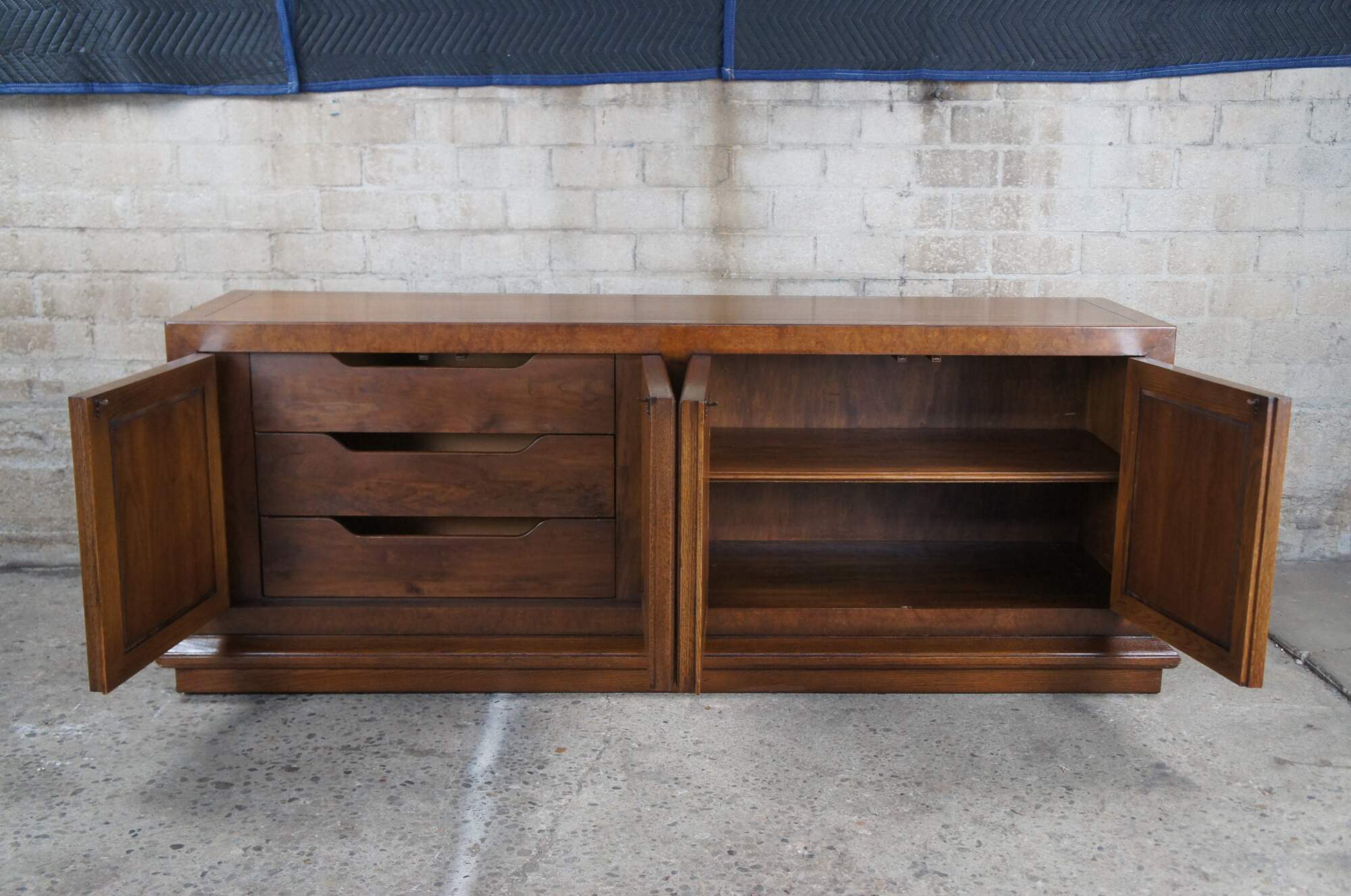 Vintage Italian Provincial console or credenza by Fancher Furniture, cica 1970s. A rectangular form made from walnut with burled accents. Features four acanthus carved doors that open to three dovetailed drawers along the left and storage to the right