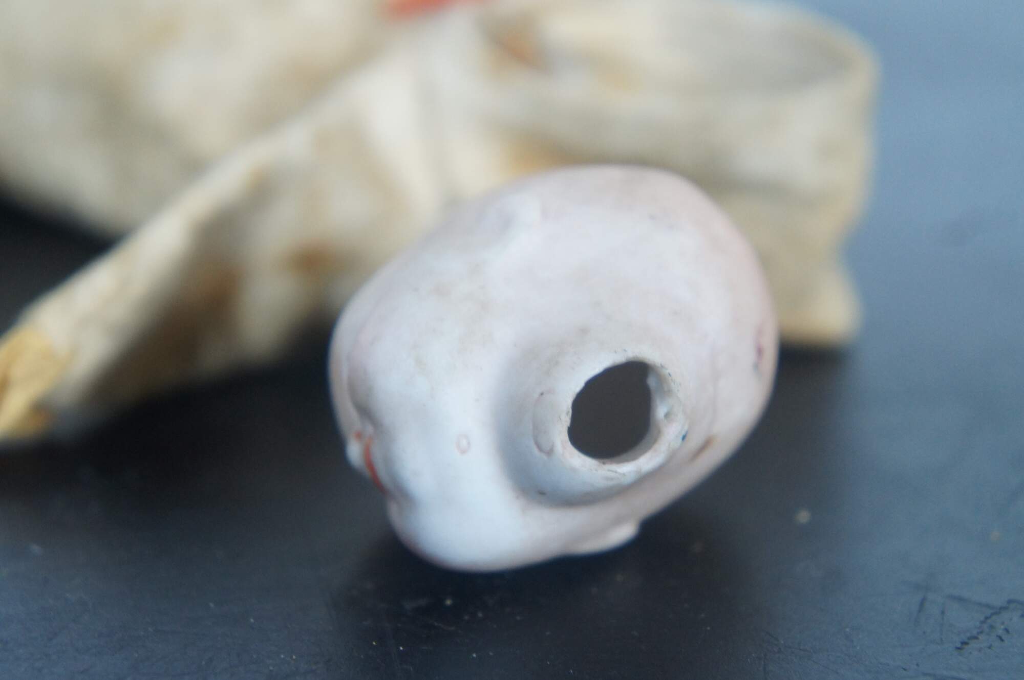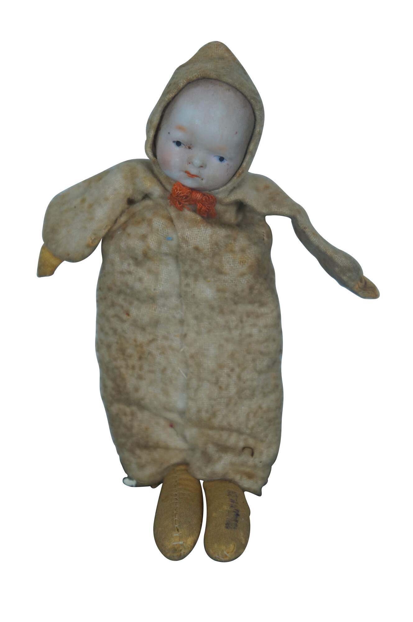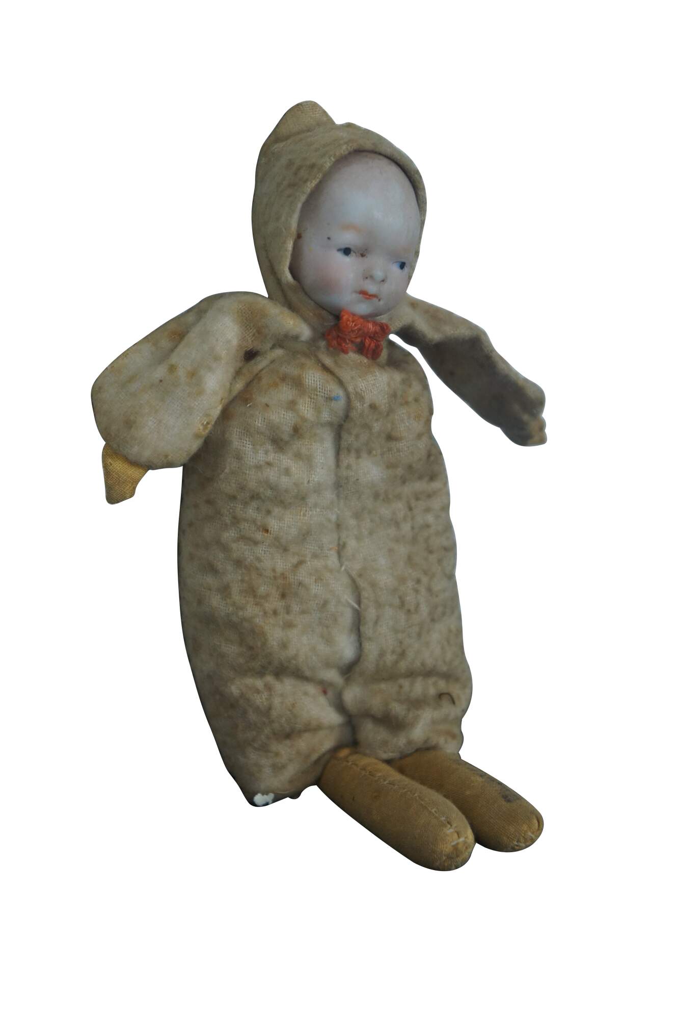 Antique bisqe doll. Features painted features, flannel and linen body stuffed with straw