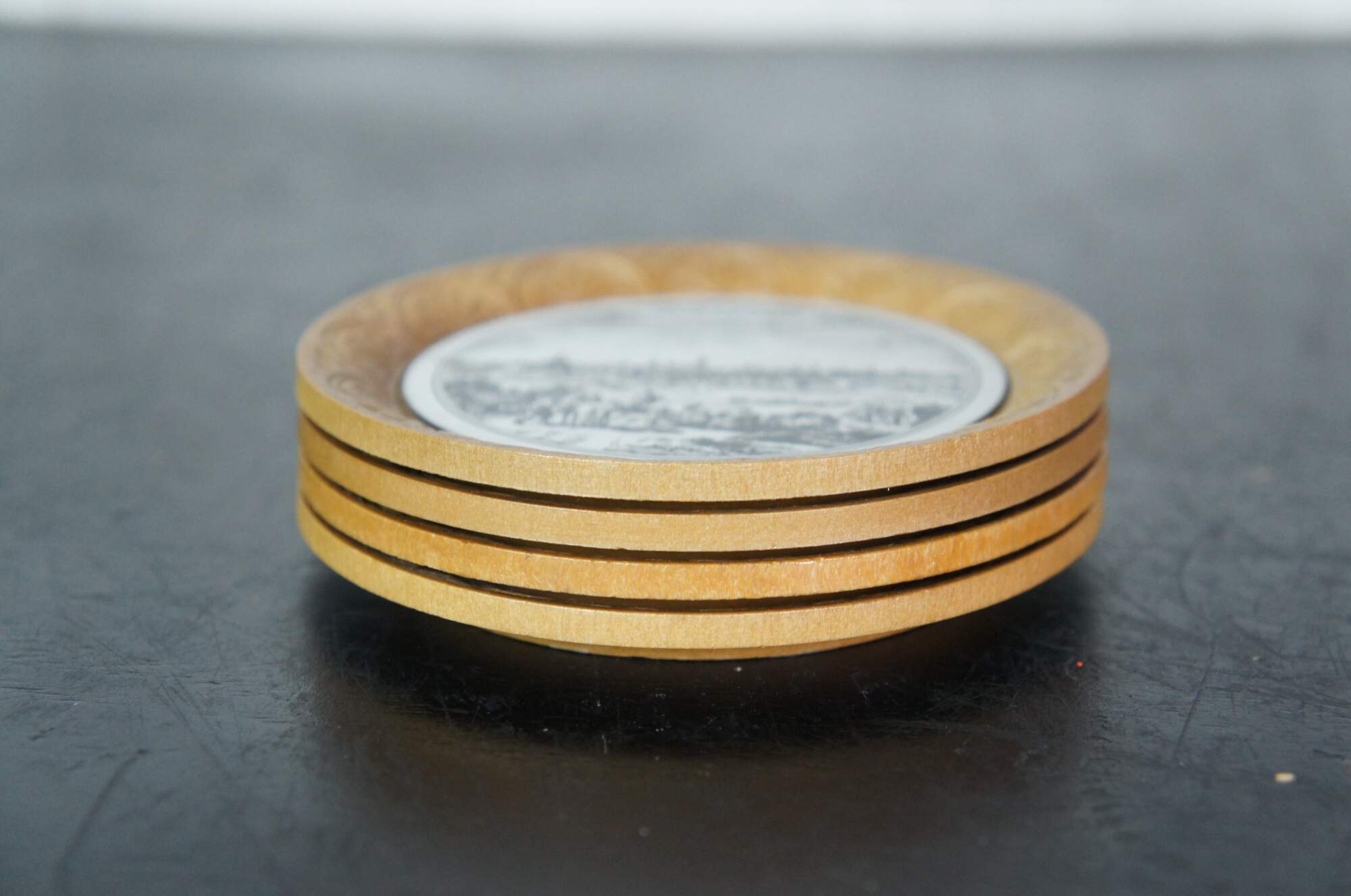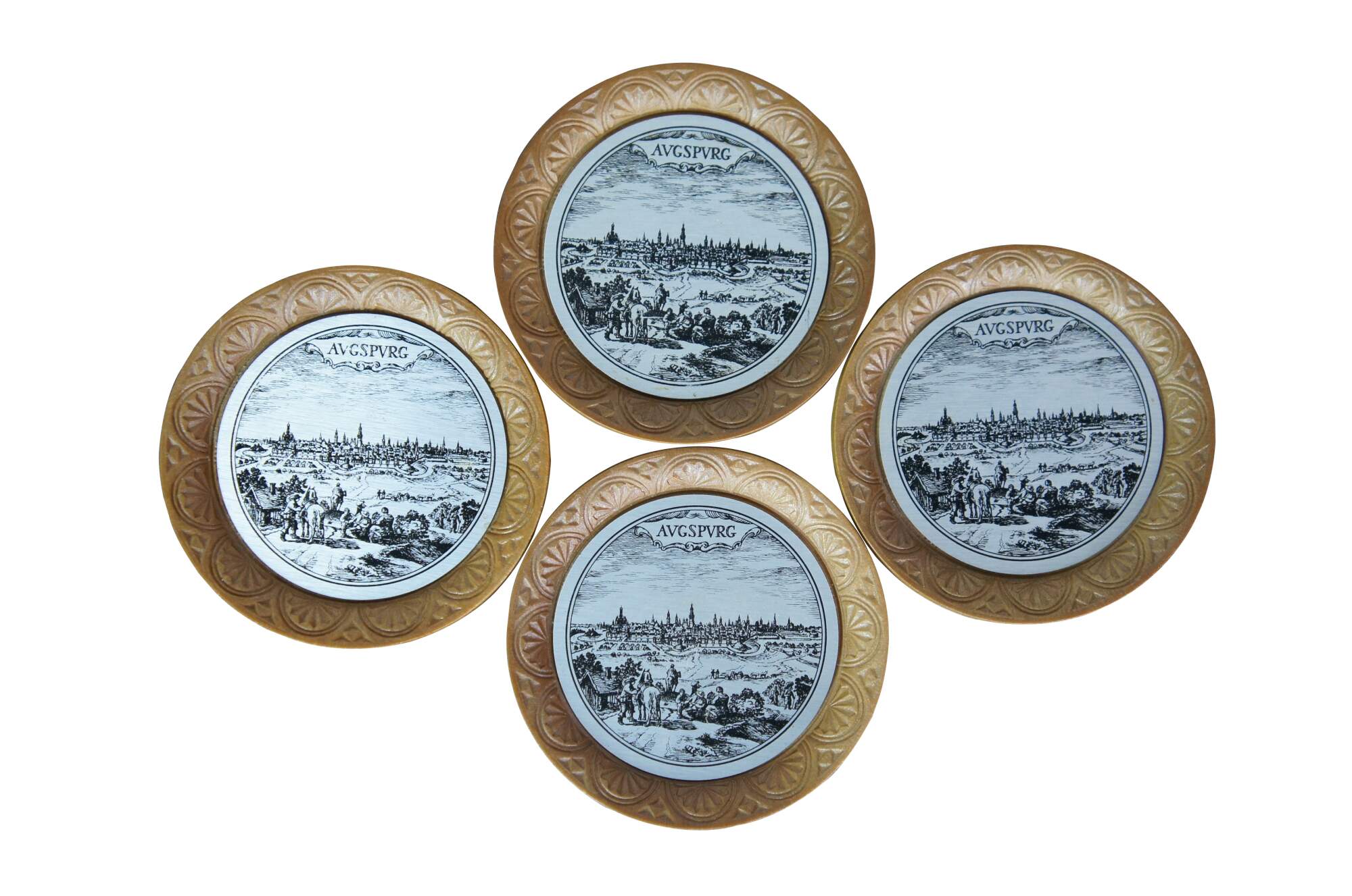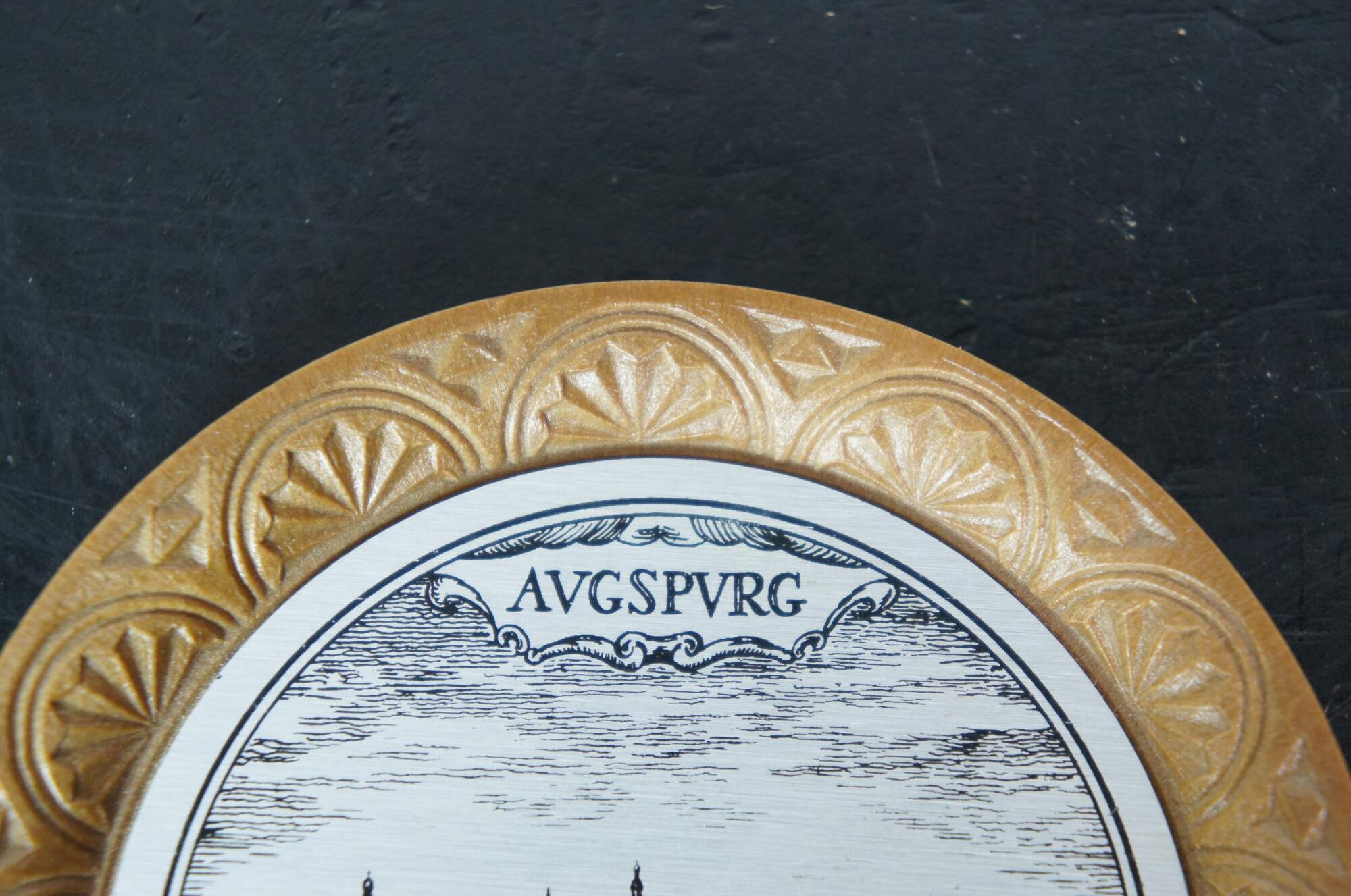 Set of 4 circa mid 20th century German souvenir drink coasters - round faux wood with "carved" scallop and star design surround an etched metal inlay showing an antique landscape view of Augsburg, Germany. Marked Desco Al Ma Rose - Made in Italy on reverse.
