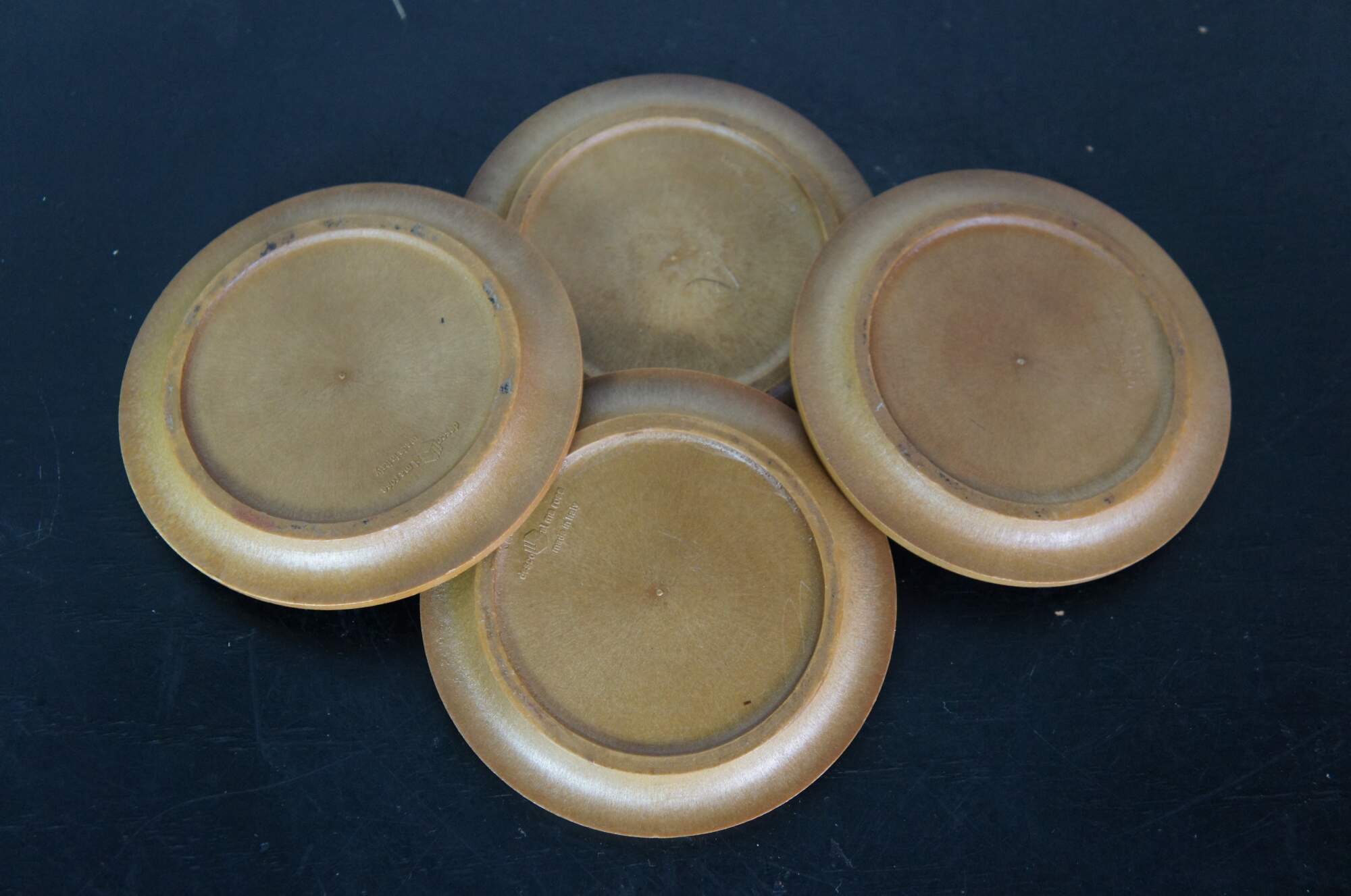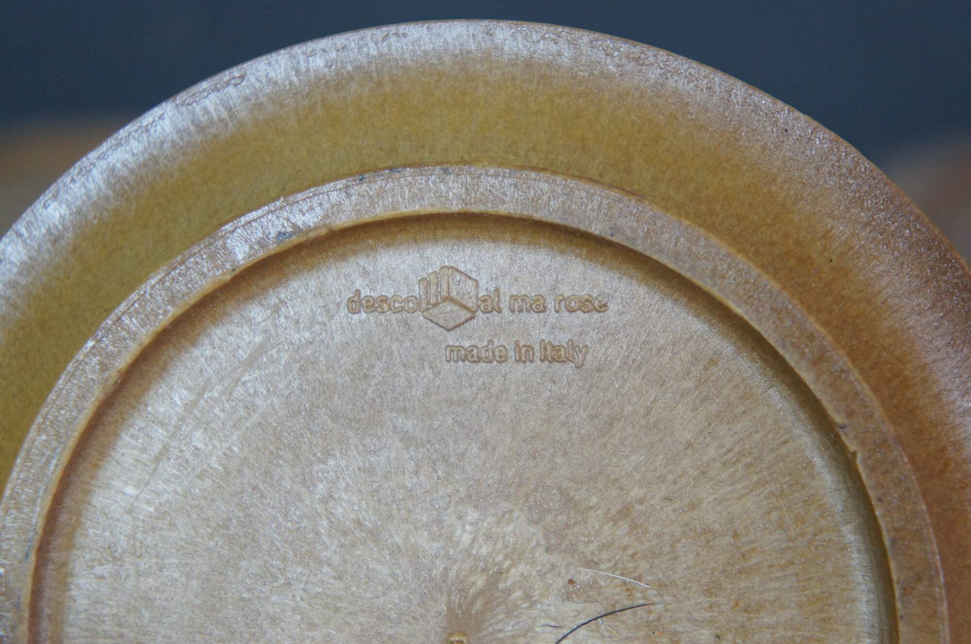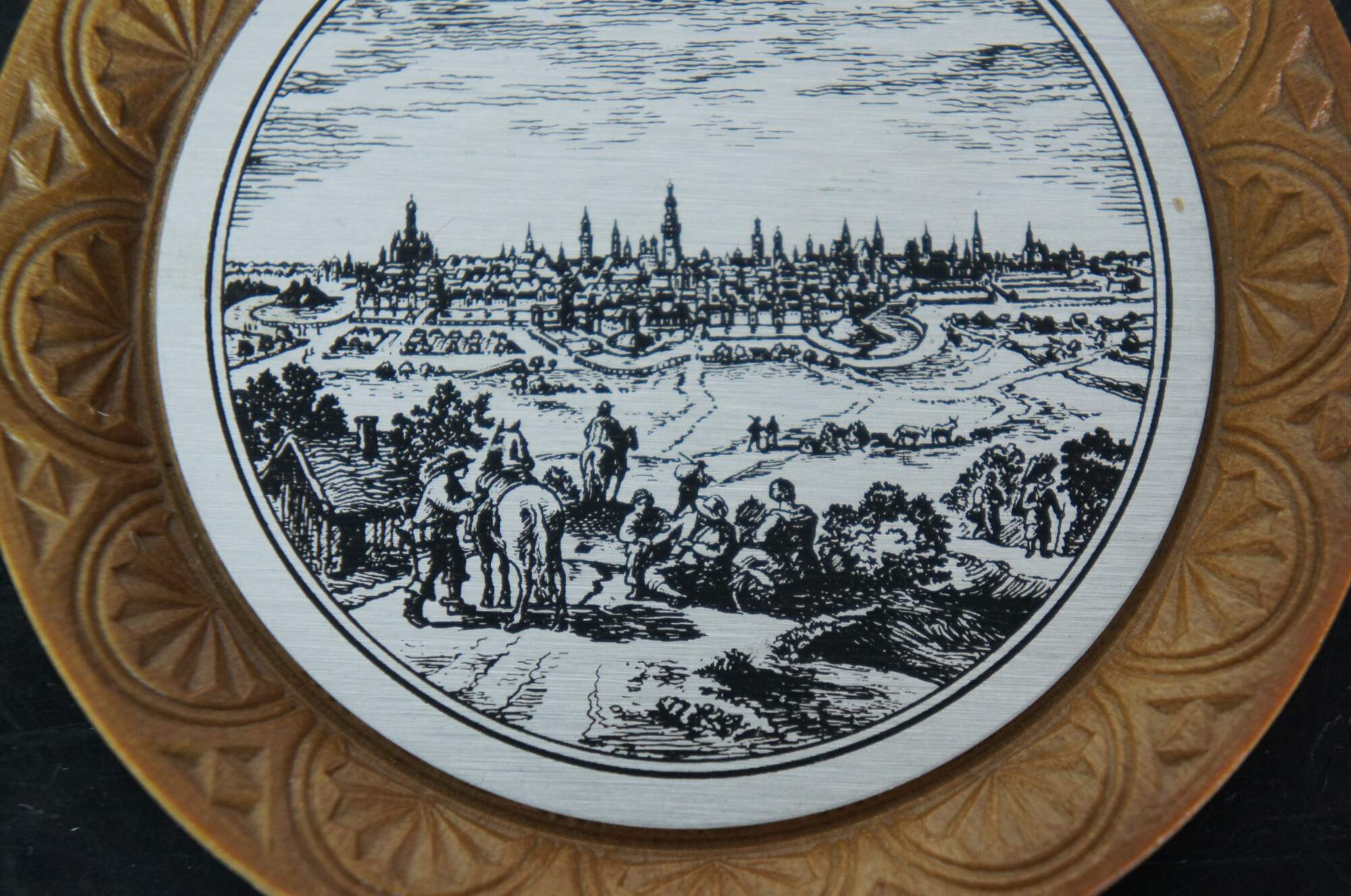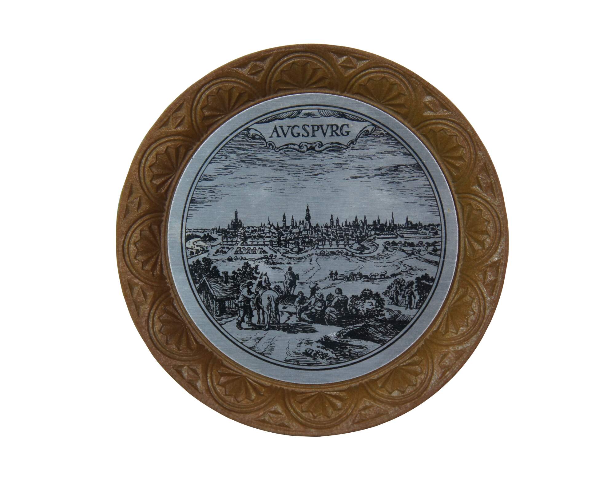Set of 4 circa mid 20th century German souvenir drink coasters - round faux wood with "carved" scallop and star design surround an etched metal inlay showing an antique landscape view of Augsburg, Germany. Marked Desco Al Ma Rose - Made in Italy on reverse.