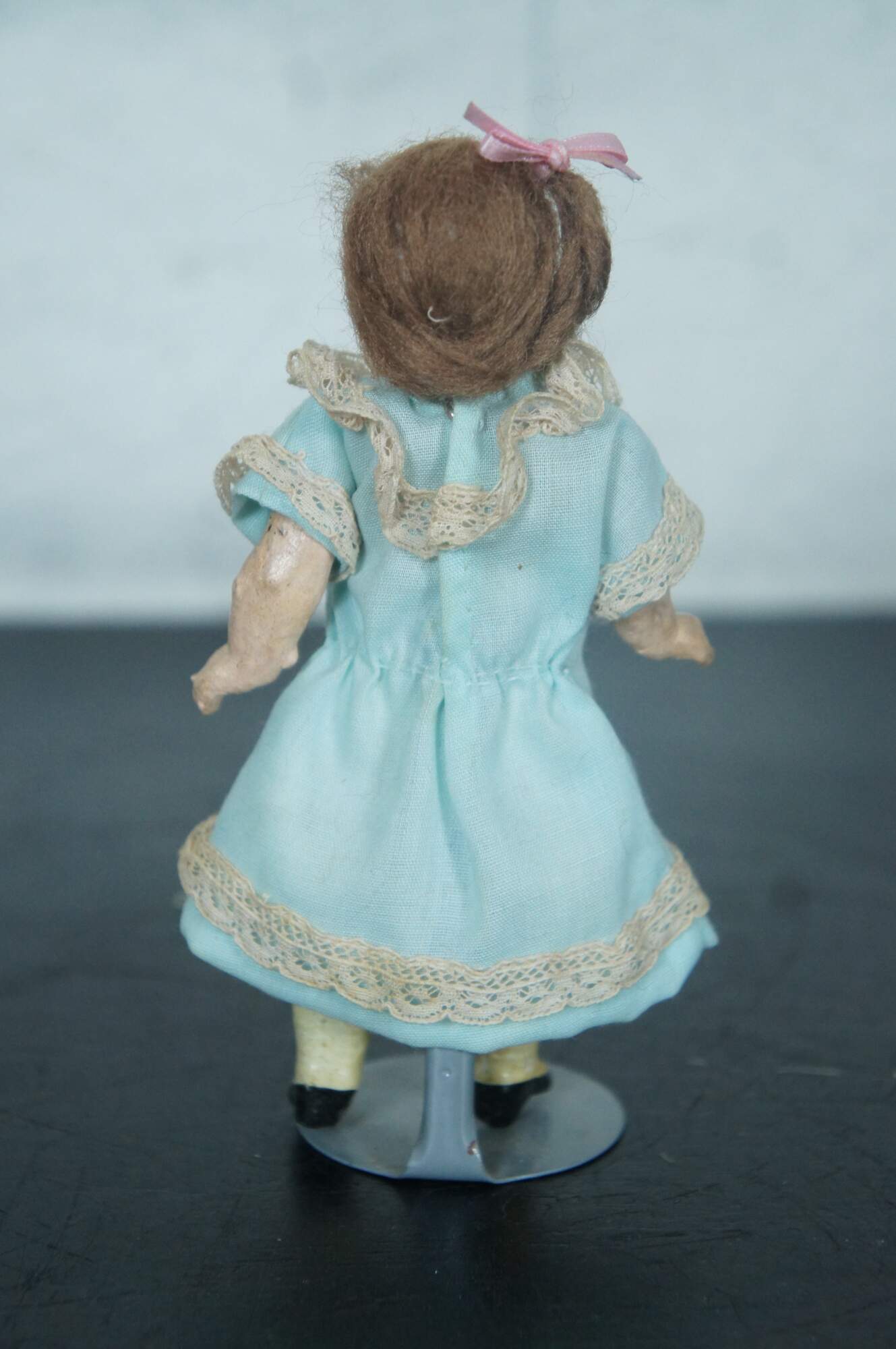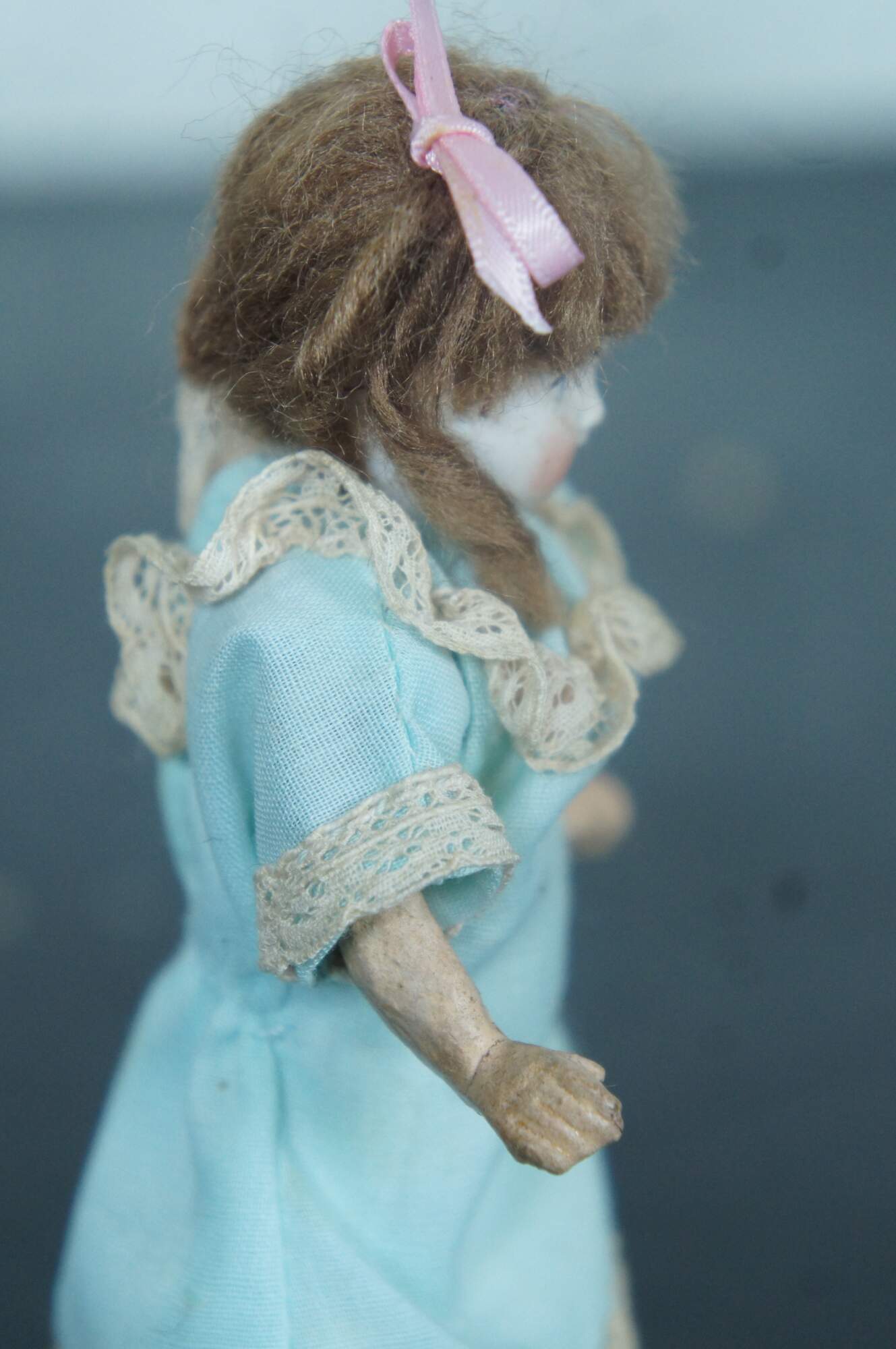 bisque head, painted features, fiber hair, composition body with articulated limbs. Dressed in a blue cotton dress with lace trim.