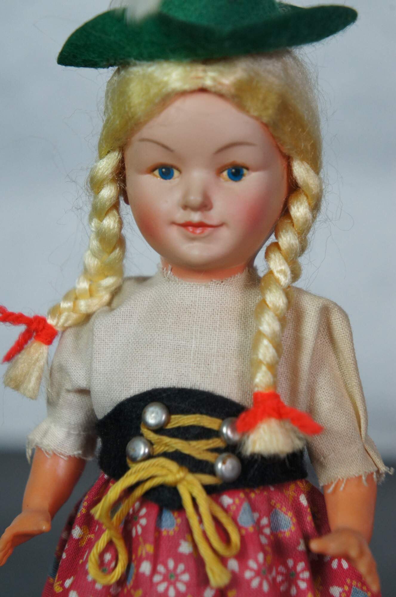 Pair of mid to late 20th century celluloid souvenir doll in traditional German folk costumes / Octoberfest attire. Boy attributed to Schneider Trachten - features molded hair and sleepy eyes. Girl has painted features and synthetic hair.