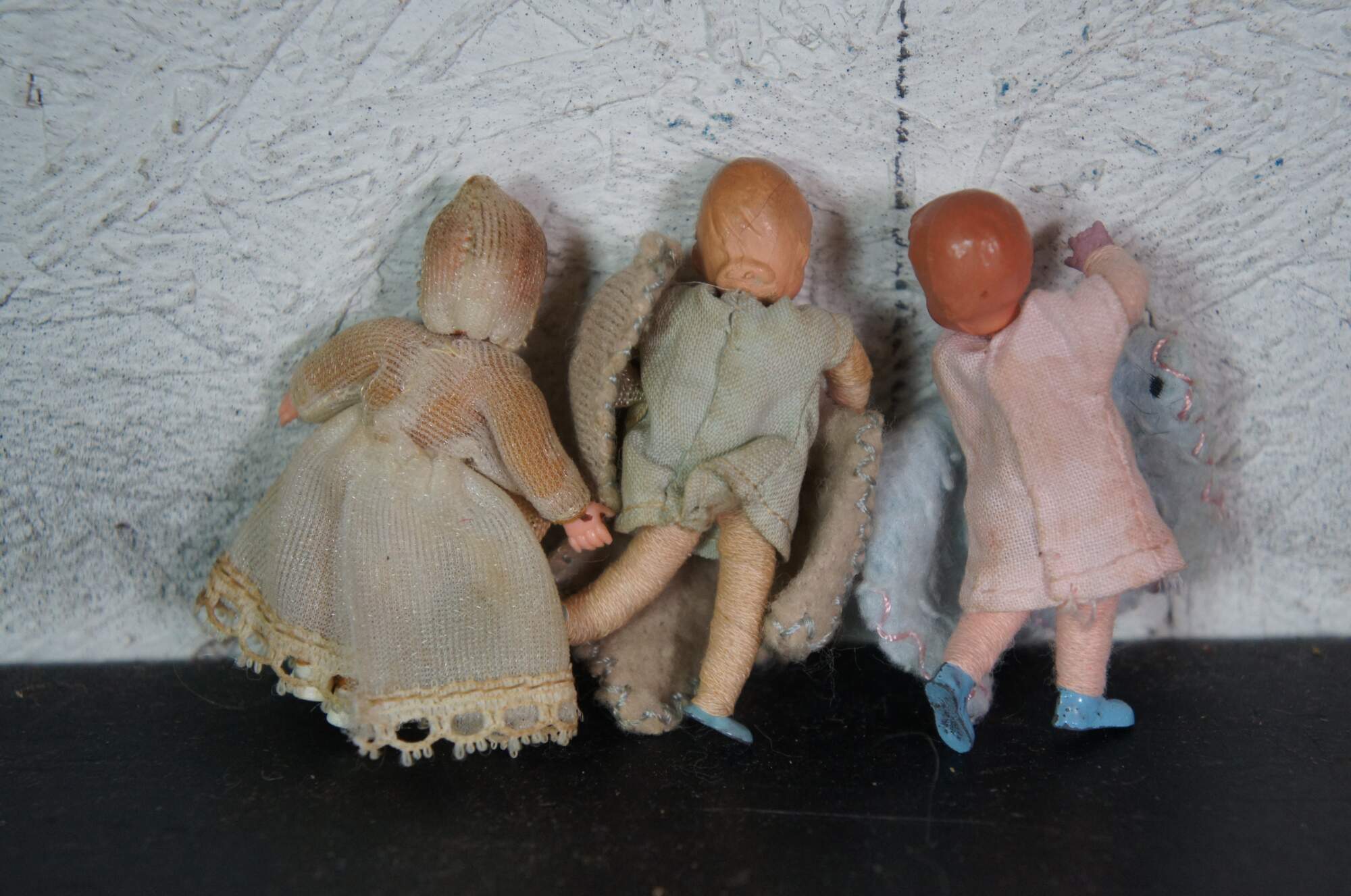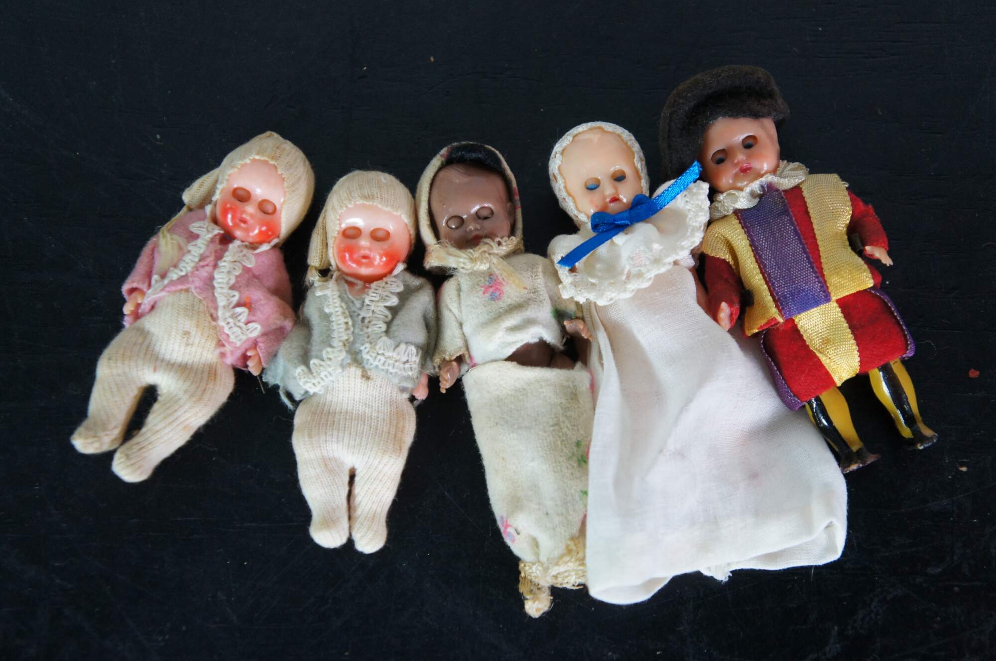 Lot of 12 early to mid 20th century celluloid and composition miniature baby dolls. Five with sleep eyes. Kewpie, Swiss Guard, folk costumes.