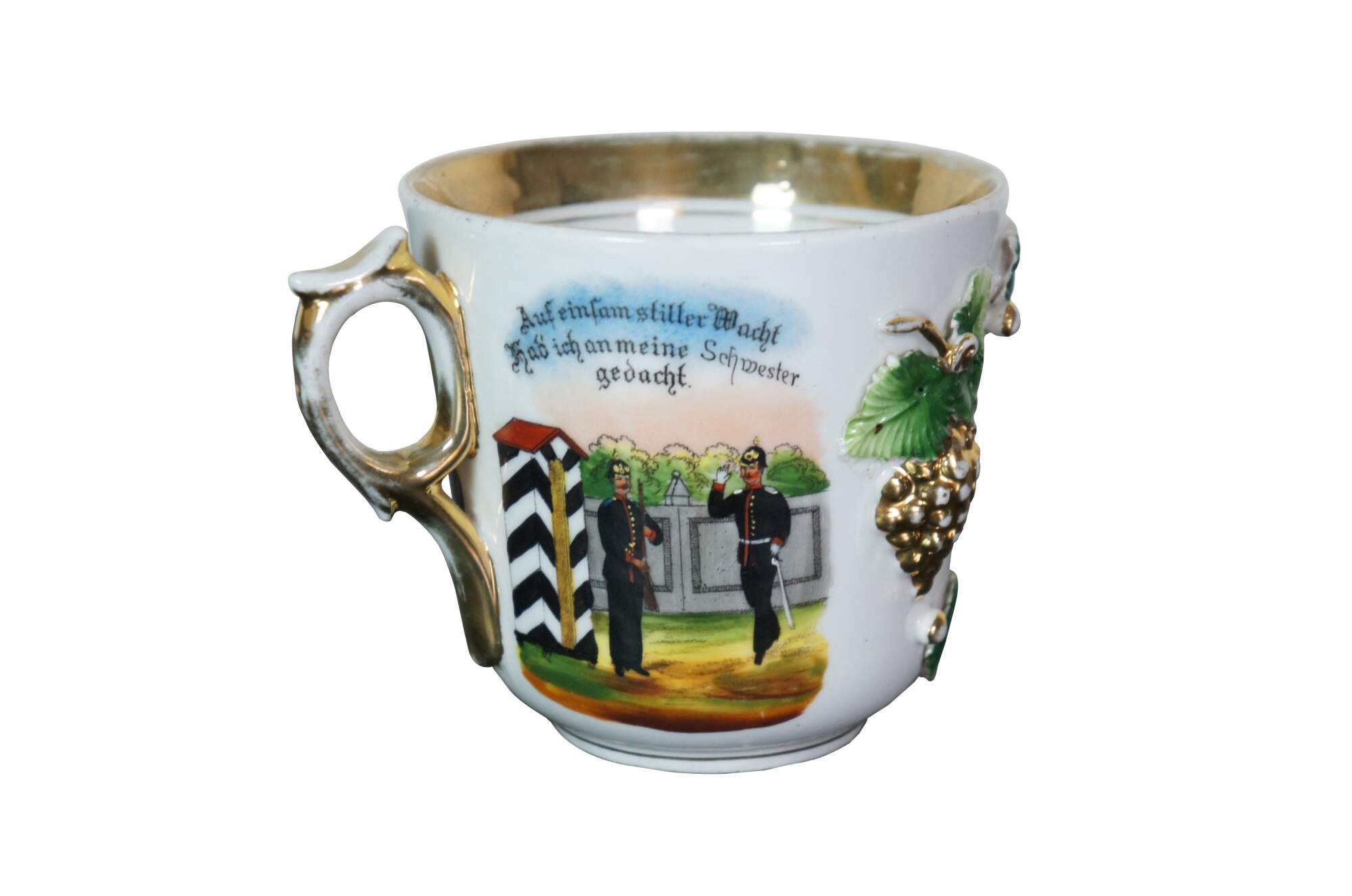 Antique World War I military souvenir / presentation cup / mug - personalized as memnto for a soldier's sister. Molded porcelain with a gilt imperial crown and bunches of leaves and grapes, framing a personalized inscription on the front (approximately "A souvenir for my sister" and a name) and a pair of images / scenes on the sides, with the phrases "Auf einfam stiller Wacht Hab ich an meine Schmester gedacht." (I thought about my sister in a very quiet wake.) and "Froh erroche jeden Morgen Drink Dein Kaffee ohne Sorgen." (Happy to drink your coffee every morning without any worries.)