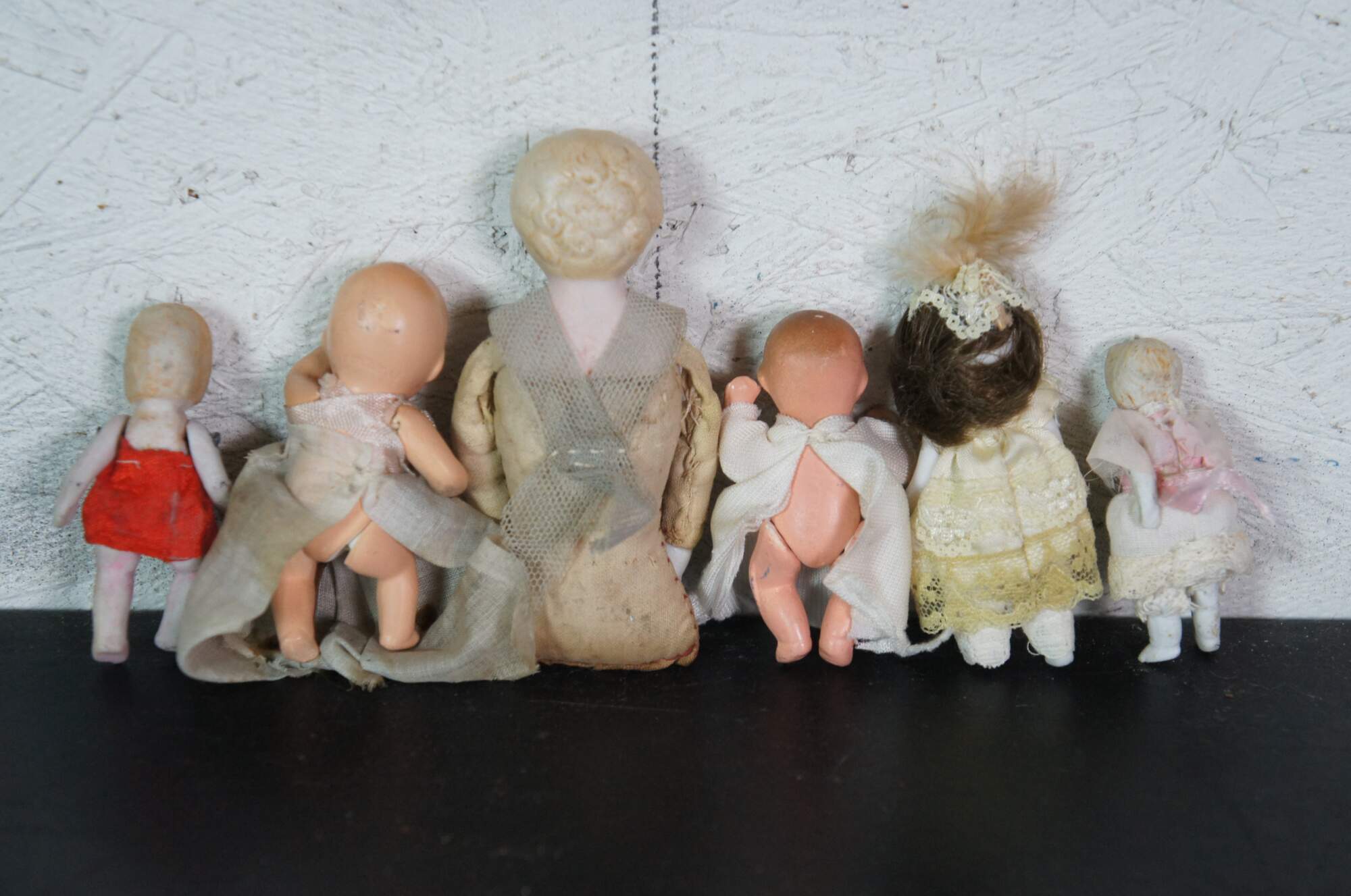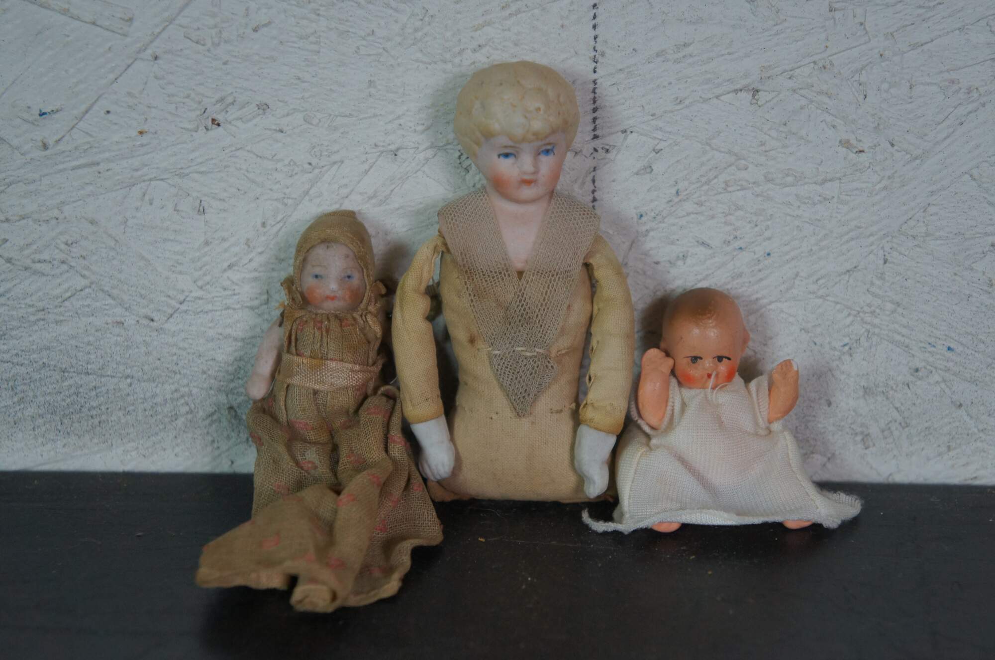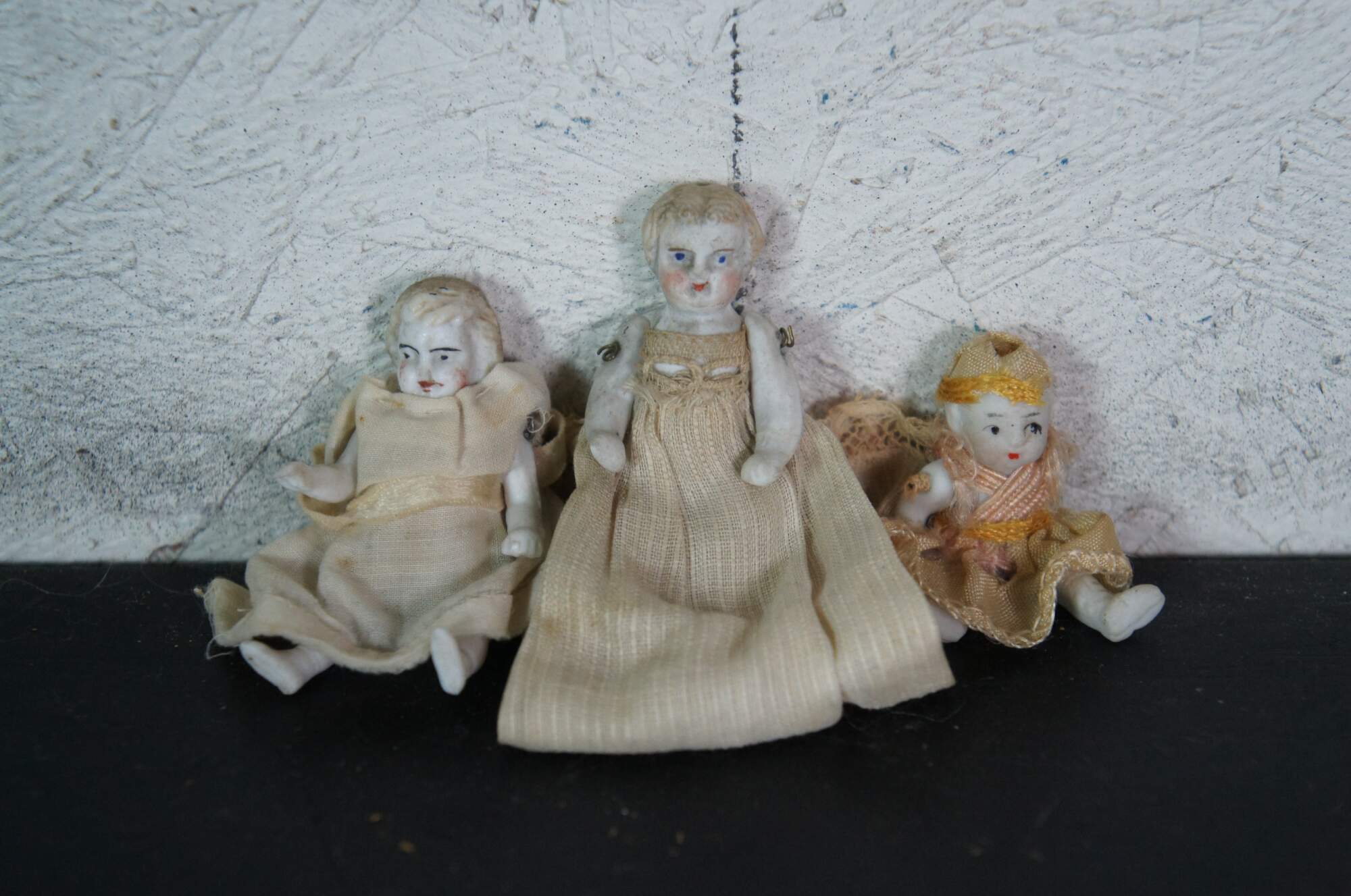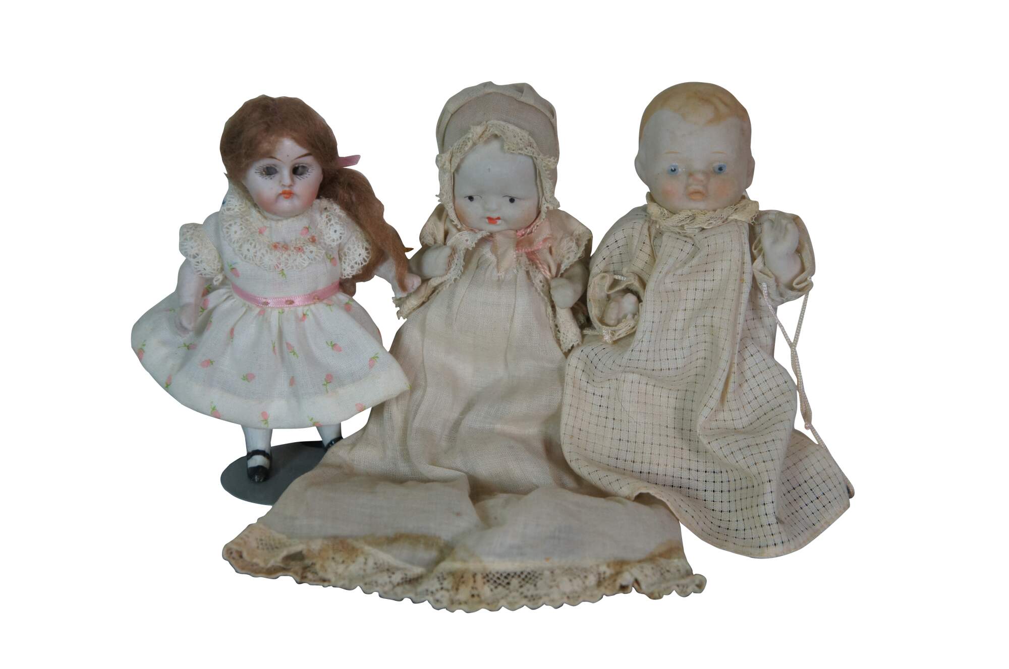 Lot of 19 late 19th to early 20th century bisque and porcelain miniature china dolls. Some with fully painted features; some with hair; jointed limbs; majority include clothing. Germany, Japan and unmarked.
