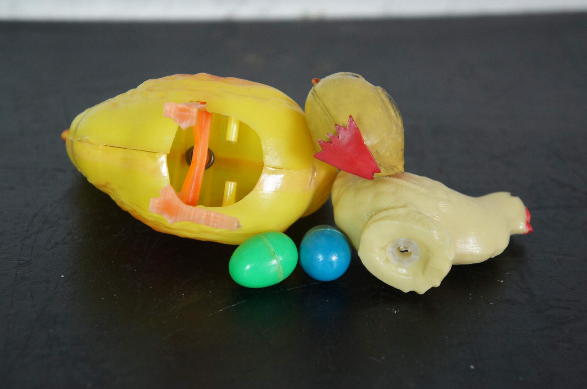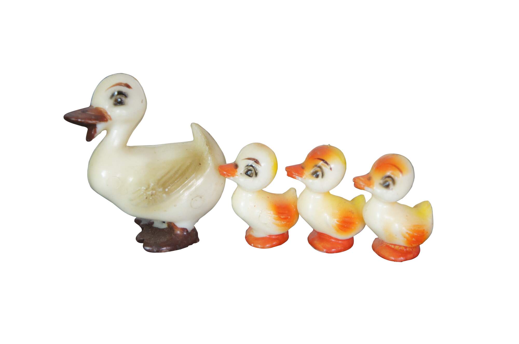 Lot of 6 vintage plastic chickens and ducks. Includes Wilton mother duck and three ducklings, one fat chick, one squeaking chicken, and one egg laying chicken with two eggs.