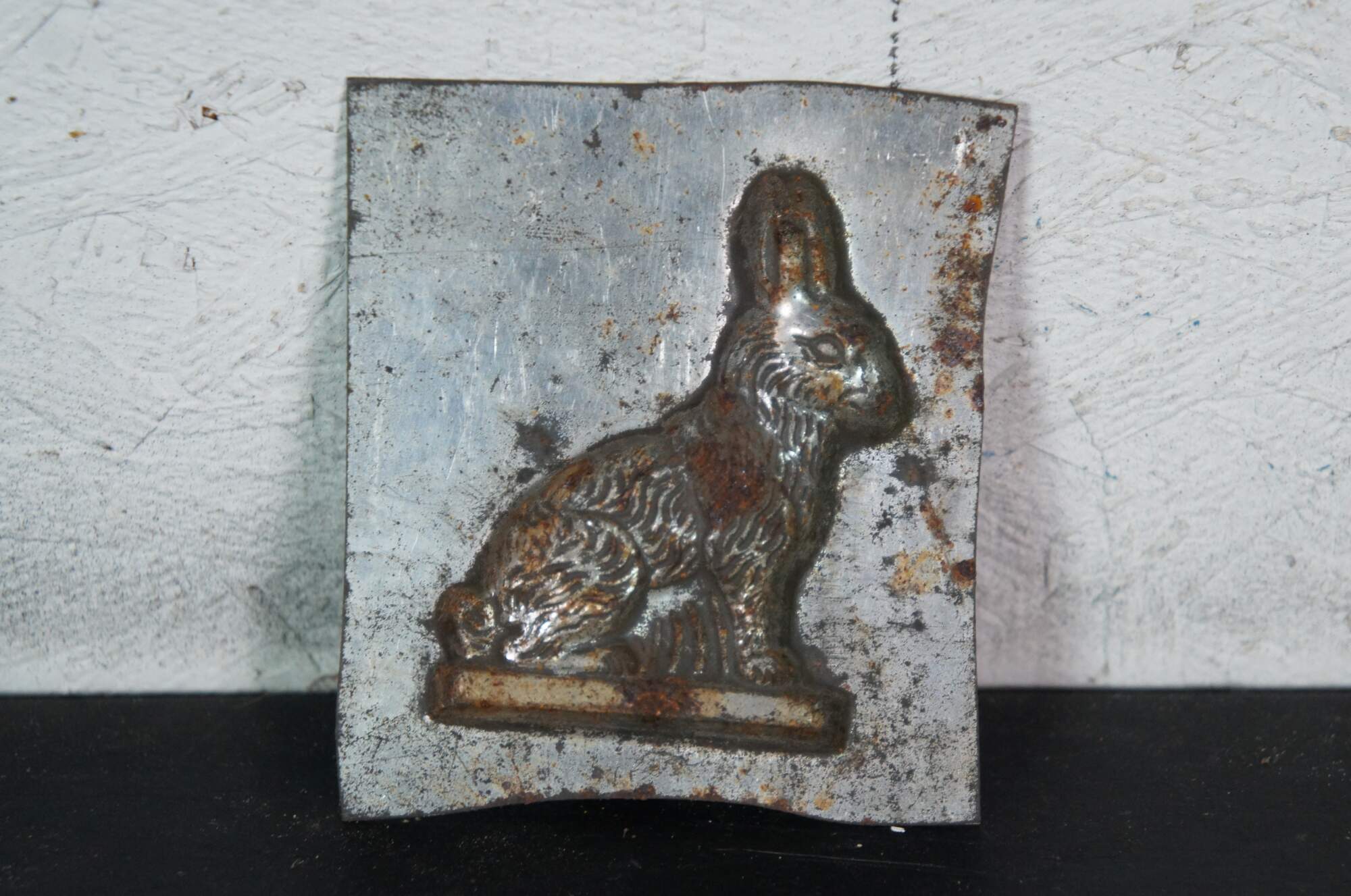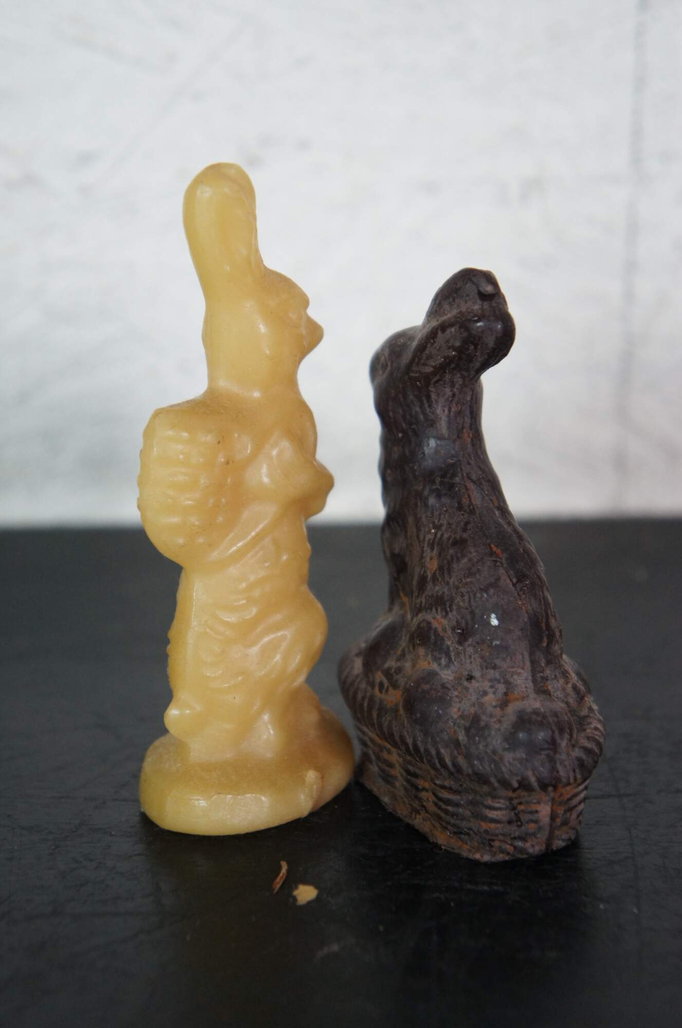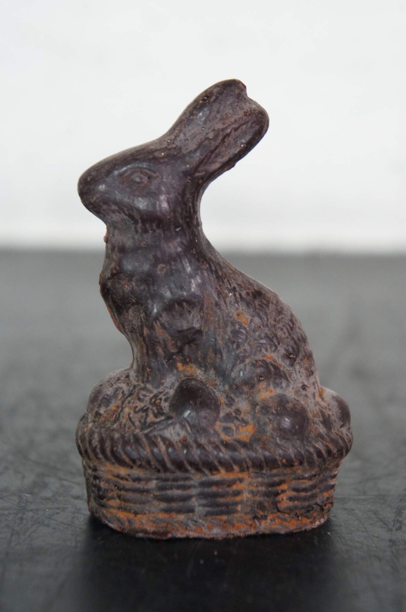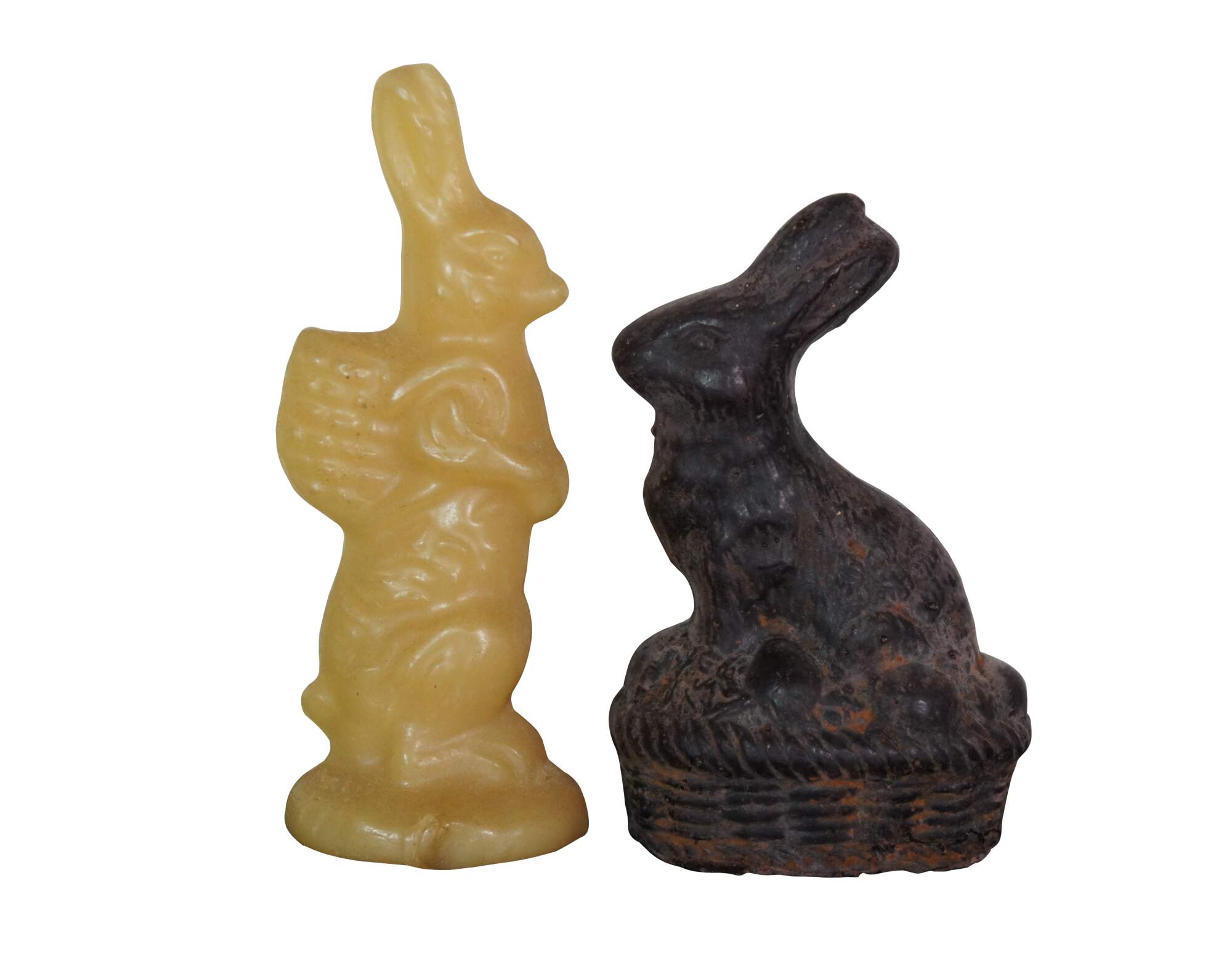Pair of early 20th century Easter Bunny / rabbit figurines - one in undyed beeswax, standing on its haunches with a basket on its back; the other colored brown to imitate chocolate, seated in a basket of eggs - and one half of a tin chocolate or cookie mold showing a seated rabbit on a rectangular plinth.