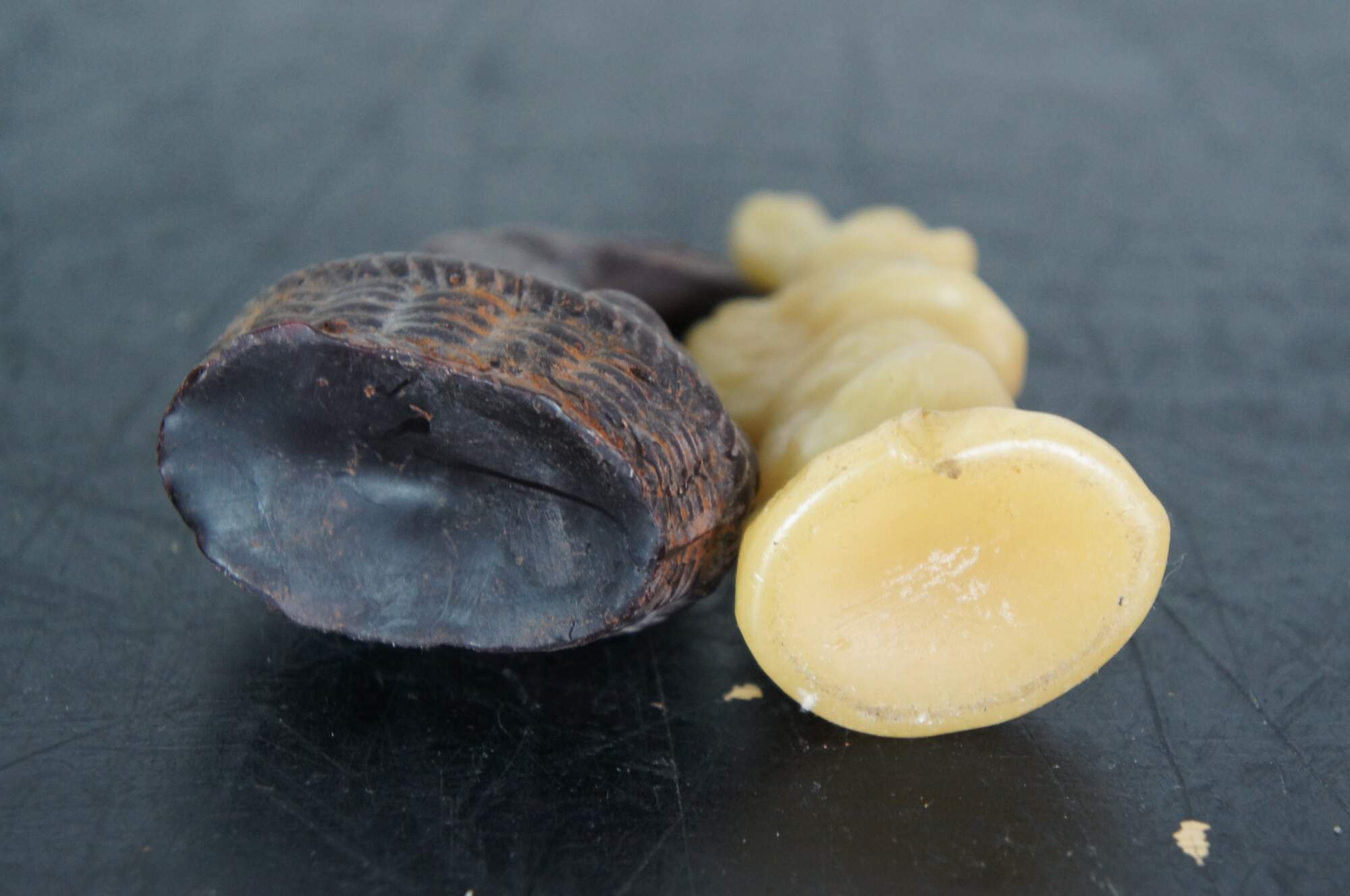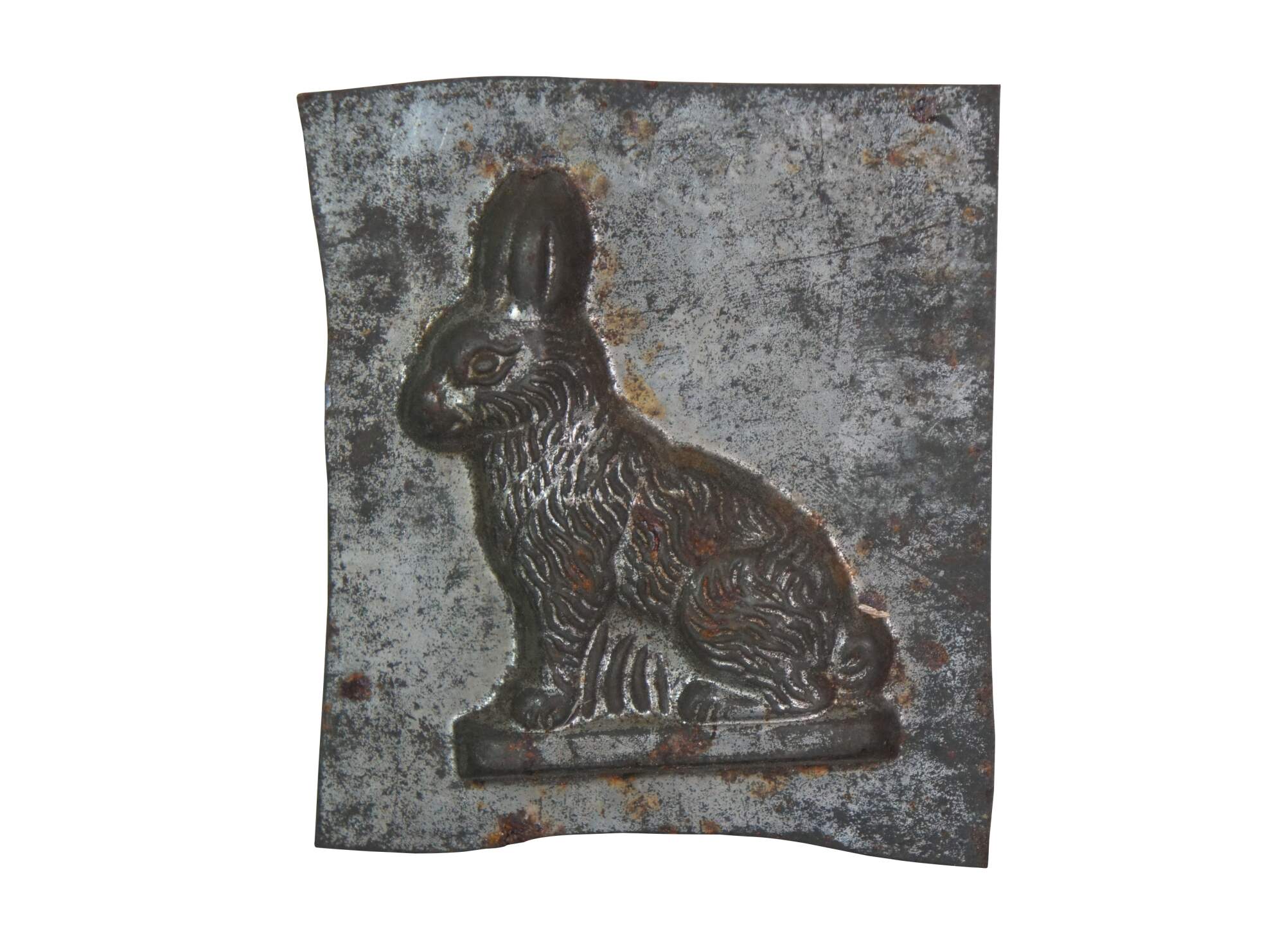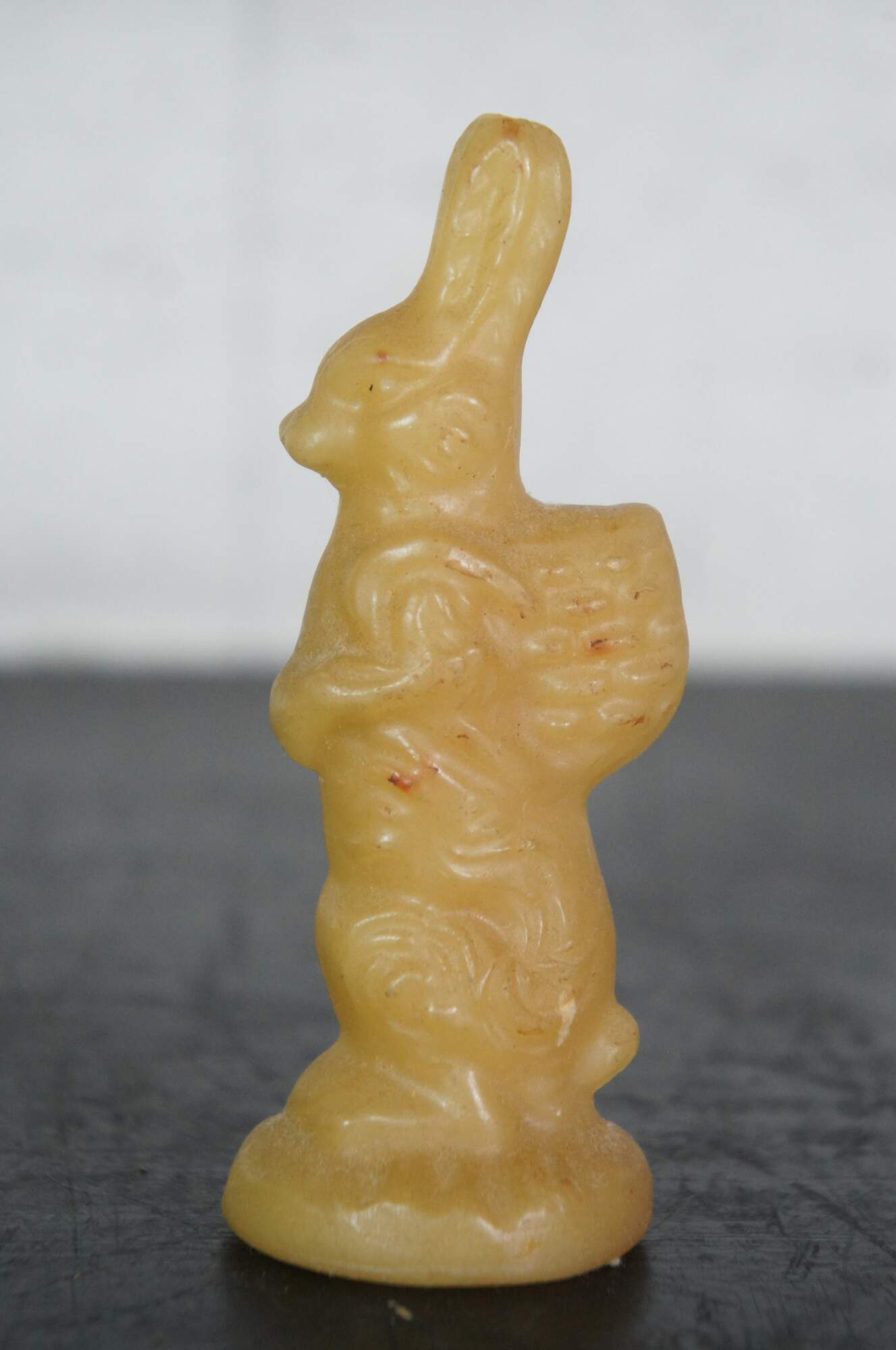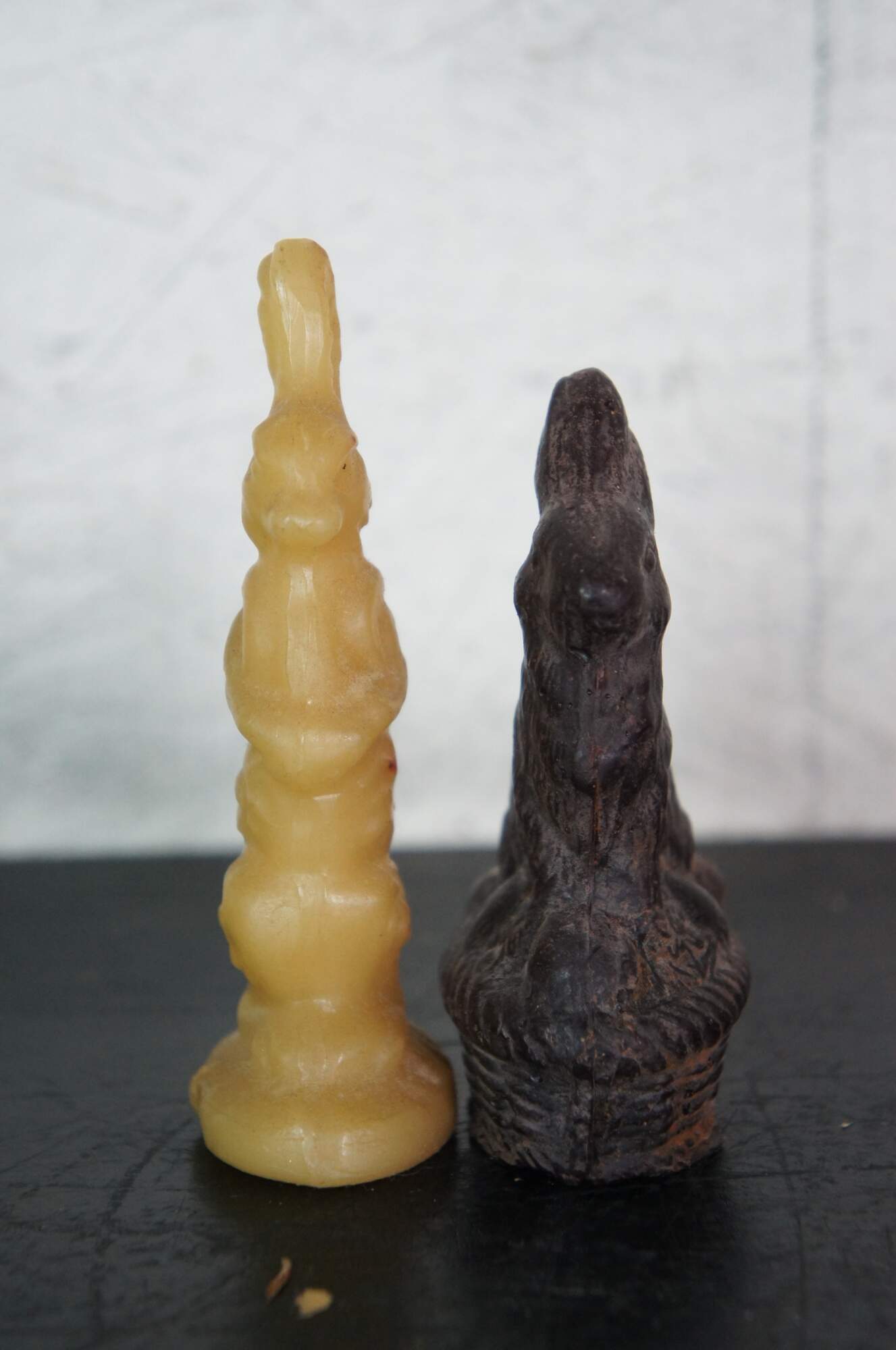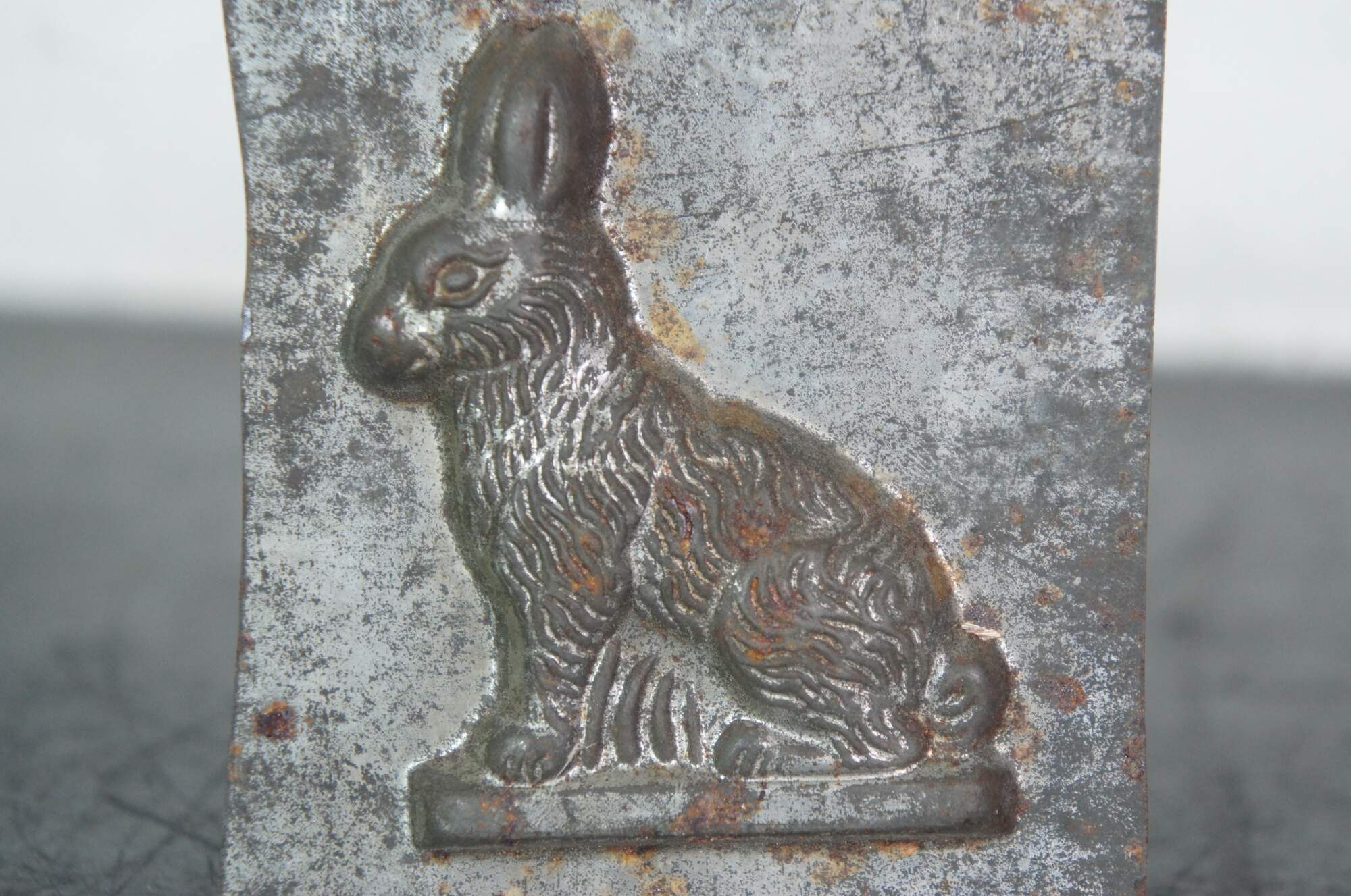 Pair of early 20th century Easter Bunny / rabbit figurines - one in undyed beeswax, standing on its haunches with a basket on its back; the other colored brown to imitate chocolate, seated in a basket of eggs - and one half of a tin chocolate or cookie mold showing a seated rabbit on a rectangular plinth.