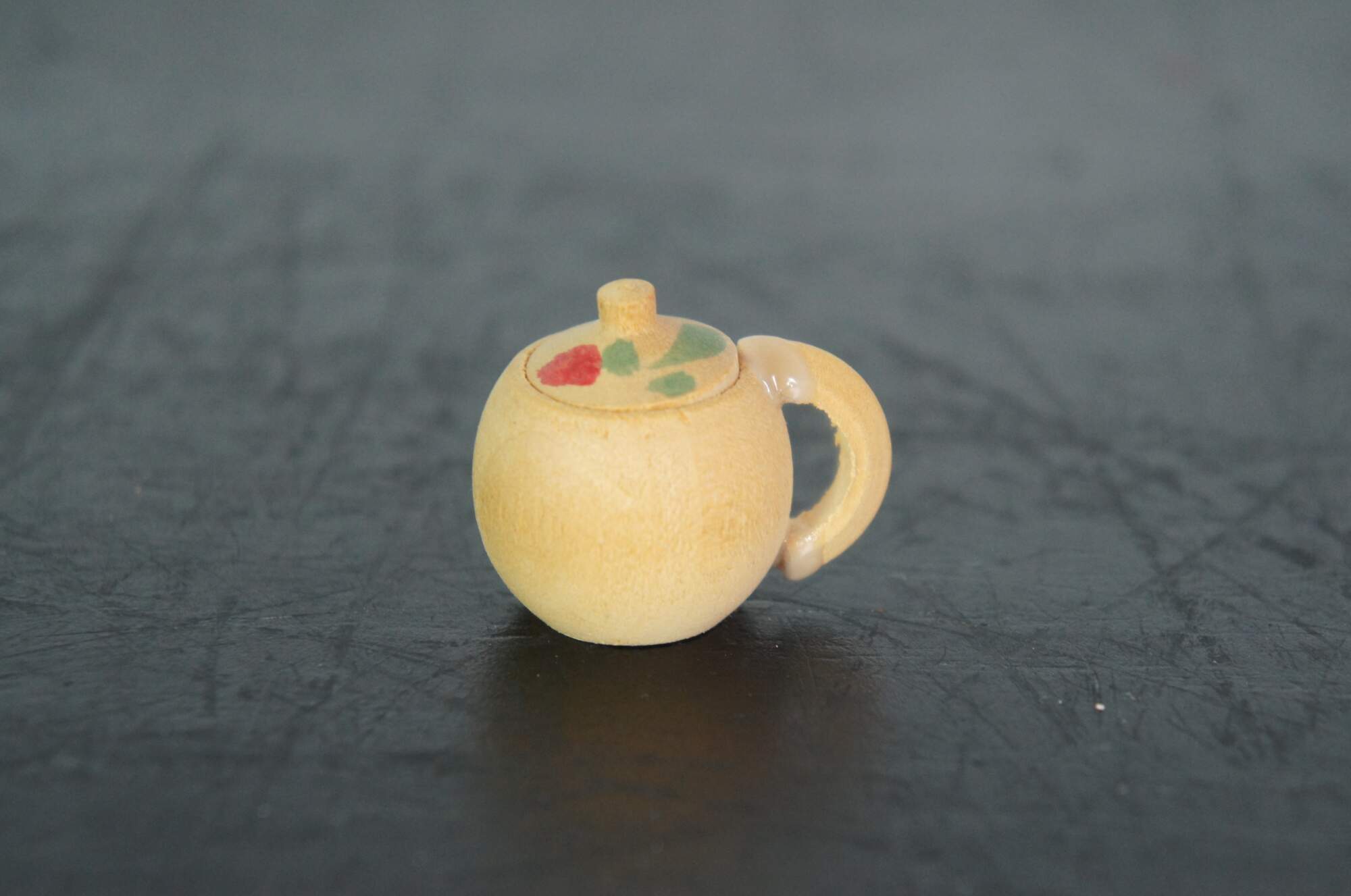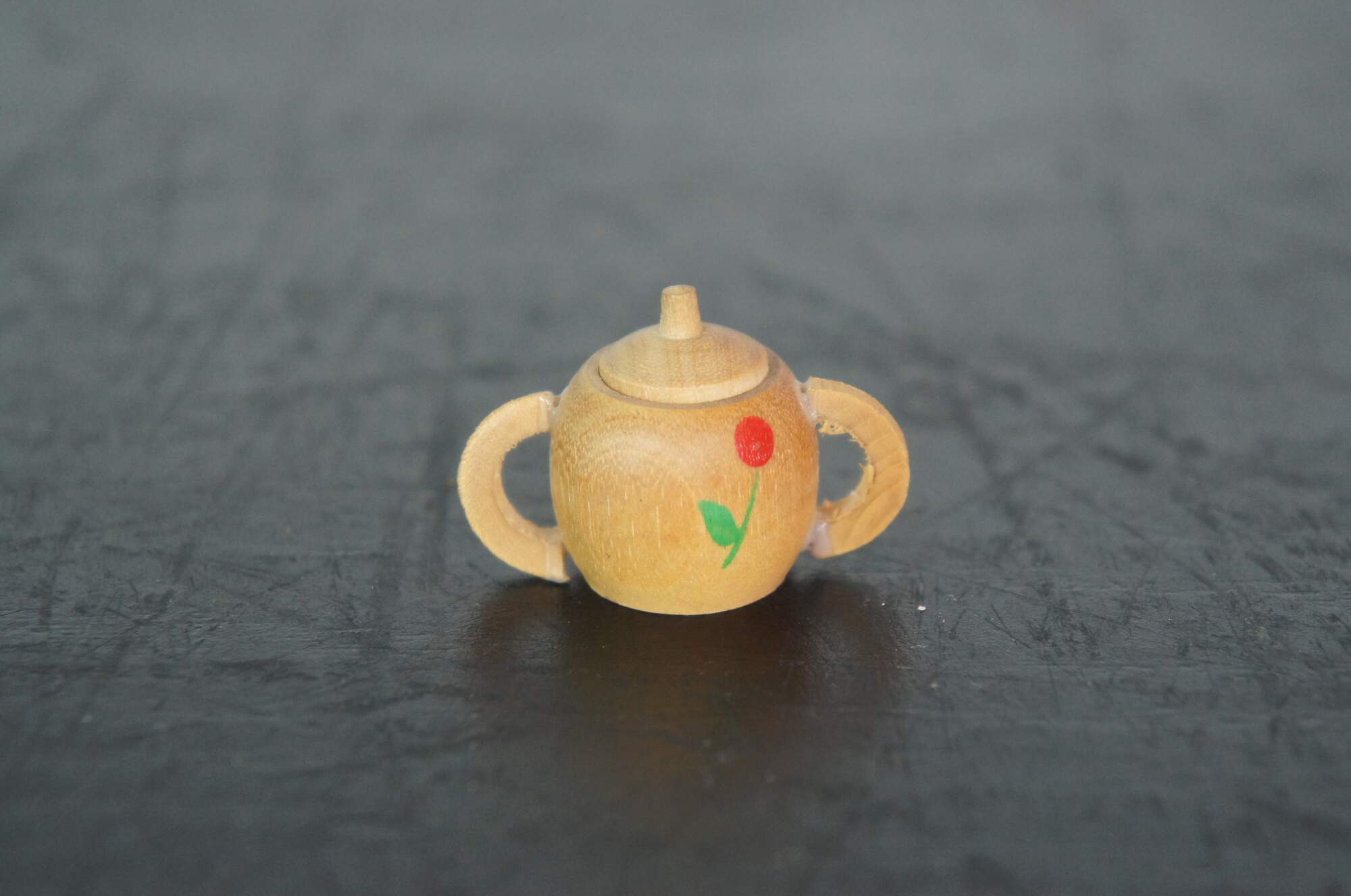 Mid 20th century miniature wooden tea set, mixed pieces from multiple sets, hand painted with tulip and apple motifs. Includes tulip table, round tray, tea pot, creamer, sugar bowl, waste bowl/cookie jar, four cups, two saucers, and two apples. Made in Japan.
