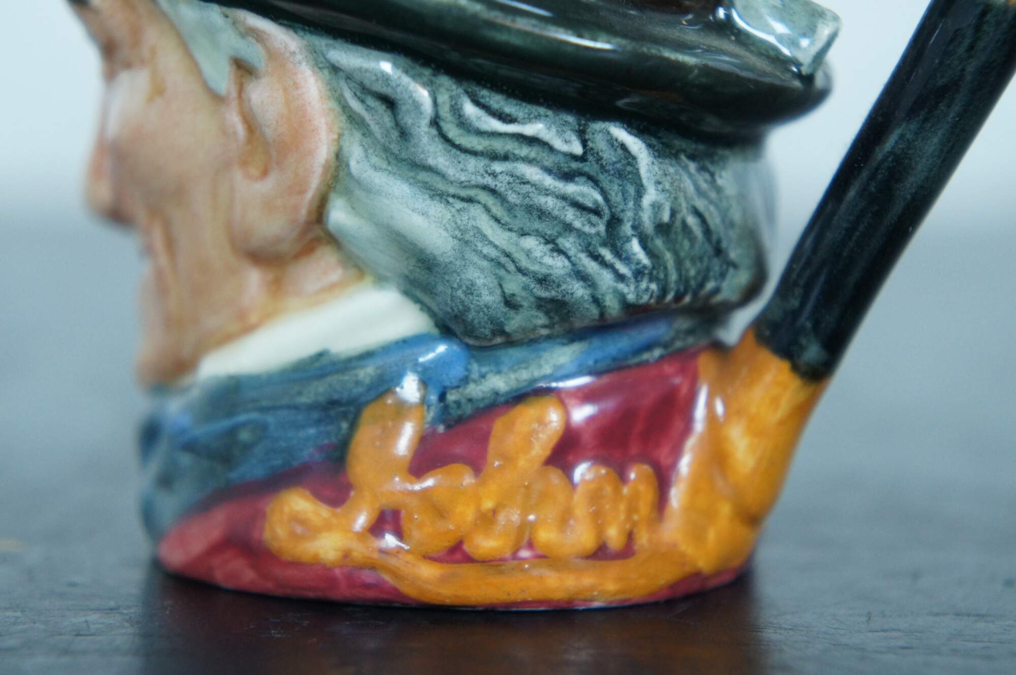 Mid Century Royal Doulton porcelain miniature Toby jug / character mug in the shape of John Peel. “John Peel (13th November 1776? – 13 November 1854) was an English huntsman who is the subject of the nineteenth century song "D'ye ken John Peel" - "ken" meaning 'to be aware of' or 'to know' in some dialects of the North of England and Scotland. a famous Cumberland hunting song written around 1824 by John Woodcock Graves (1795–1886) in celebration of his friend John Peel (1776–1854), an English fox hunter from the Lake District. The melody is said to be a contrafactum of a popular border rant, "Bonnie Annie." A different version, the one that endures today, was musically adapted in 1869 by William Metcalfe (1829–1909), the organist and choirmaster of Carlisle Cathedral. The tune etymology has a long history that has been traced back to 1695 and attributed to adaptations – one in particular, from the 20th century, the 1939 jingle, "Pepsi-Cola Hits the Spot.