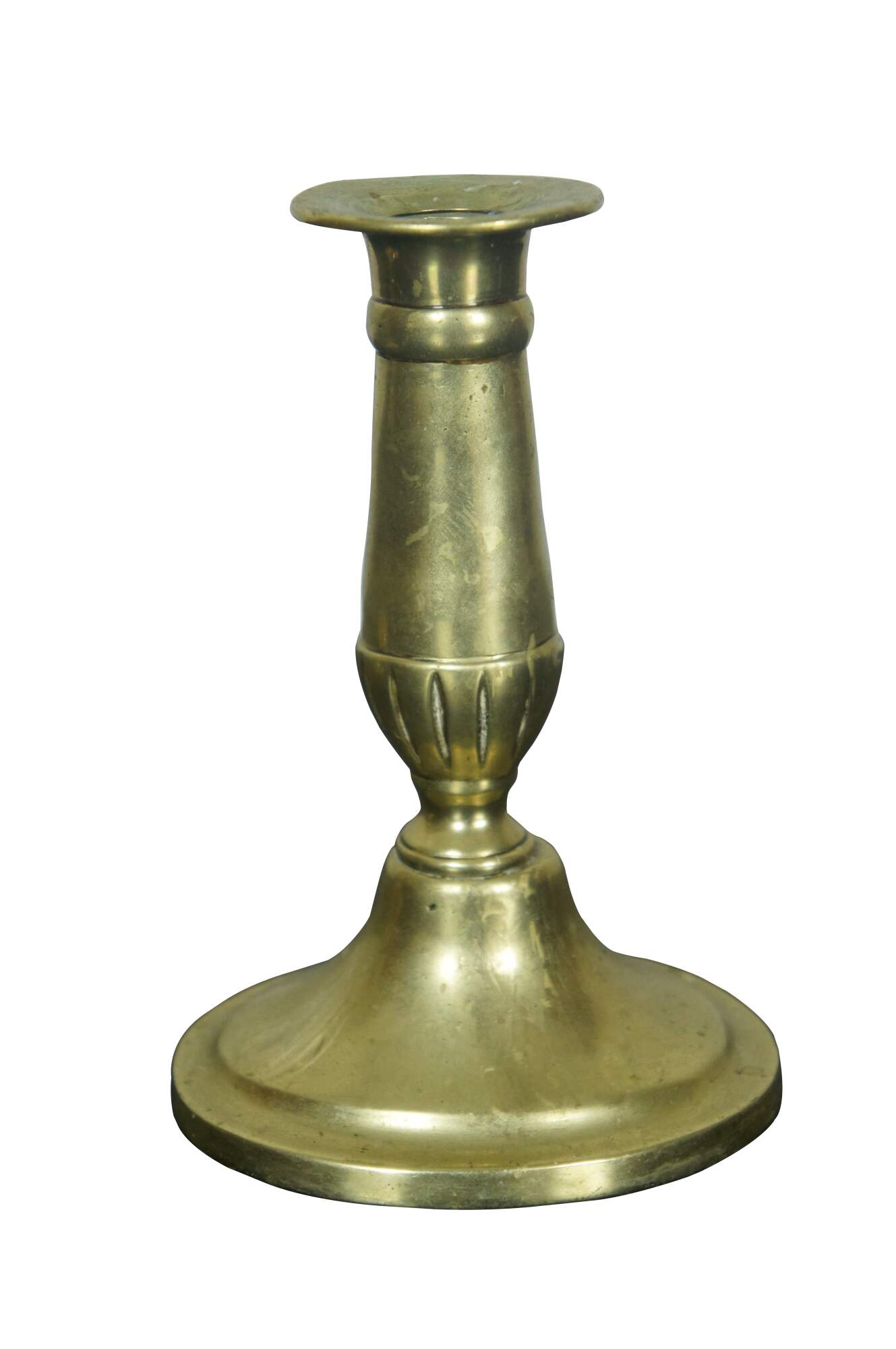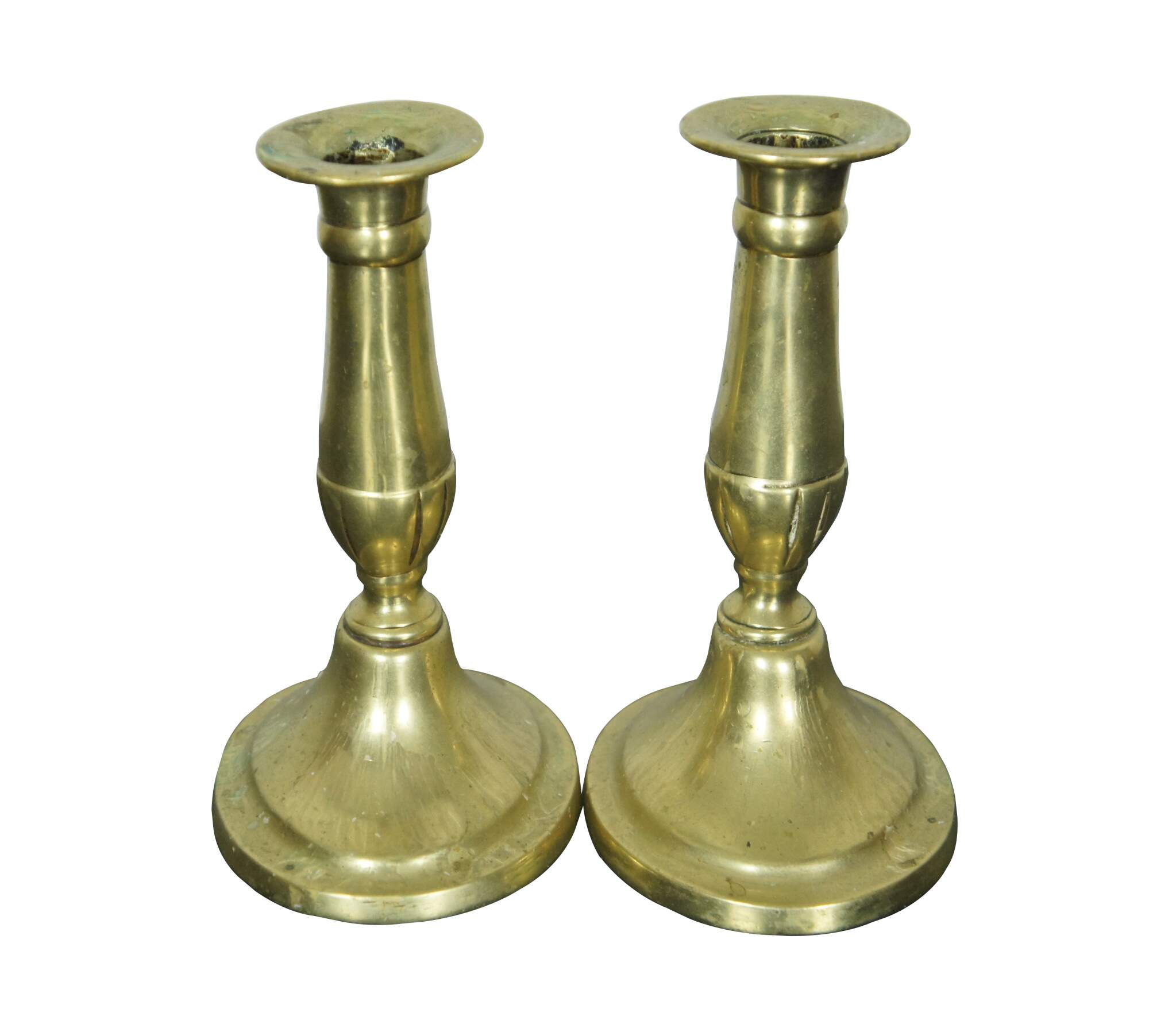 A lovely pair of Georgian style Candle Sticks. Features a squatty baluster shaped fluted towards the bottom over a inverted cup base.