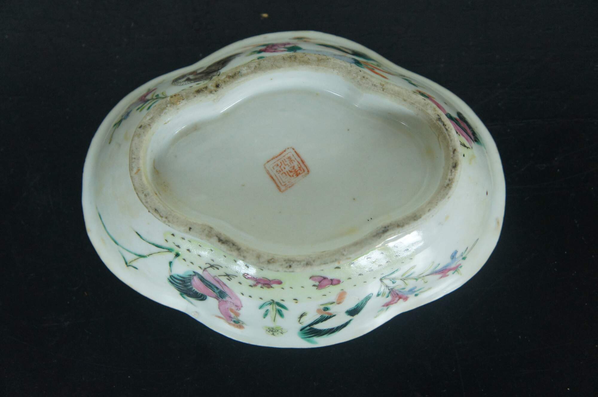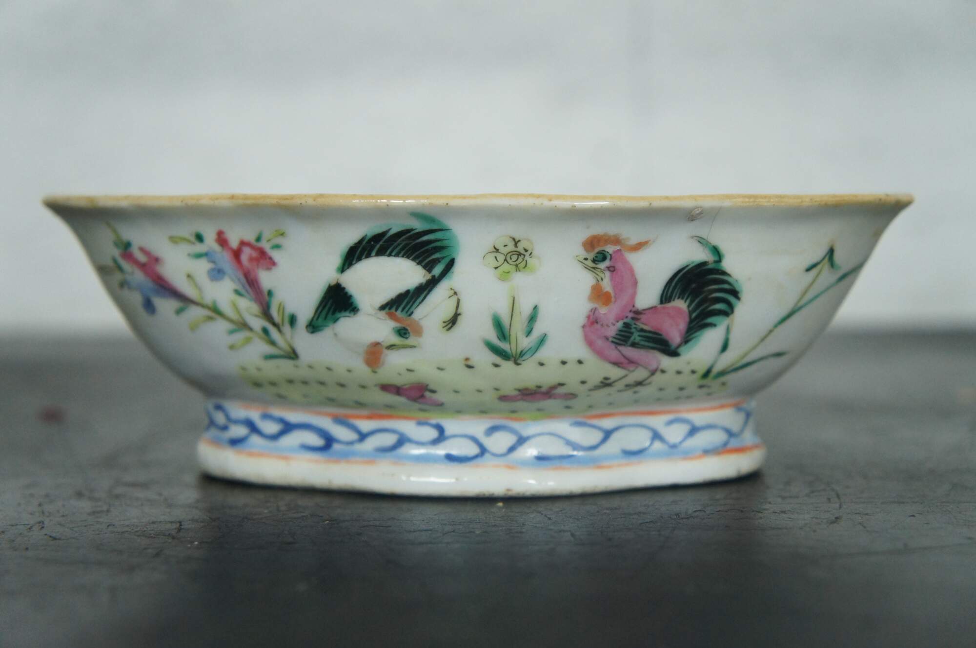 An impressive mid 19th century Chinese Export Bowl. Made from porcelain with polychrome rooster and hen design. Features a lobed / scalloped shape with footed base. The interior is features a koi fish design. Great for serving or display. Stamped along underside