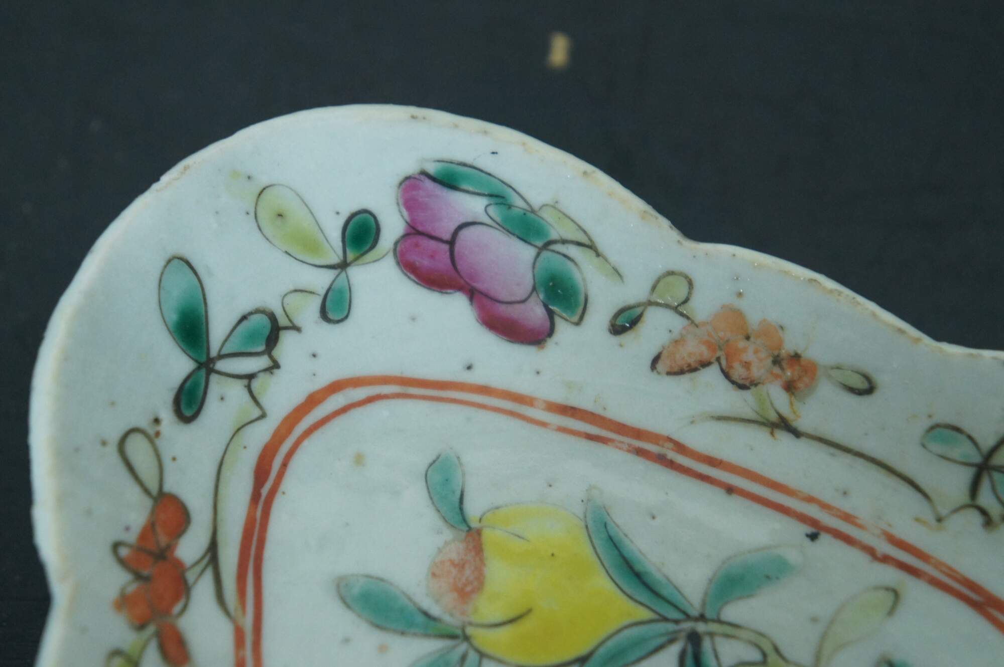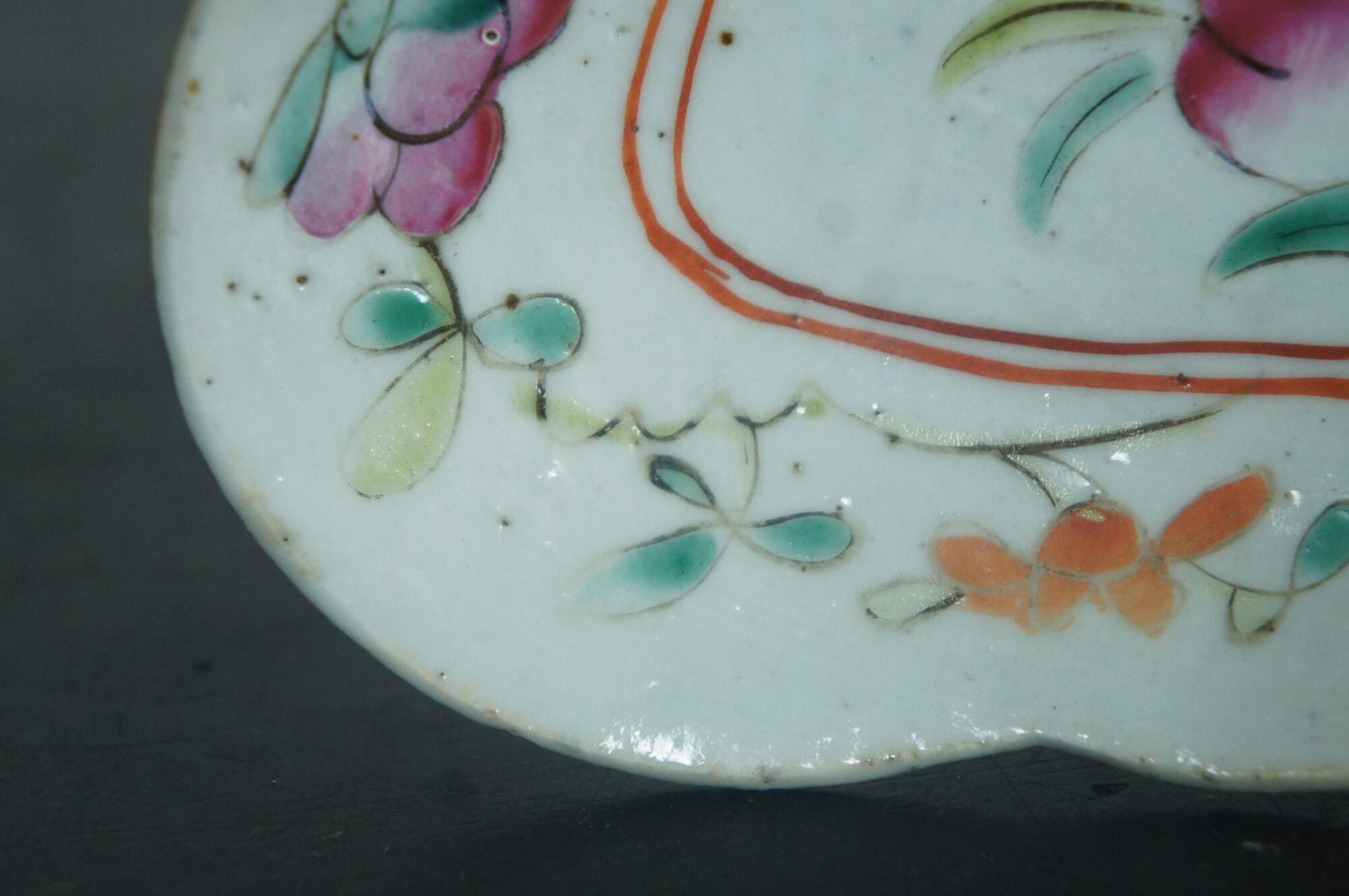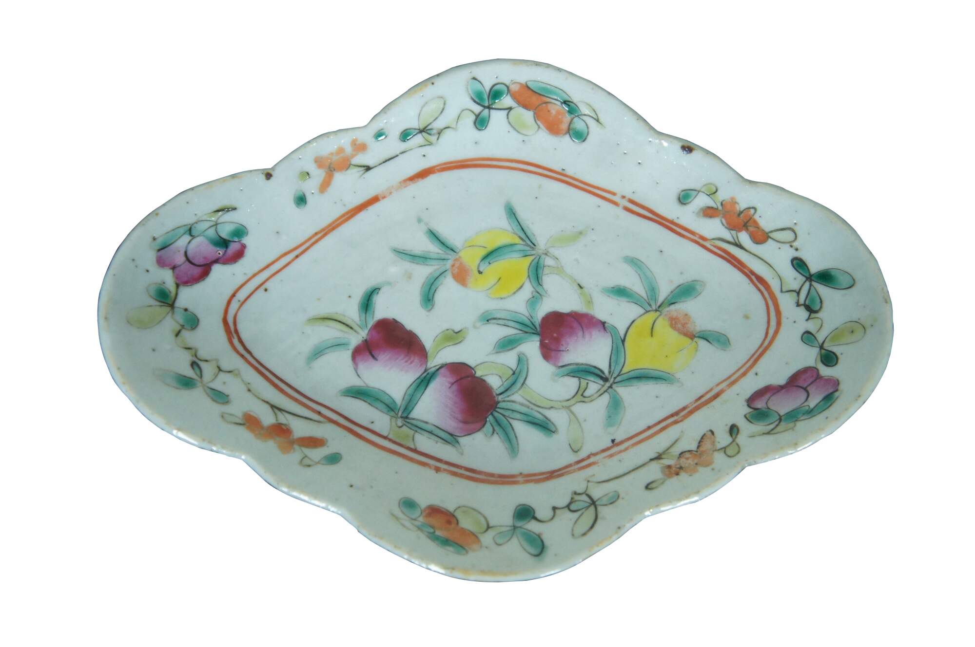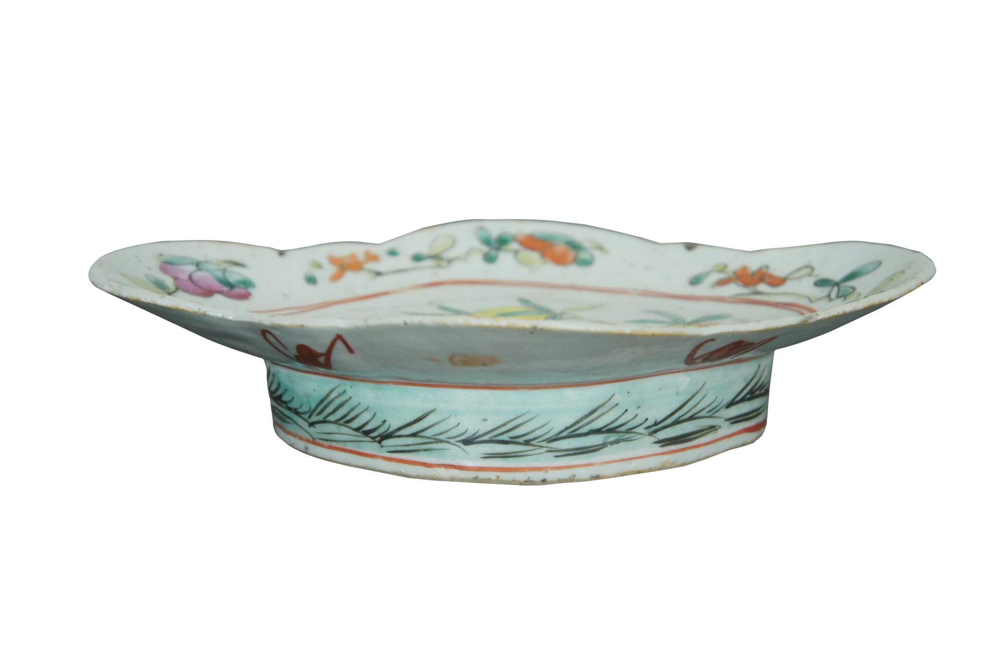 Antique early 20th century Chinese famille rose porcelain tazza / chop suey / footed altar dish with a scalloped oval edge, decorated with pink, orange and yellow flowers.