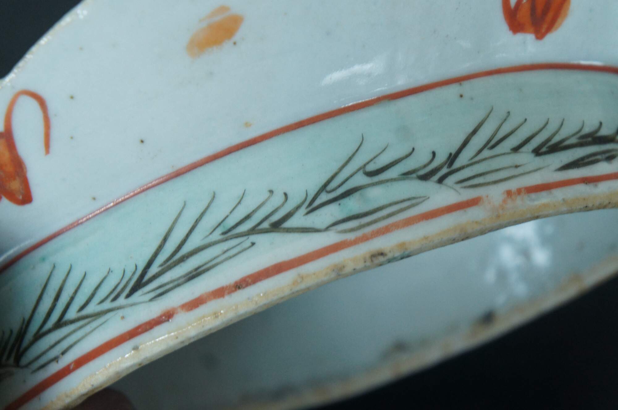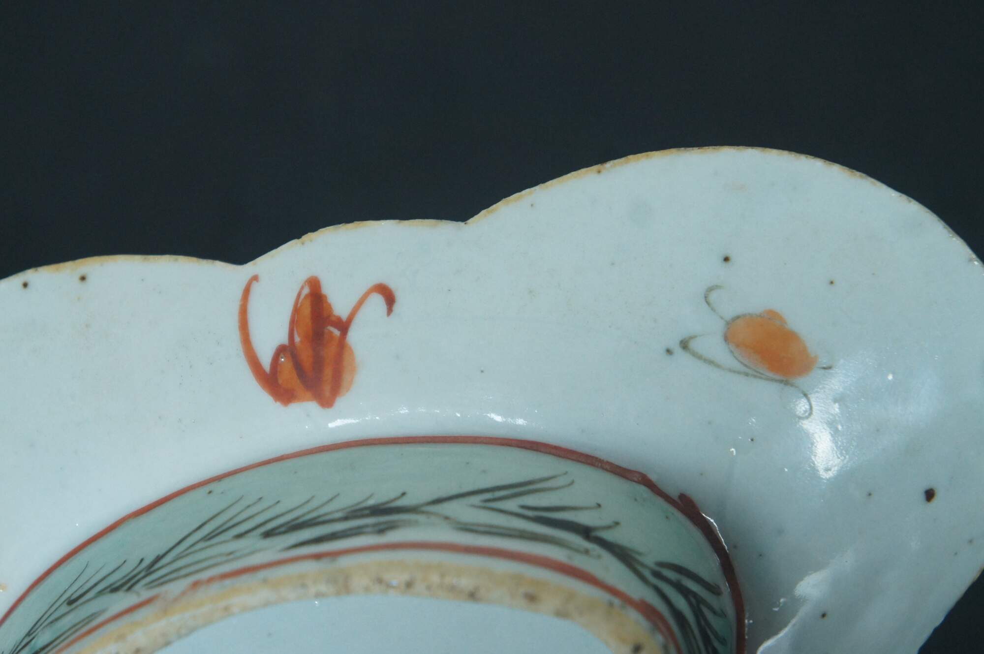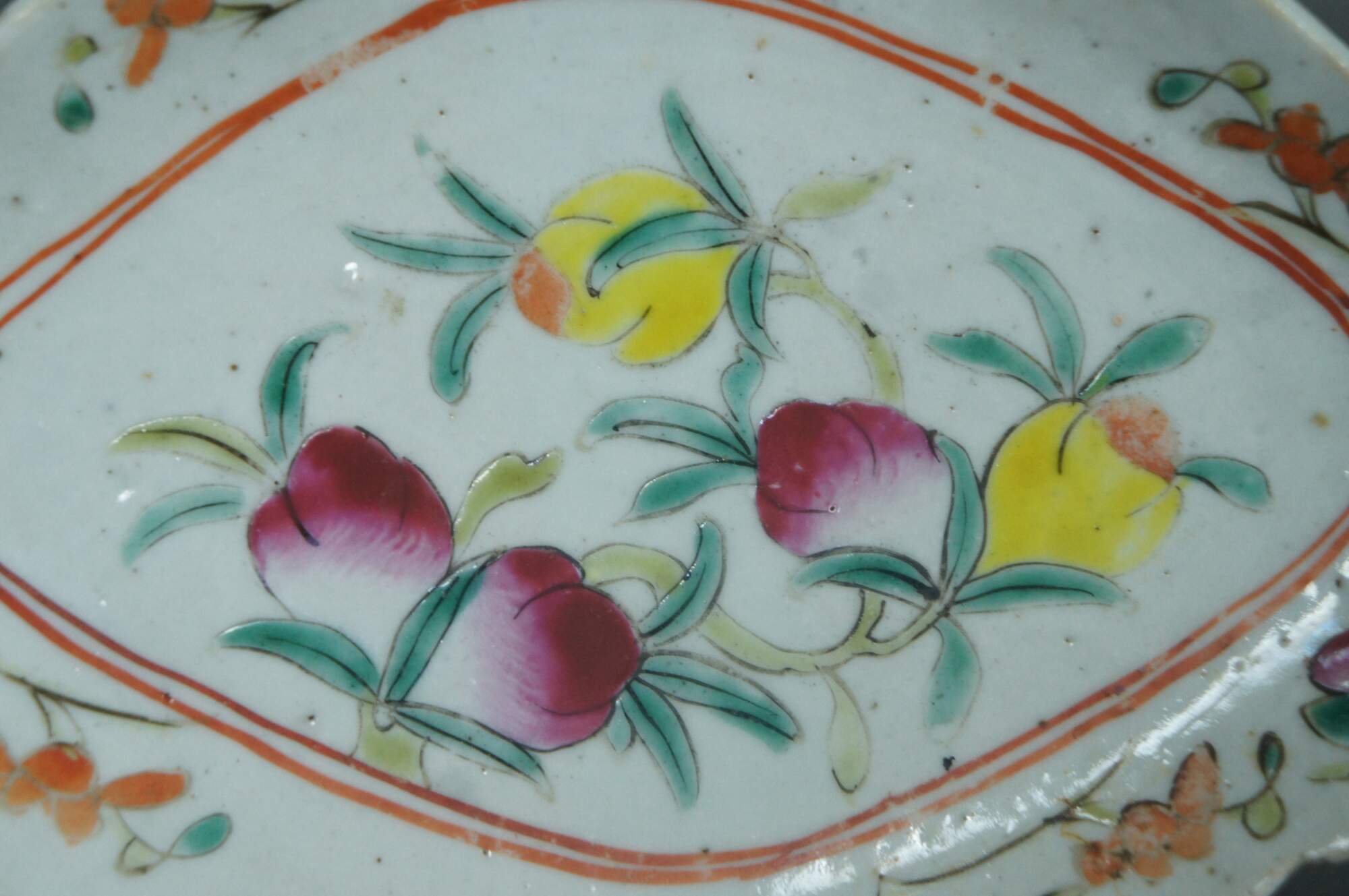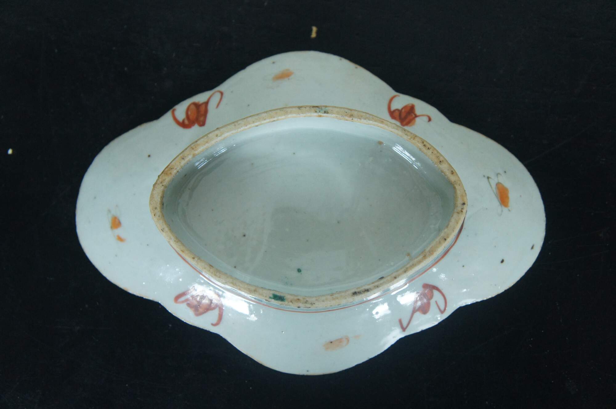Antique early 20th century Chinese famille rose porcelain tazza / chop suey / footed altar dish with a scalloped oval edge, decorated with pink, orange and yellow flowers.