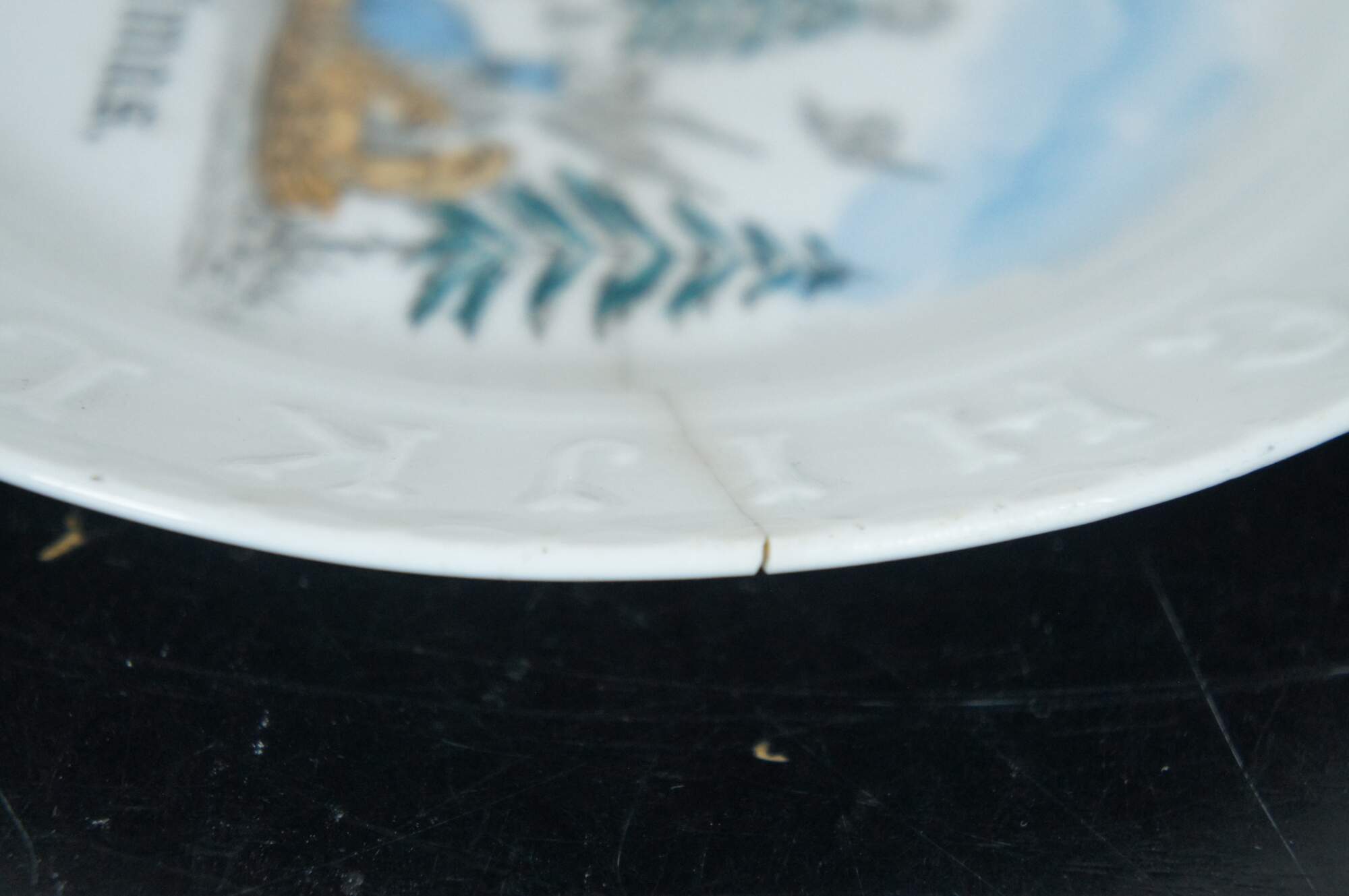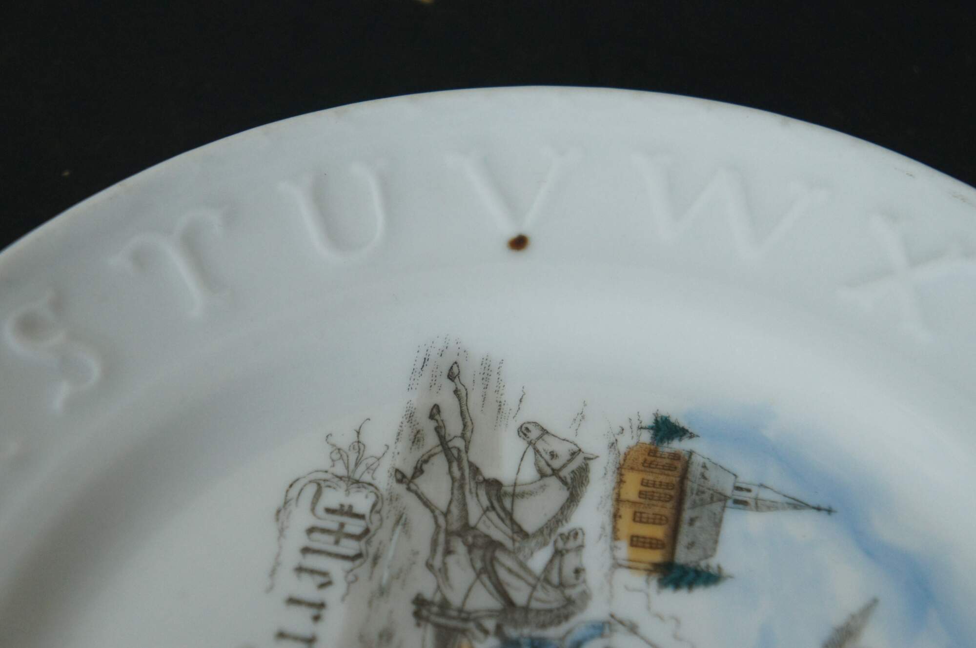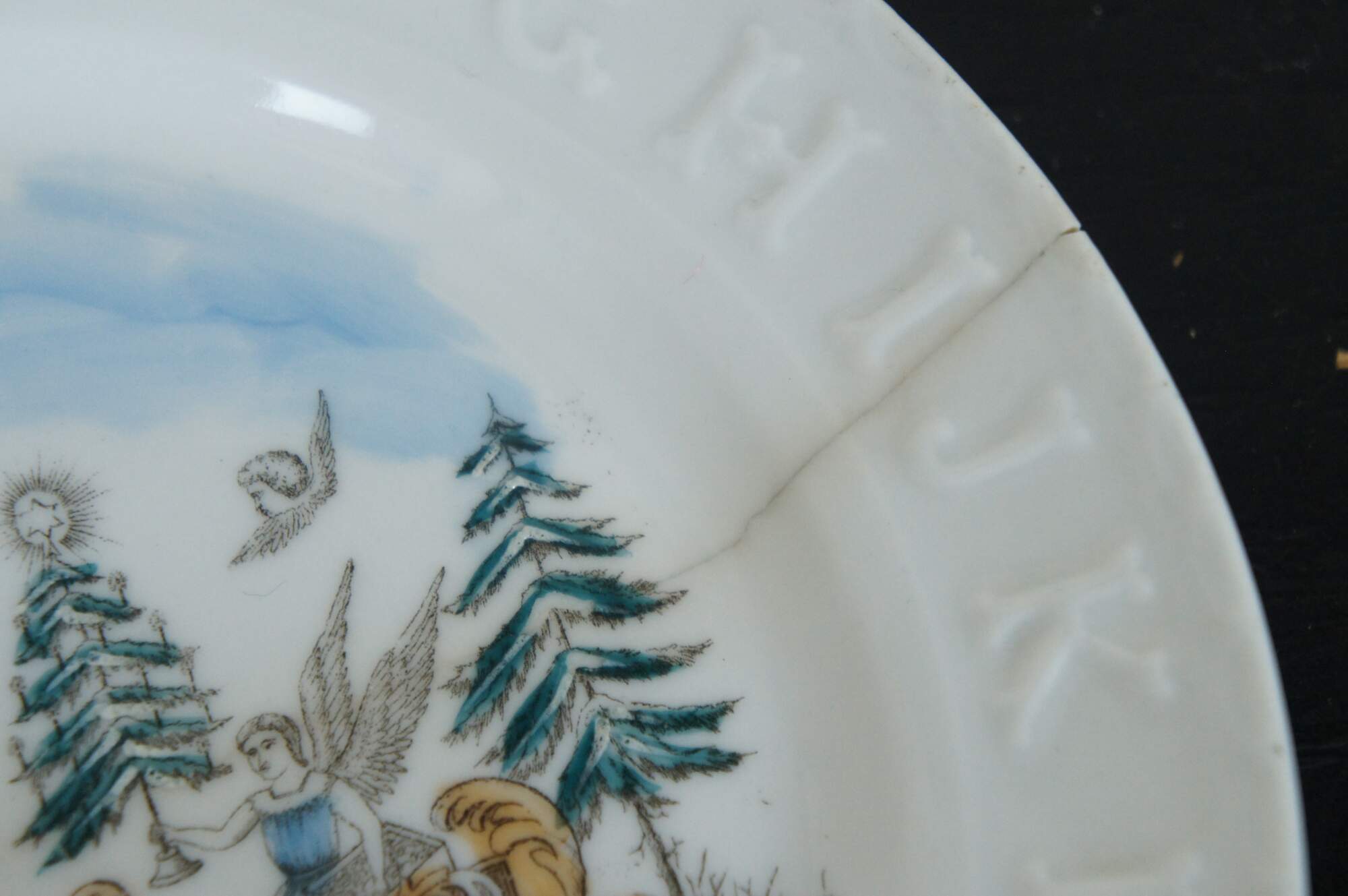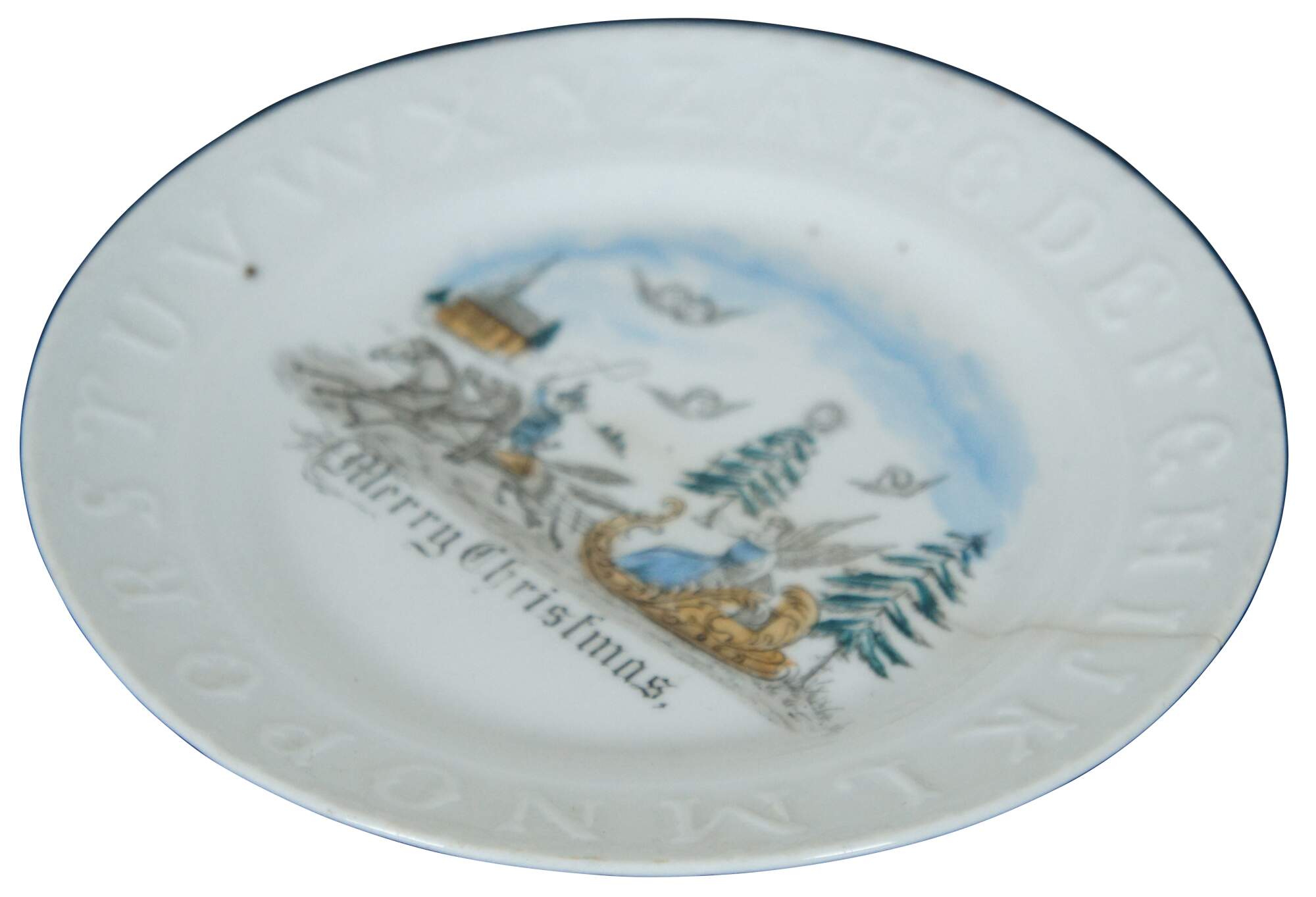 Antique Victorian porcelain child’s plate with the alphabet embossed around the rim, featuring a transferware winter scene of angels sleighing through a holiday landscape and the words Merry Christmas.