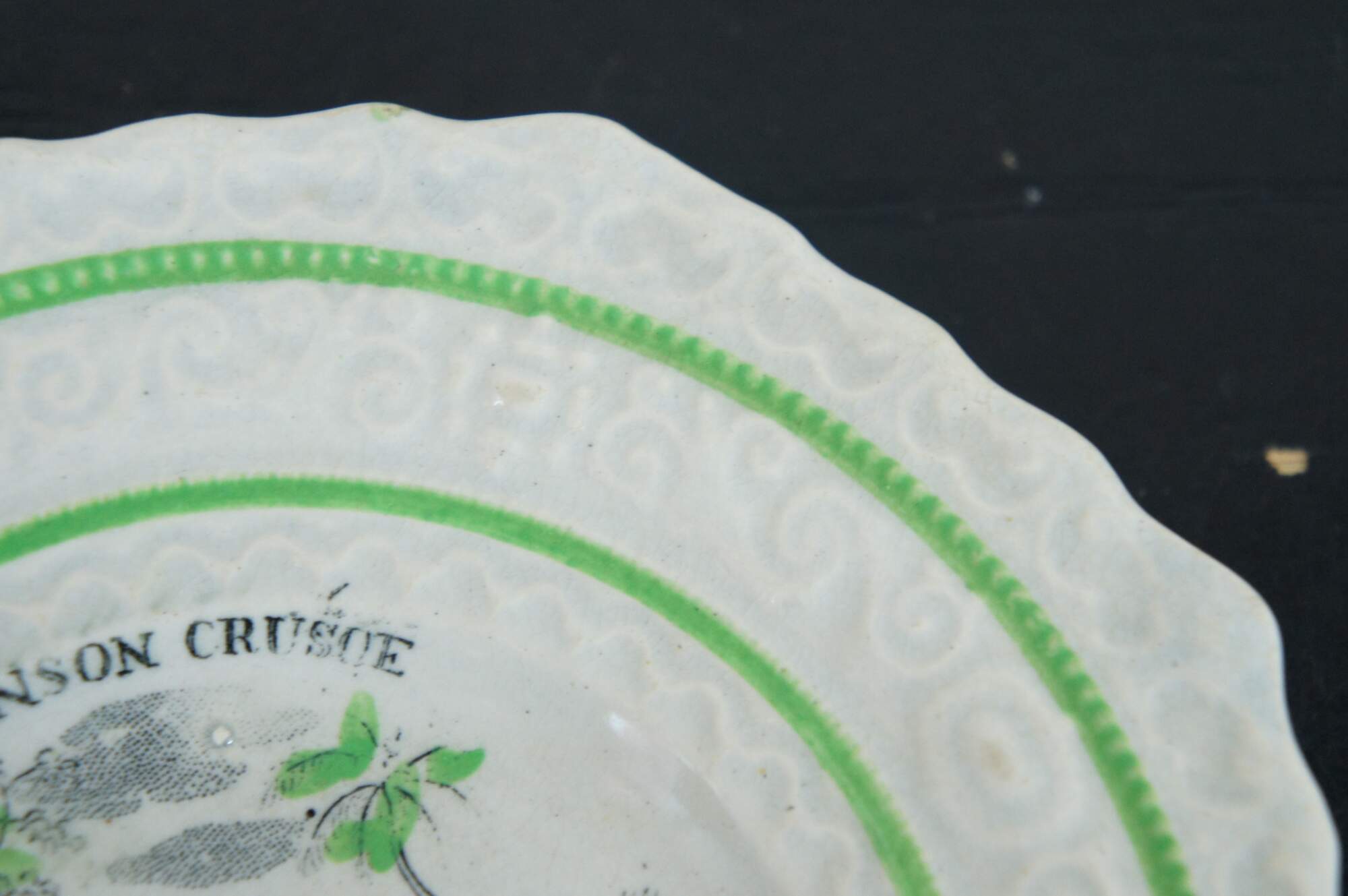 Antique Staffordshire transferware porcelain, eight sided child’s plate, embossed with a swirling design alternating with lime green rings and a scene of Robinson Crusoe seated in a flowering landscape.
