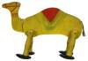 Antique wooden walking pull toy in the shape of a yellow walking camel with red details, made by Hustler Toy Corporation of Sterling Illinois USA.