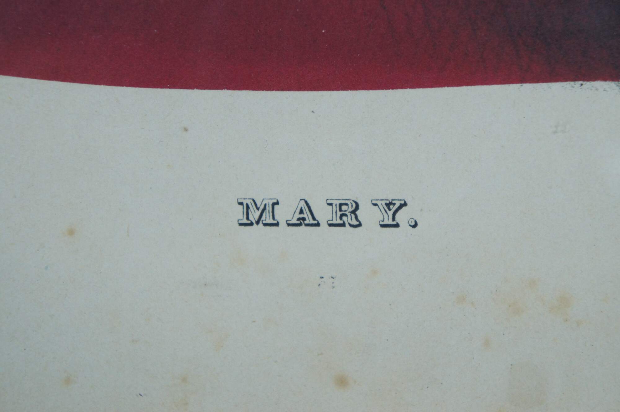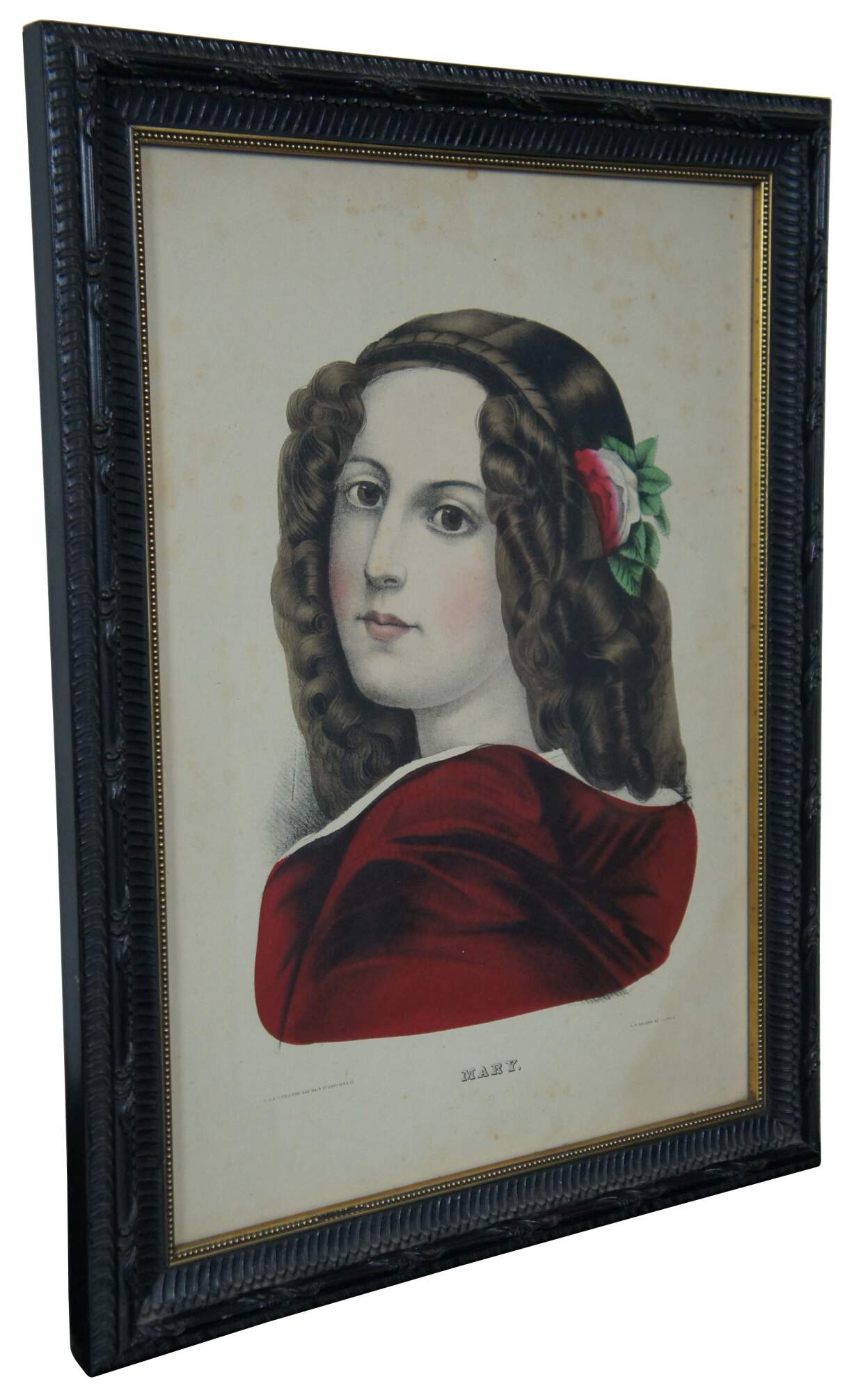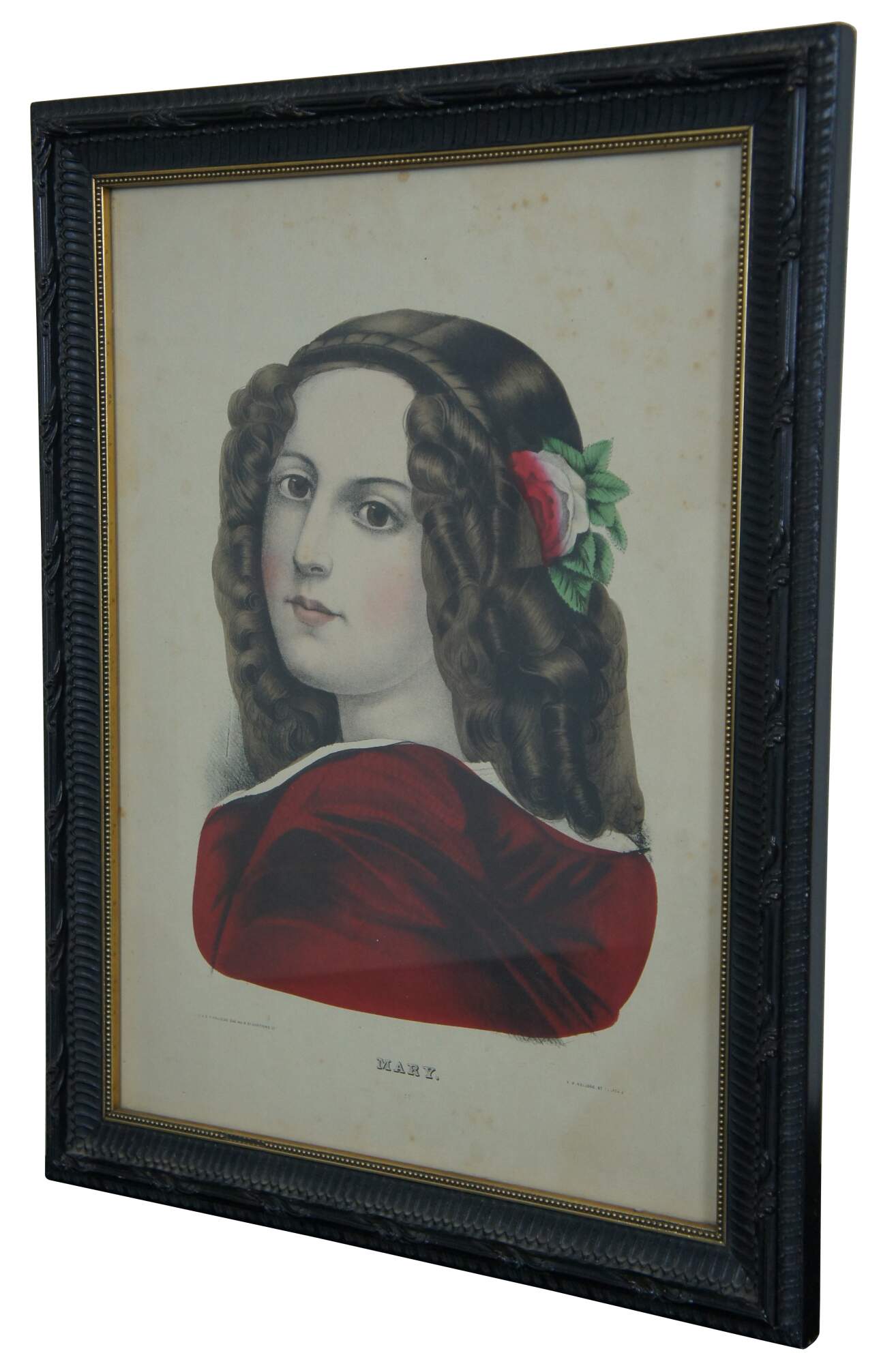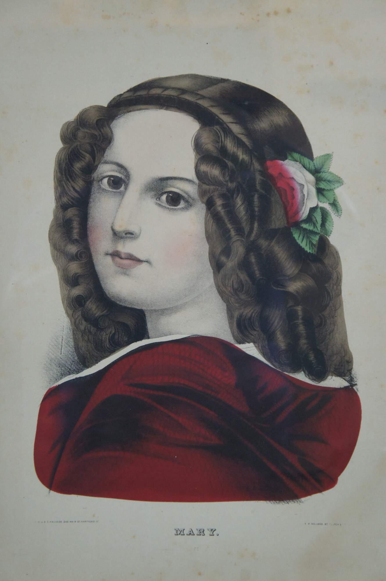 Antique 19th century hand colored lithograph print by E.B.E.C. Kellogg and F.P. Kellogg, titled “Mary,” showing a young woman wearing a red dress and a red and white rose in her brown hair. “The Kellogg brothers were Hartford's most important 19th-century print-publishing firm. Between about 1830 and 1880, they produced thousands of brightly colored popular prints for use in homes and businesses throughout the United States.